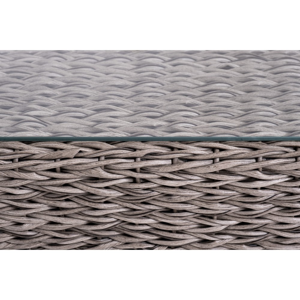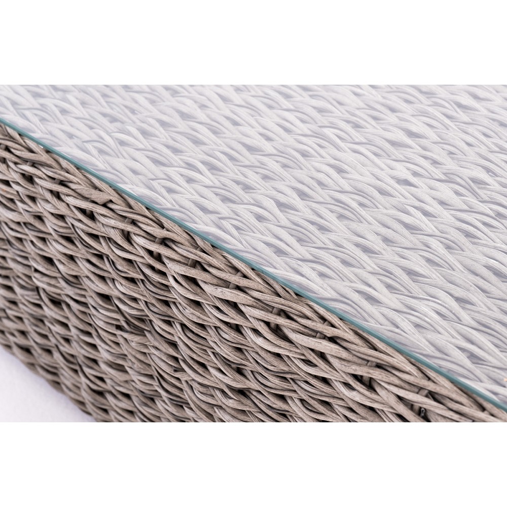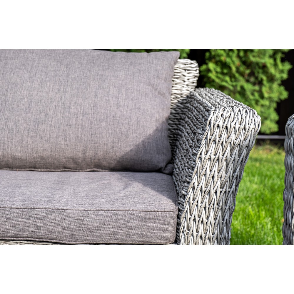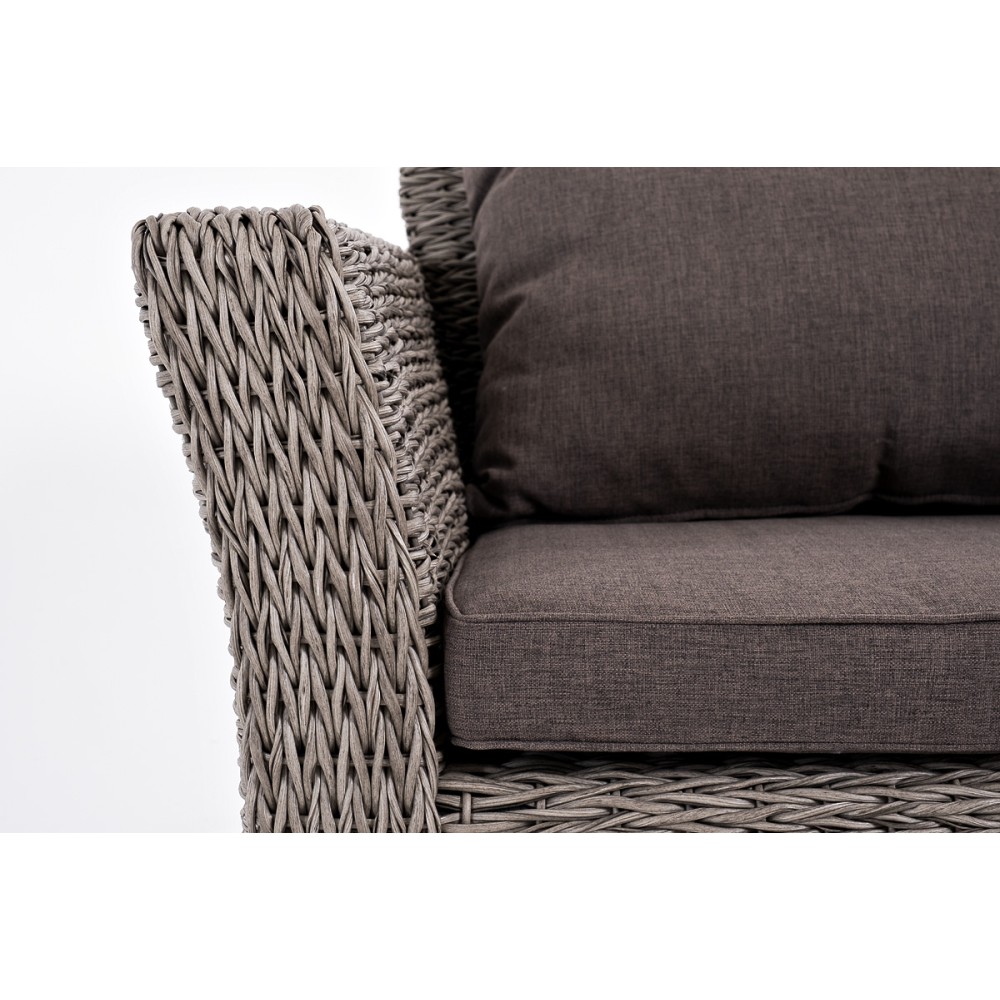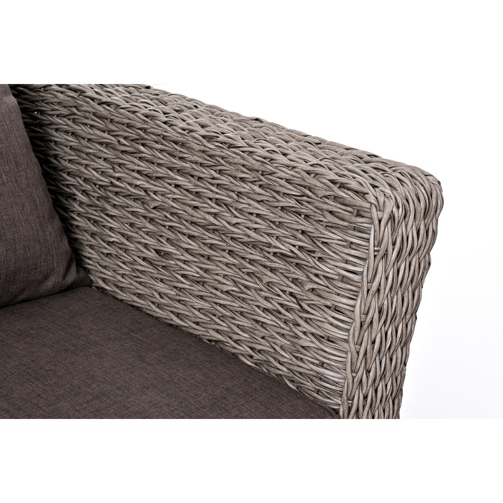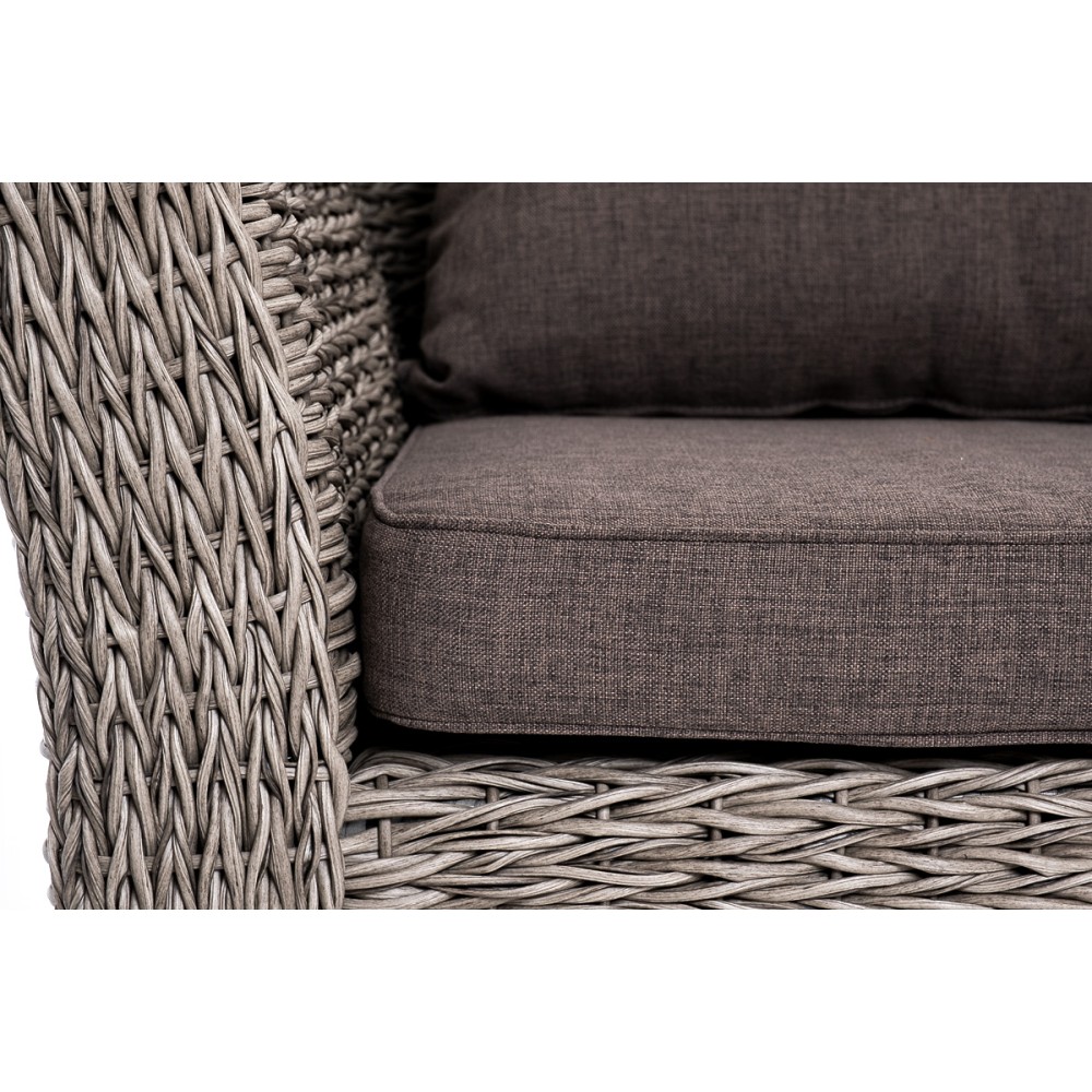 Прочный алюминиевый каркас усиливает устойчивость мебели. Его дополняет плетение в сером цвете, которое представлено из искусственного ротанга вида "гиацинт".