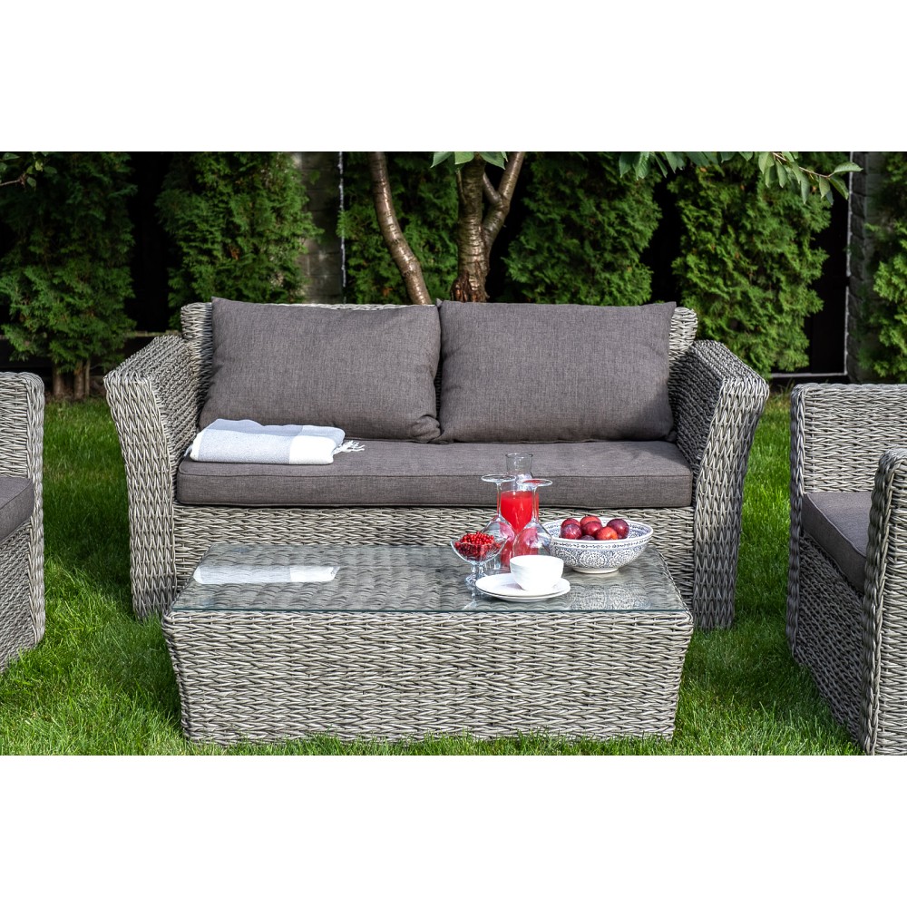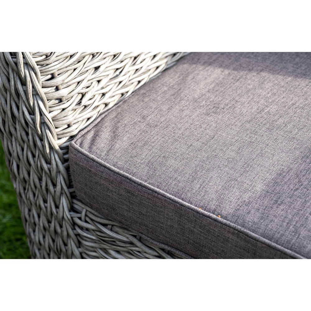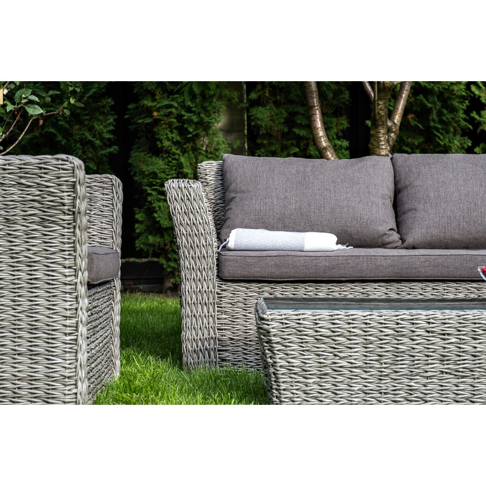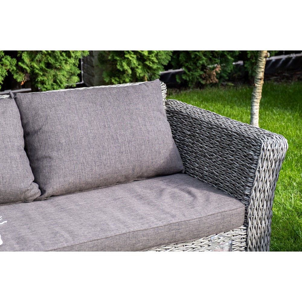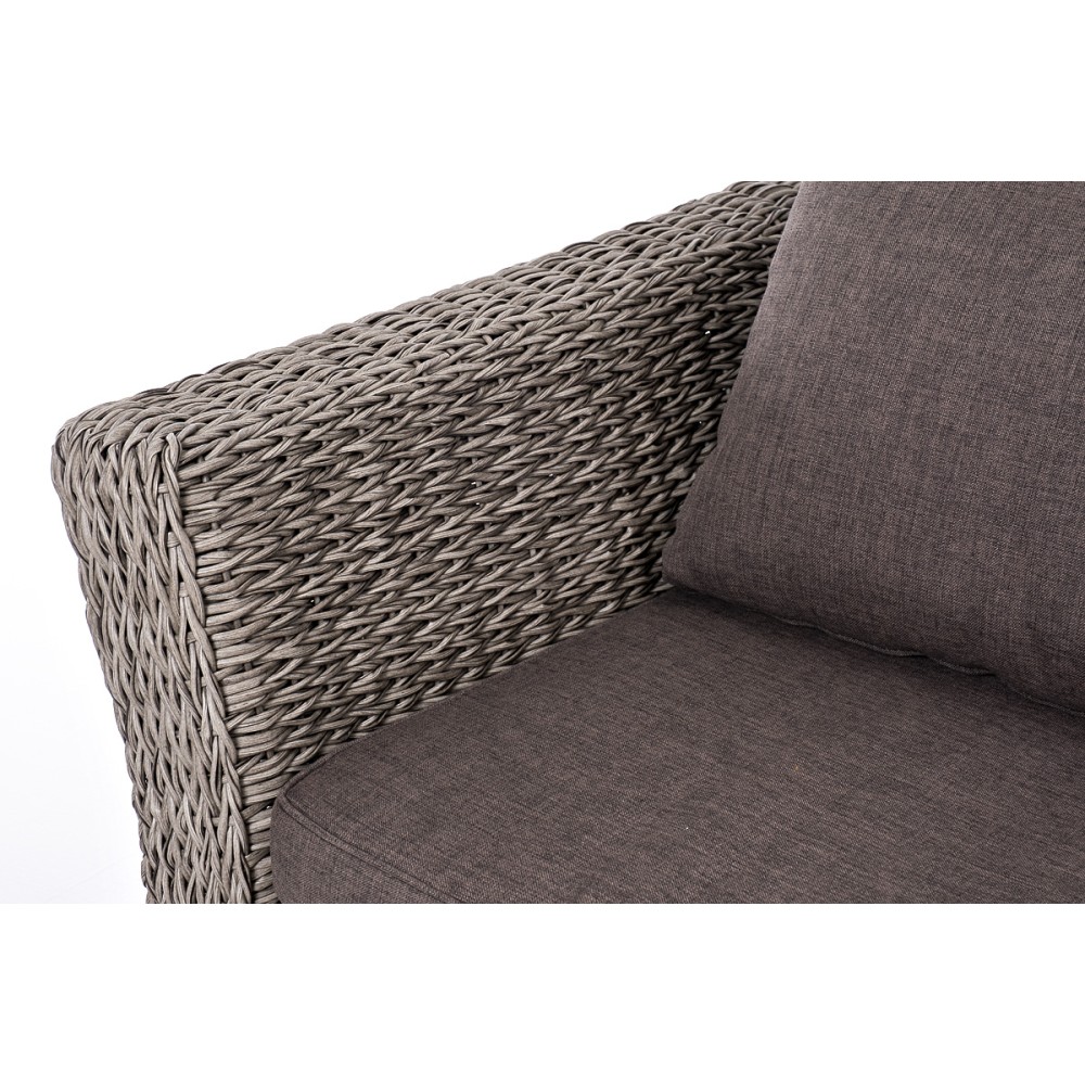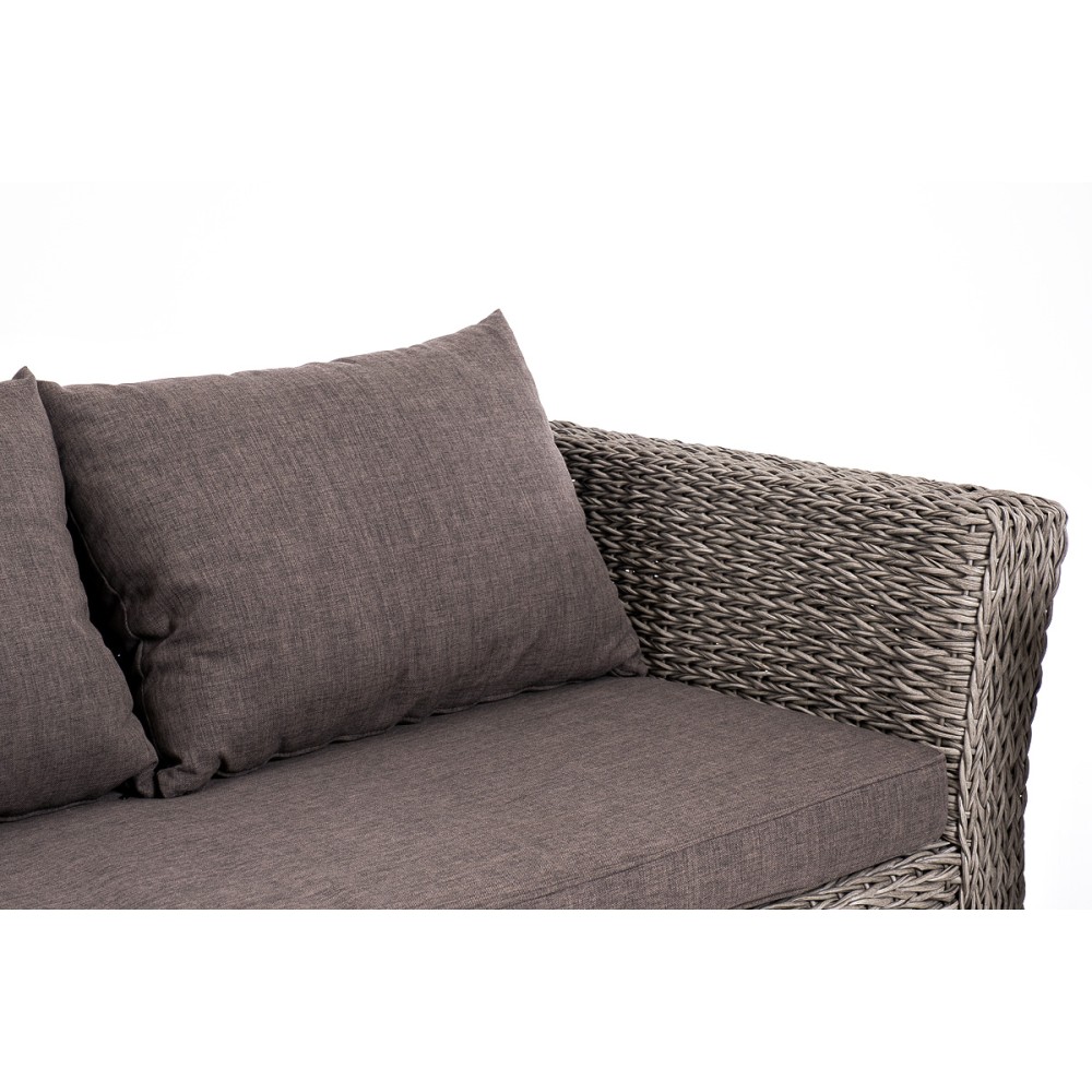 Прочный алюминиевый каркас усиливает устойчивость мебели. Его дополняет плетение в сером цвете, которое представлено из искусственного ротанга вида "гиацинт".