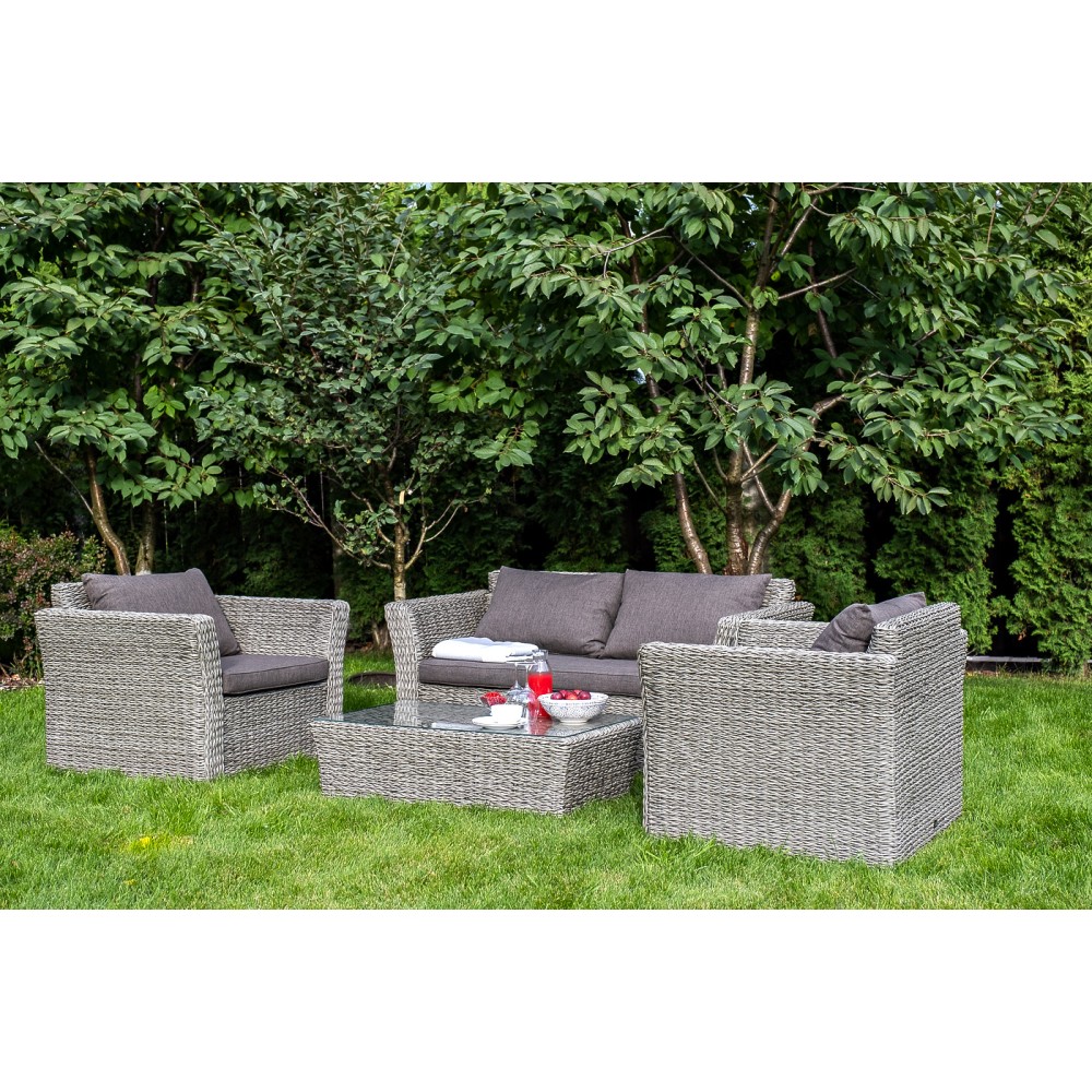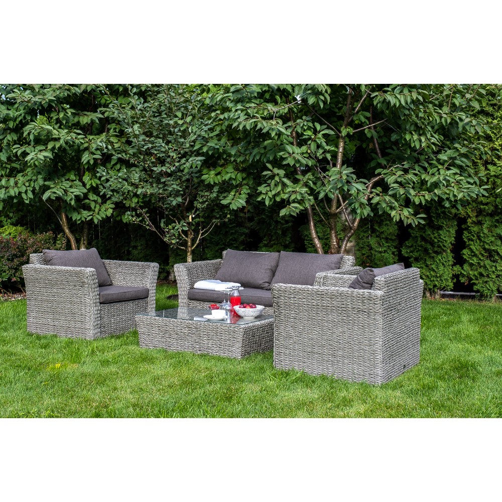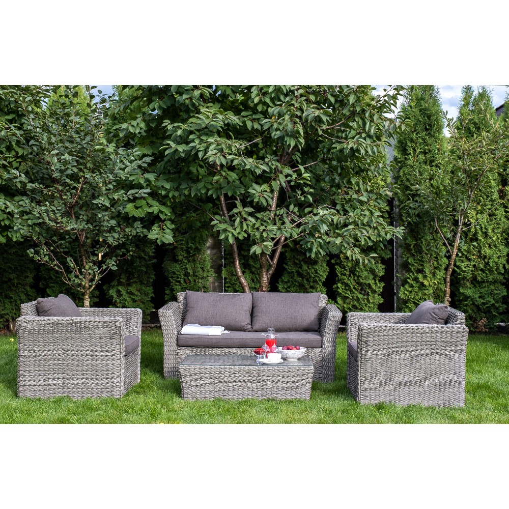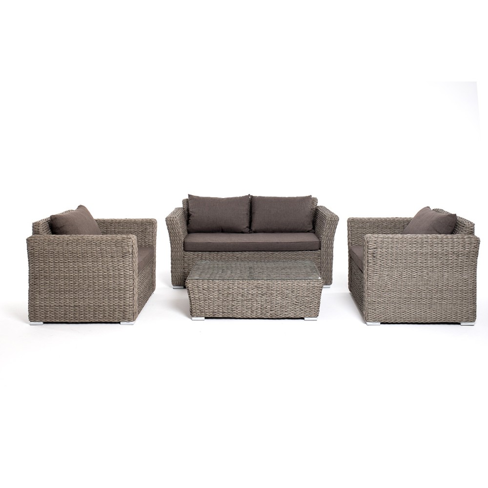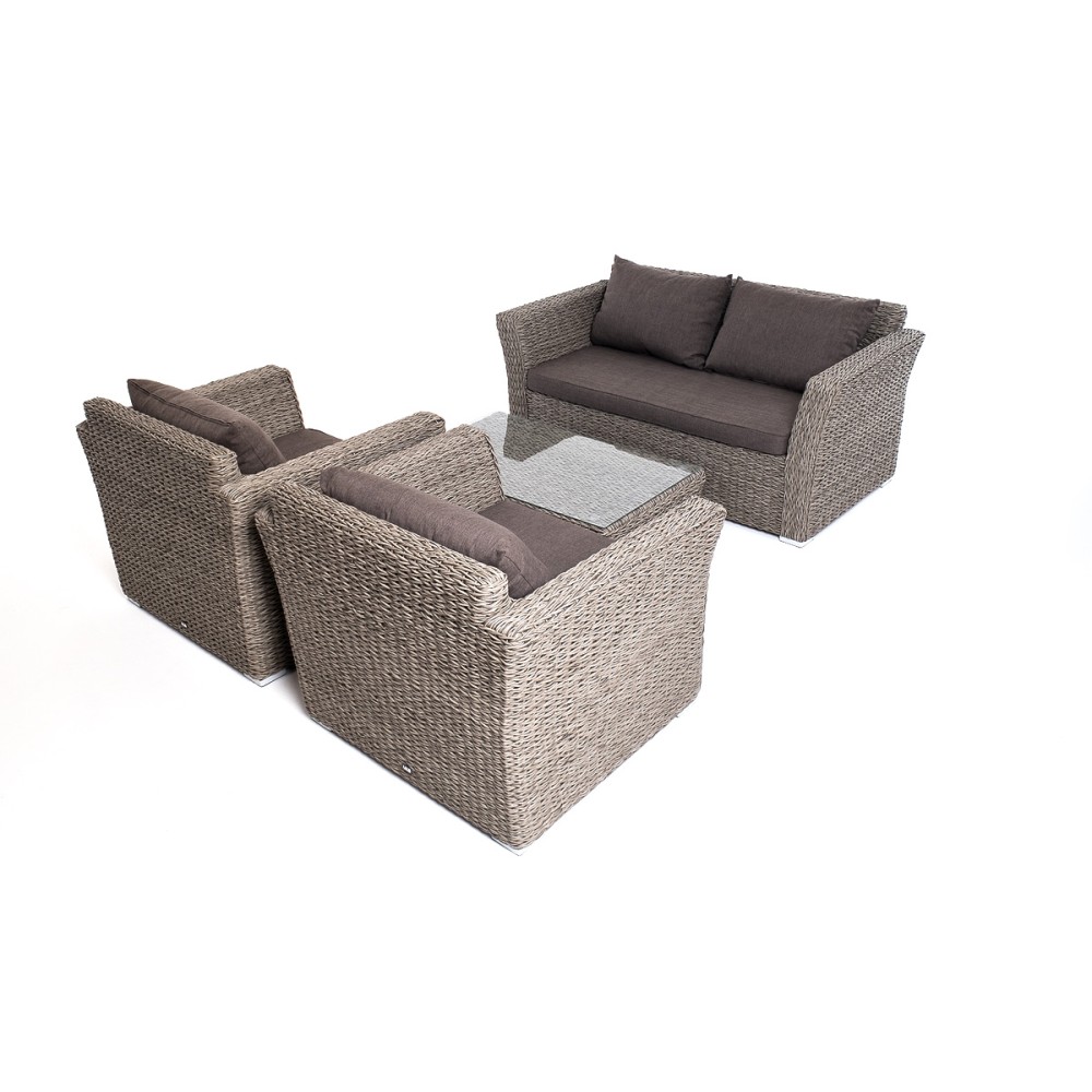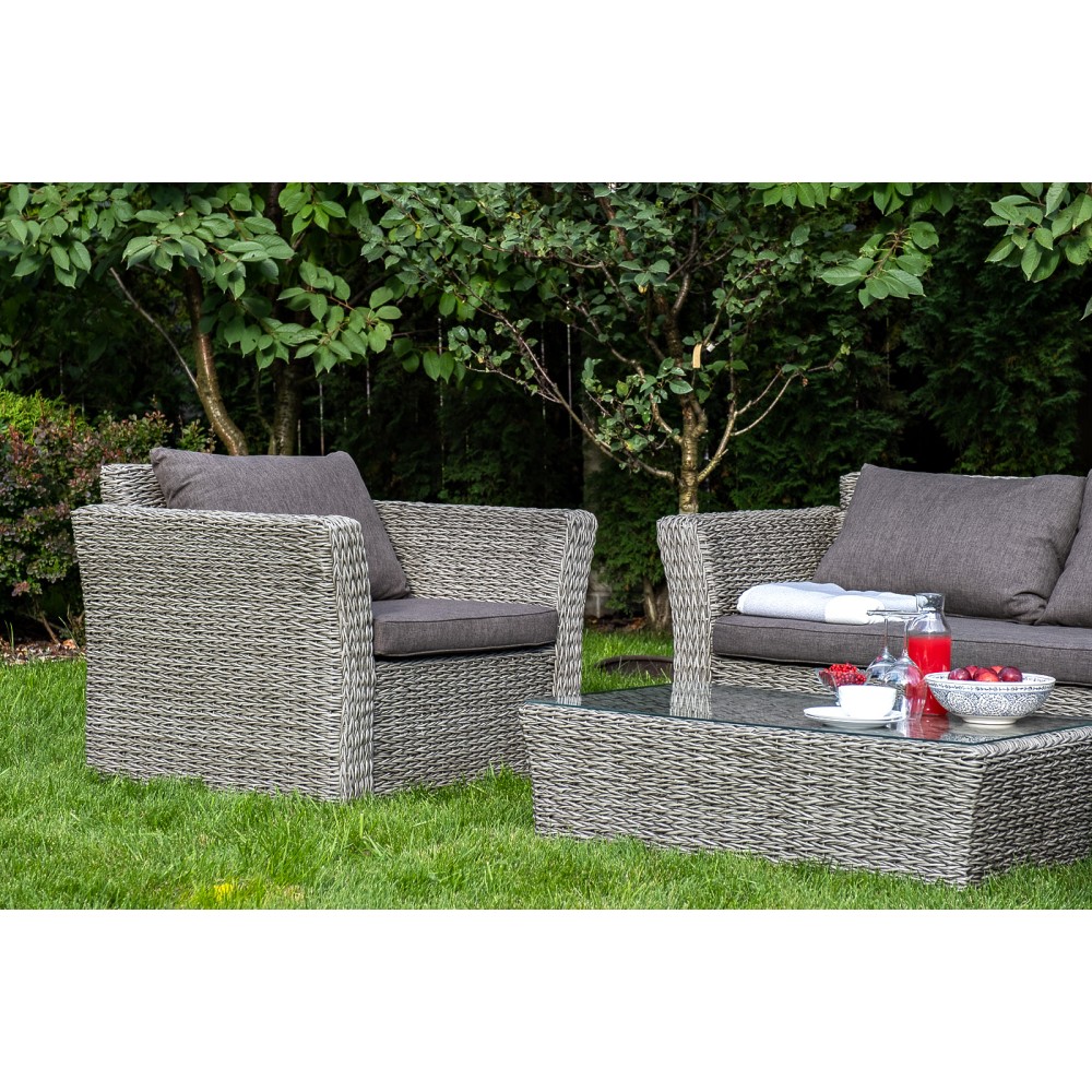 Прочный алюминиевый каркас усиливает устойчивость мебели. Его дополняет плетение в сером цвете, которое представлено из искусственного ротанга вида "гиацинт".