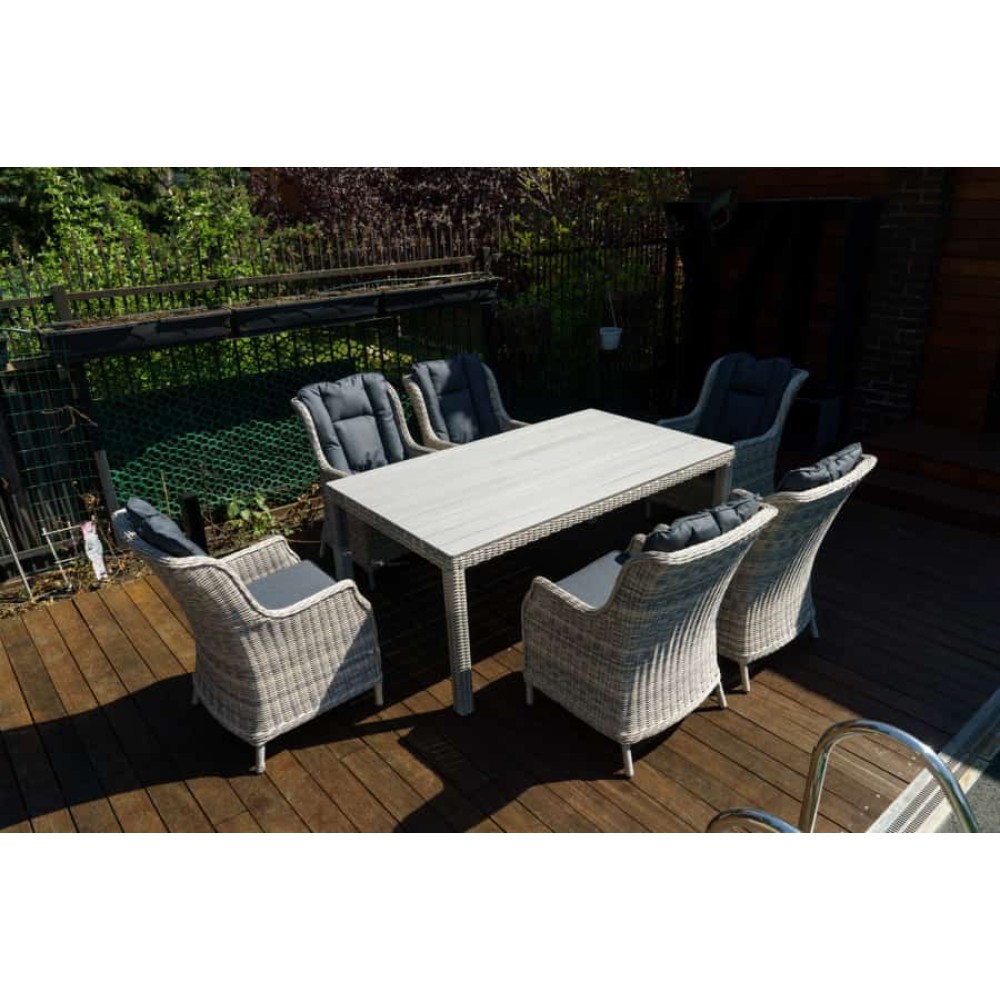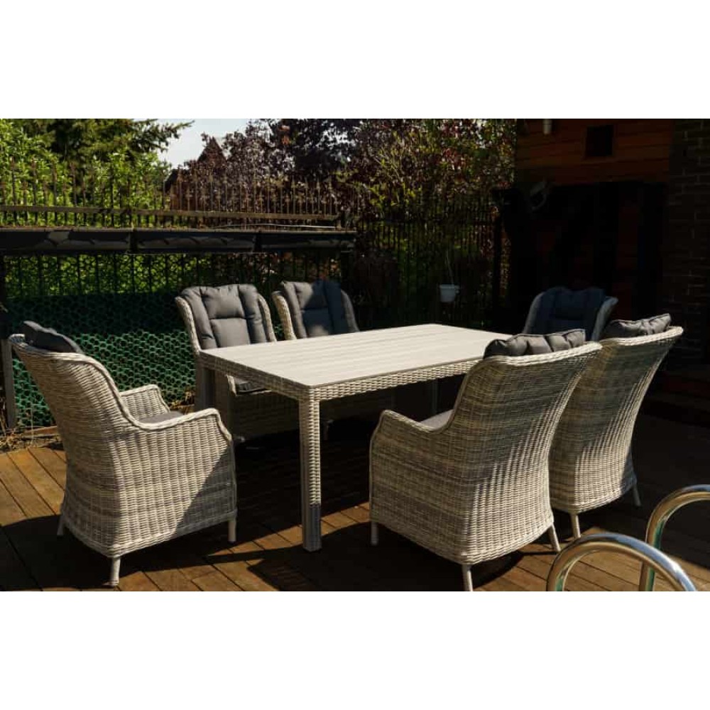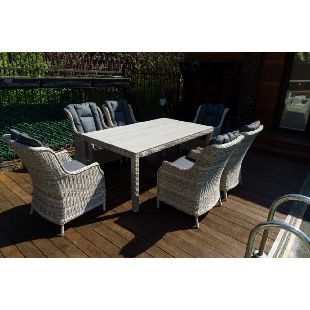 - Комплектация: 1 шт. — стол, 6 шт. — кресел с подлокотниками и подушками.
