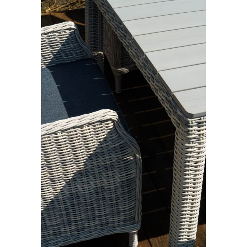- Материал стола: столешница — поливуд (искусственное дерево); каркас — искусственный ротанг/алюминий