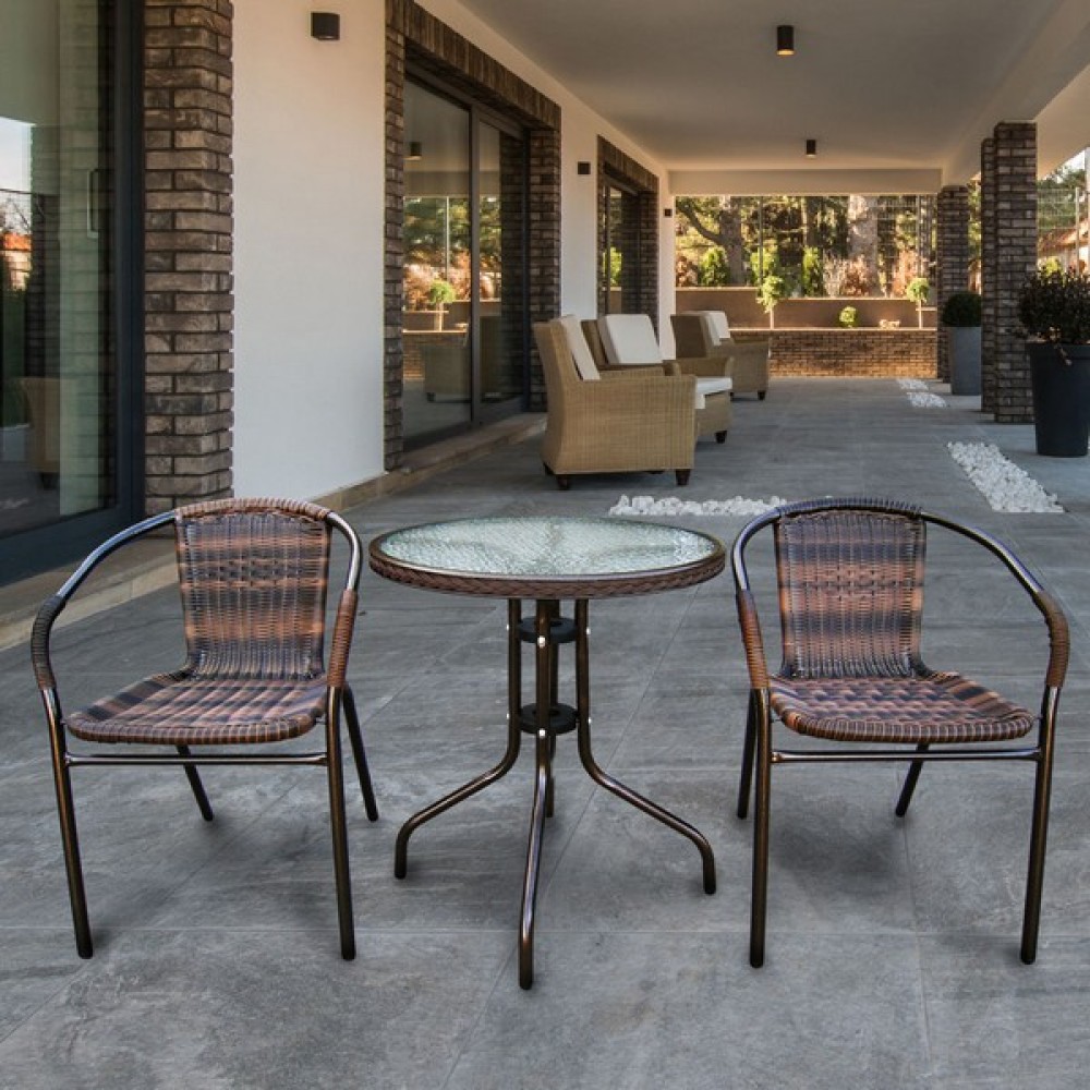 Стол: D60xH70 см. Стекло: закаленное- 5 мм. Труба: сталь D25 с полимерным покрытием. Столешница по периметру искусственный ротанг. Стул: W54хD58xH74 см. Каркас: труба сталь D25.Материал: искусственный ротанг. Цвет:орех(В) Объем и вес комплекта: 0,32м3,13,8кг.
