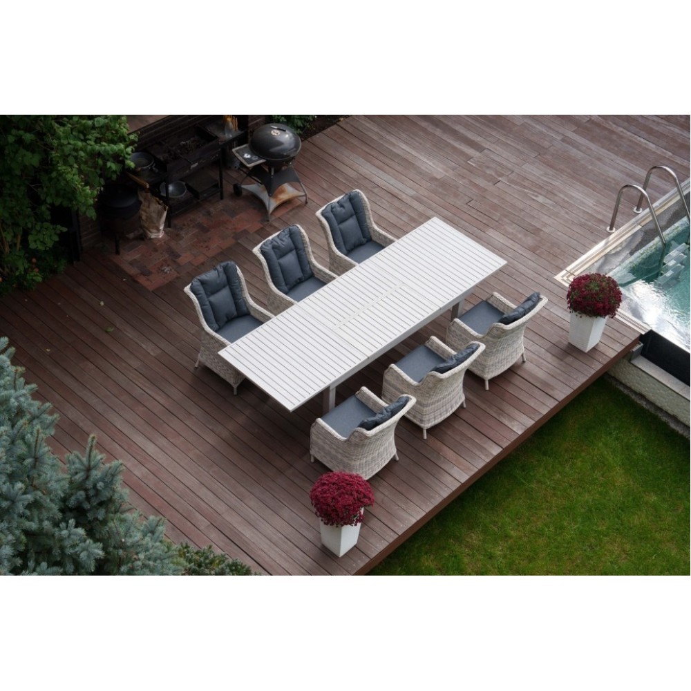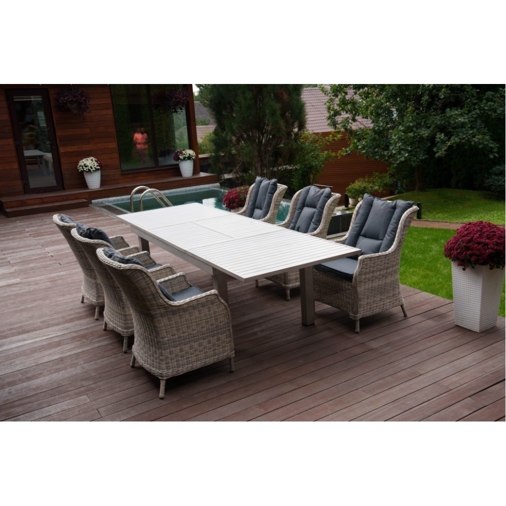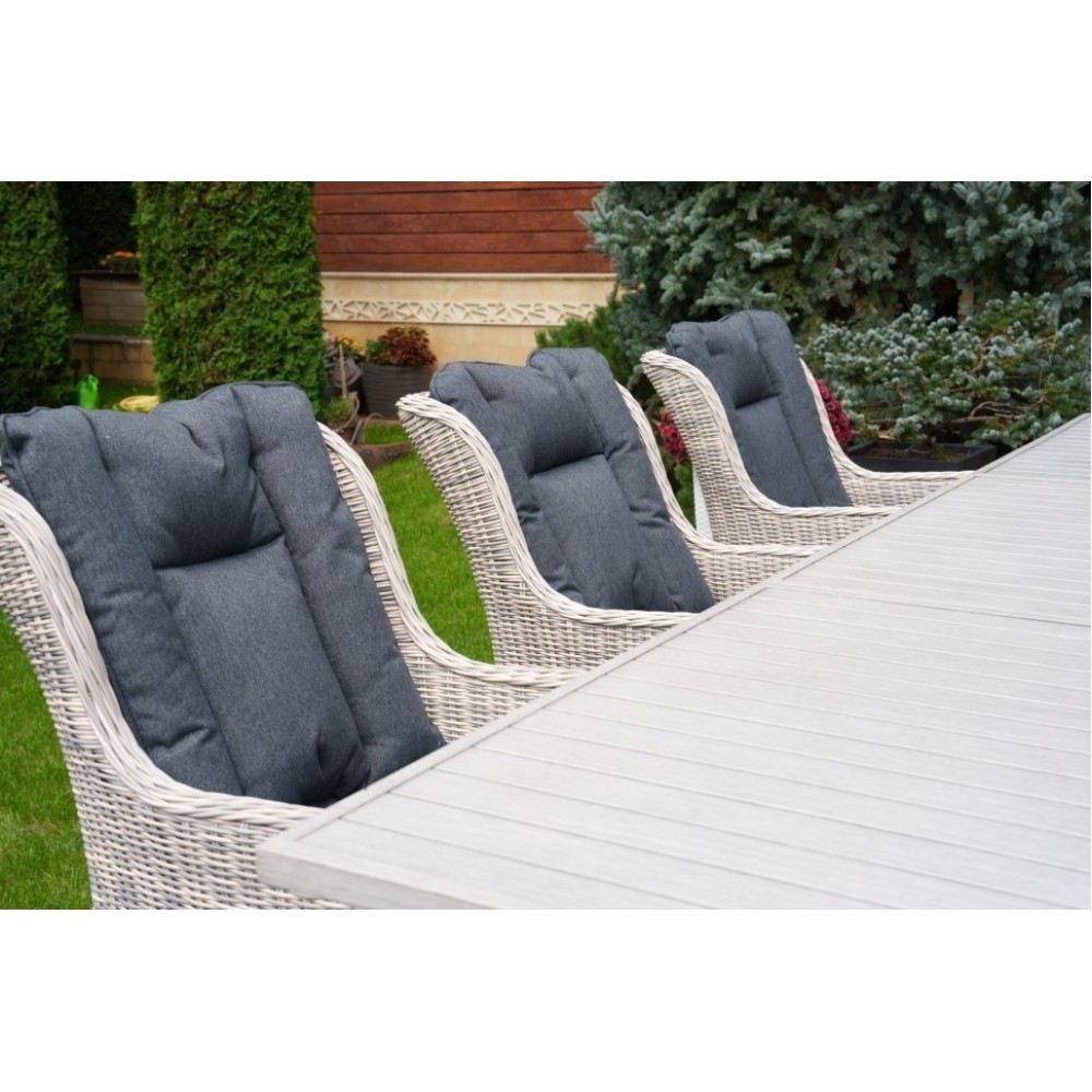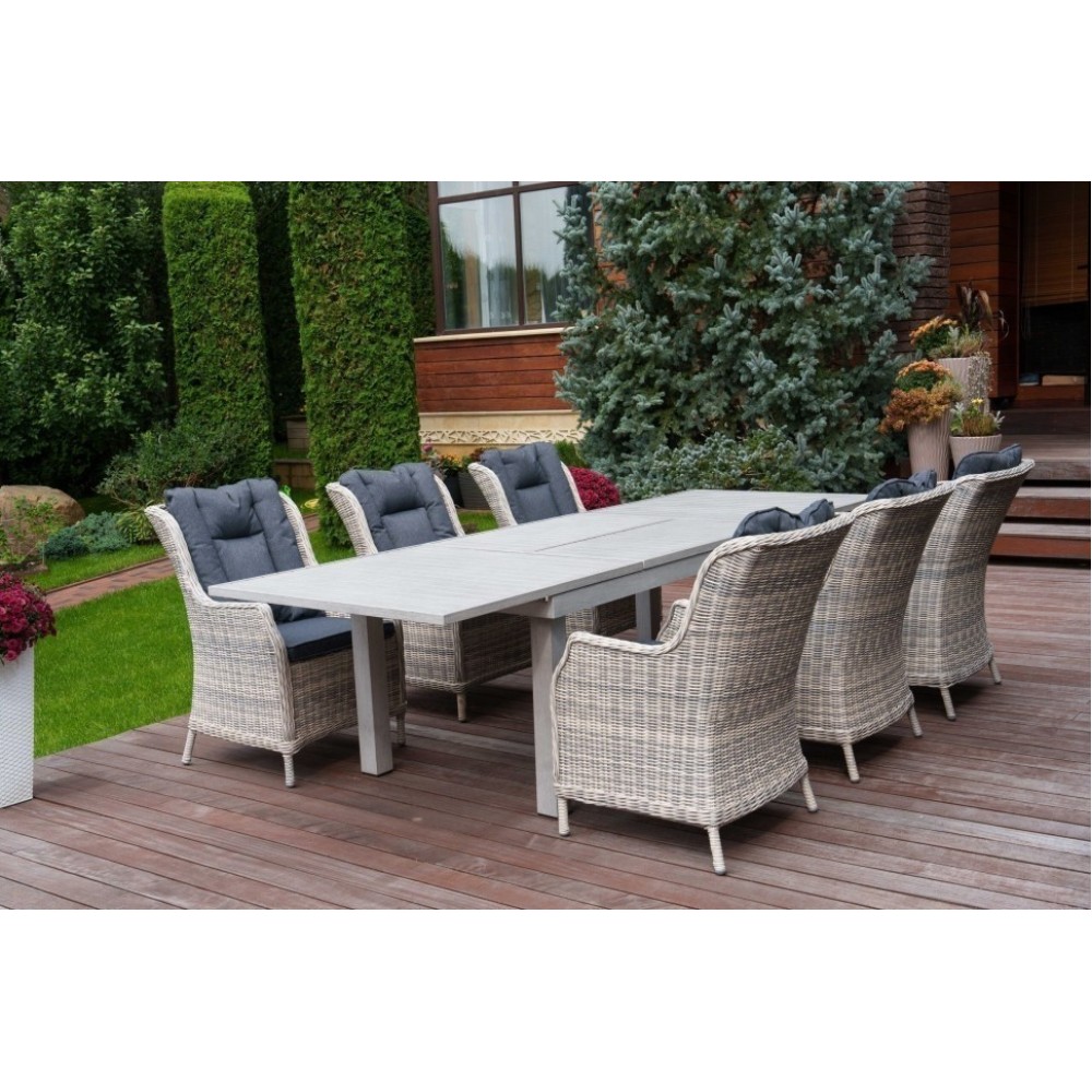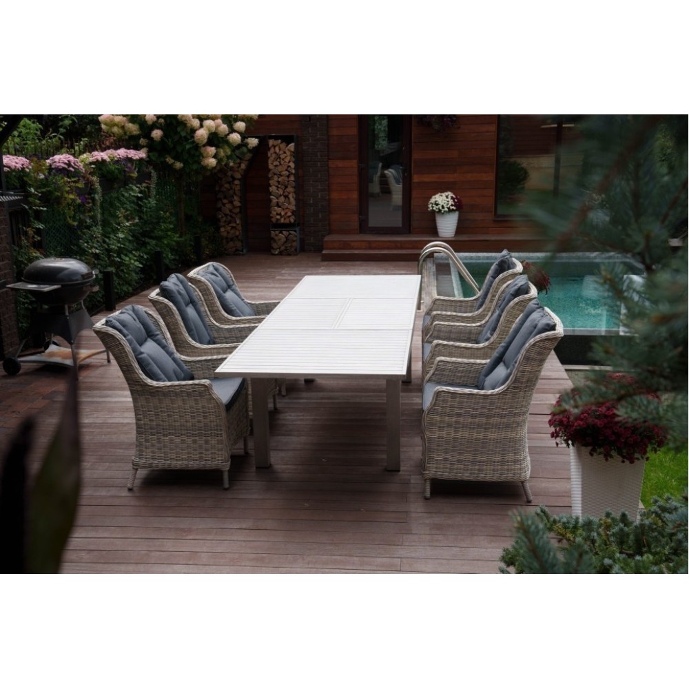 - Комплектация: 1шт — стол, 6шт — кресел с подлокотниками и подушками