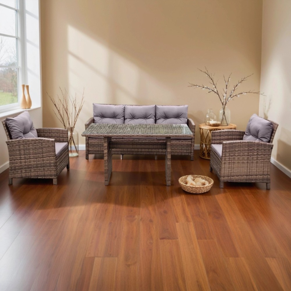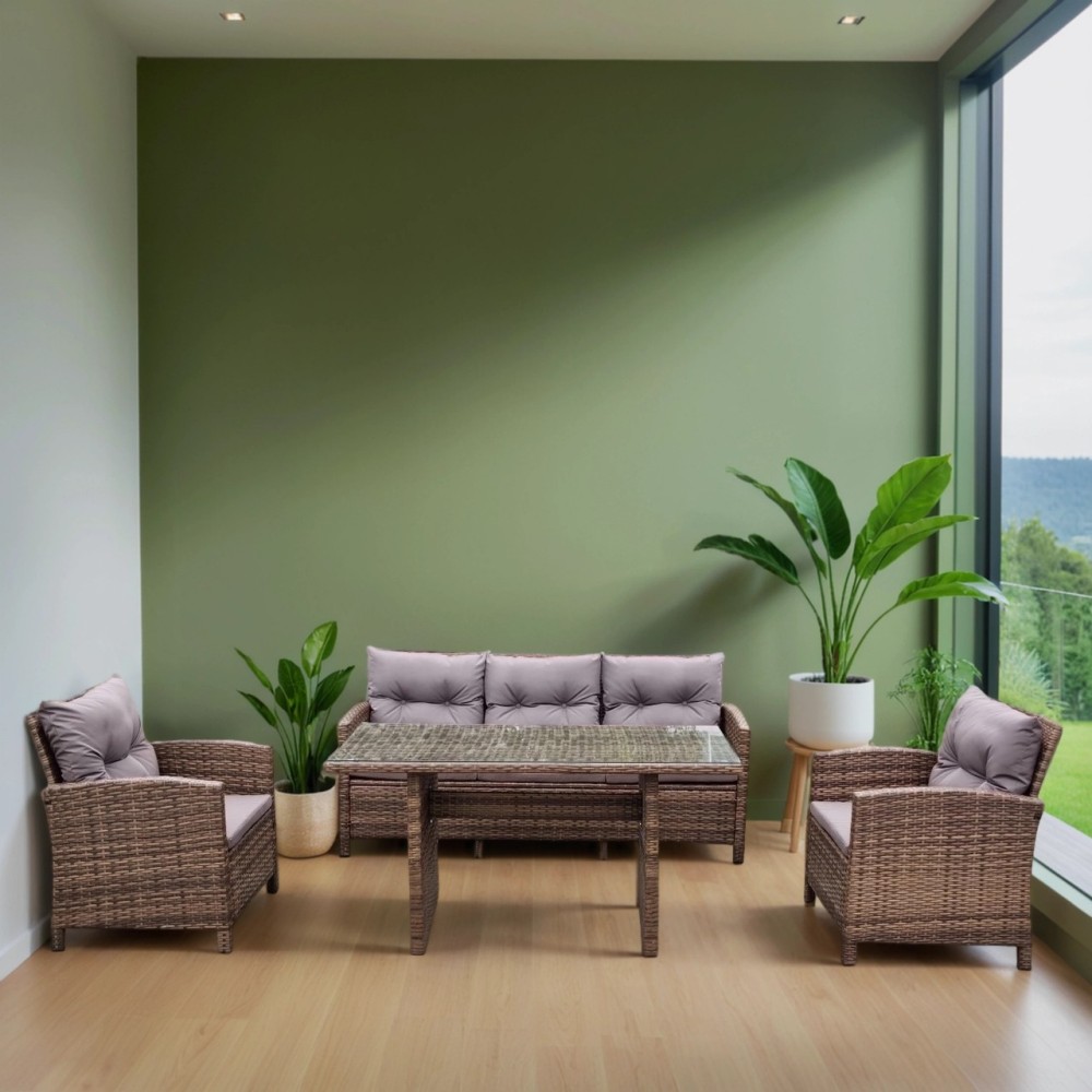 В составе комплекта: трехместный диван, обеденный стол и 2 кресла. Высококачественная лоза из полиротанга коричневого цвета стойкая к любым атмосферным явлениям. Крепкий стальной каркас с полимерным антивандальным покрытием и отличным качеством сварки. Изделие сплетено вручную нашими мастерами под жестким контролем качества на каждом этапе производства. Лоза максимально приближена по рельефу и текстуре к естественному материалу. Идеально подходит для использования на улице и внутри помещения в любую погоду. Не боится воды, солнца и минусовой температуры. Подушки идут в комплекте.