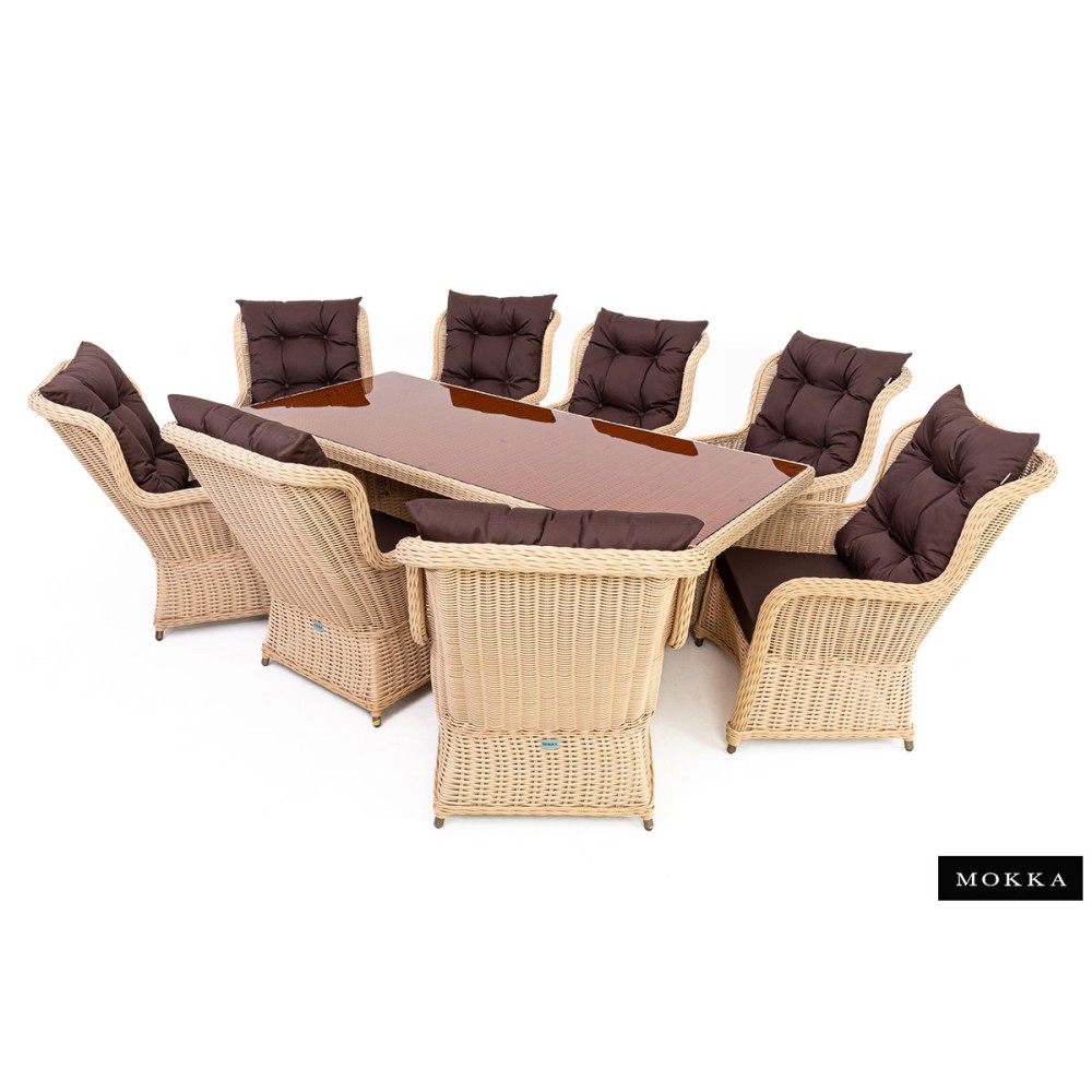 Высокие эргономичные спинки кресел, удобные подлокотники, стильное плотное плетение – SAN MARINO(Сан Марино) украсит обеденную зону на любой террасе. А большой обеденный стол позволит с комфортом разместиться и весело провести время компании из восьми человек.Комплектация