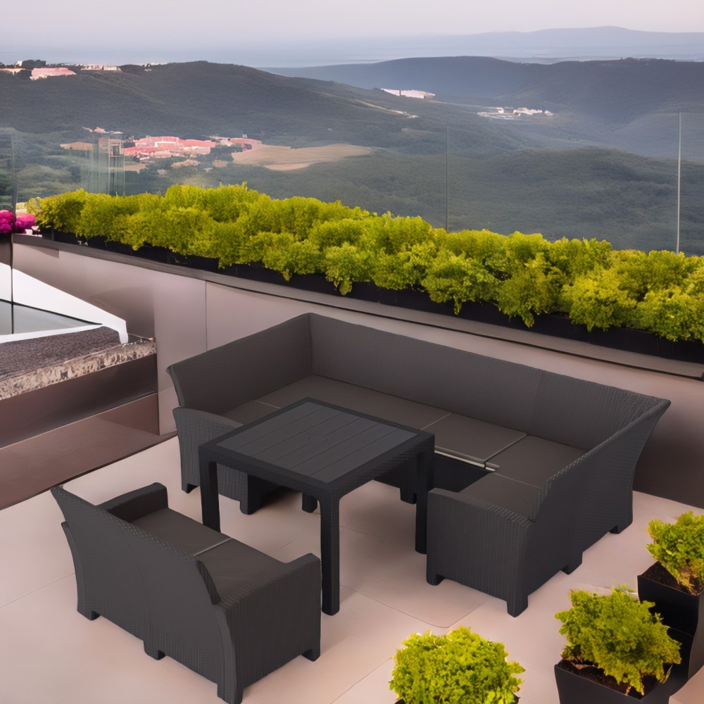 Садовая мебель «Калифорния» включает в себя П-образный диван размером 136 x 264 x 136 см, двухместный диван и обеденный стол 95 x 95 см. Каркас мебели изготовлен из высококачественного пластика и полипропилена, а сиденье — из искусственного ротанга. Это обеспечивает прочность, долговечность и устойчивость к погодным условиям. В комплекте имеются подушки на сидения.