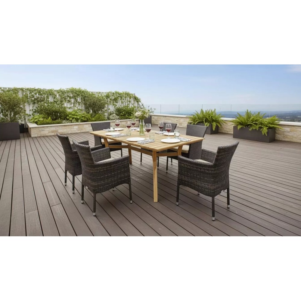 Стильный и вместительный ансамбль для организации современной обеденной зоны, воплощающий узнаваемый дизайн коллекции и безграничные возможности комфорта. Обеденный комплект объединяет прямоугольный стол МОДЕНА из массива акации и шесть плетеных кресел АРОМА с мягкими подушками, создавая идеальное решение для тех, кто ценит функциональность, долговечность и атмосферу неспешных семейных трапез на террасе, в саду или на даче.