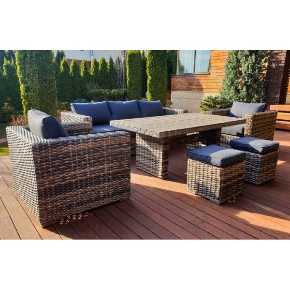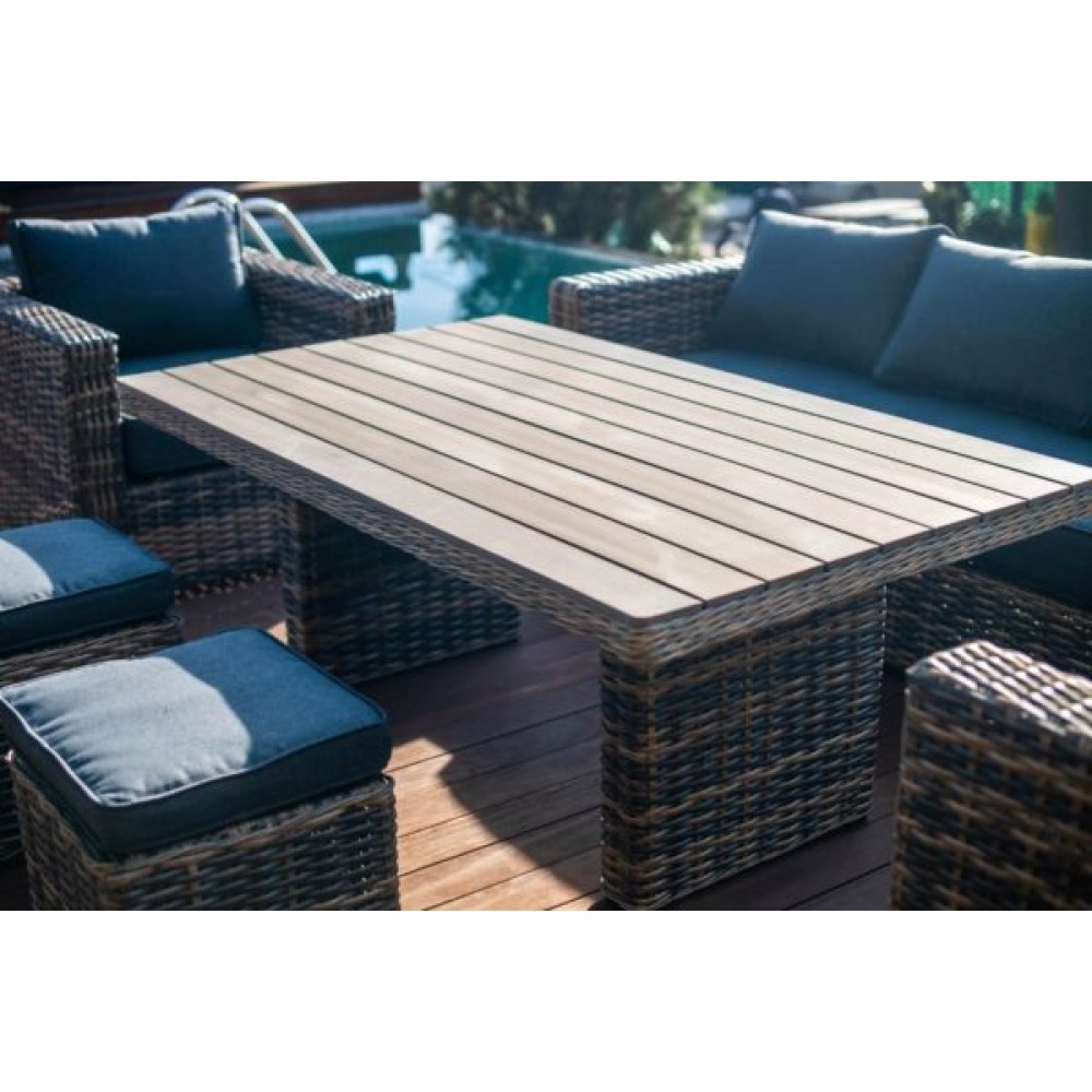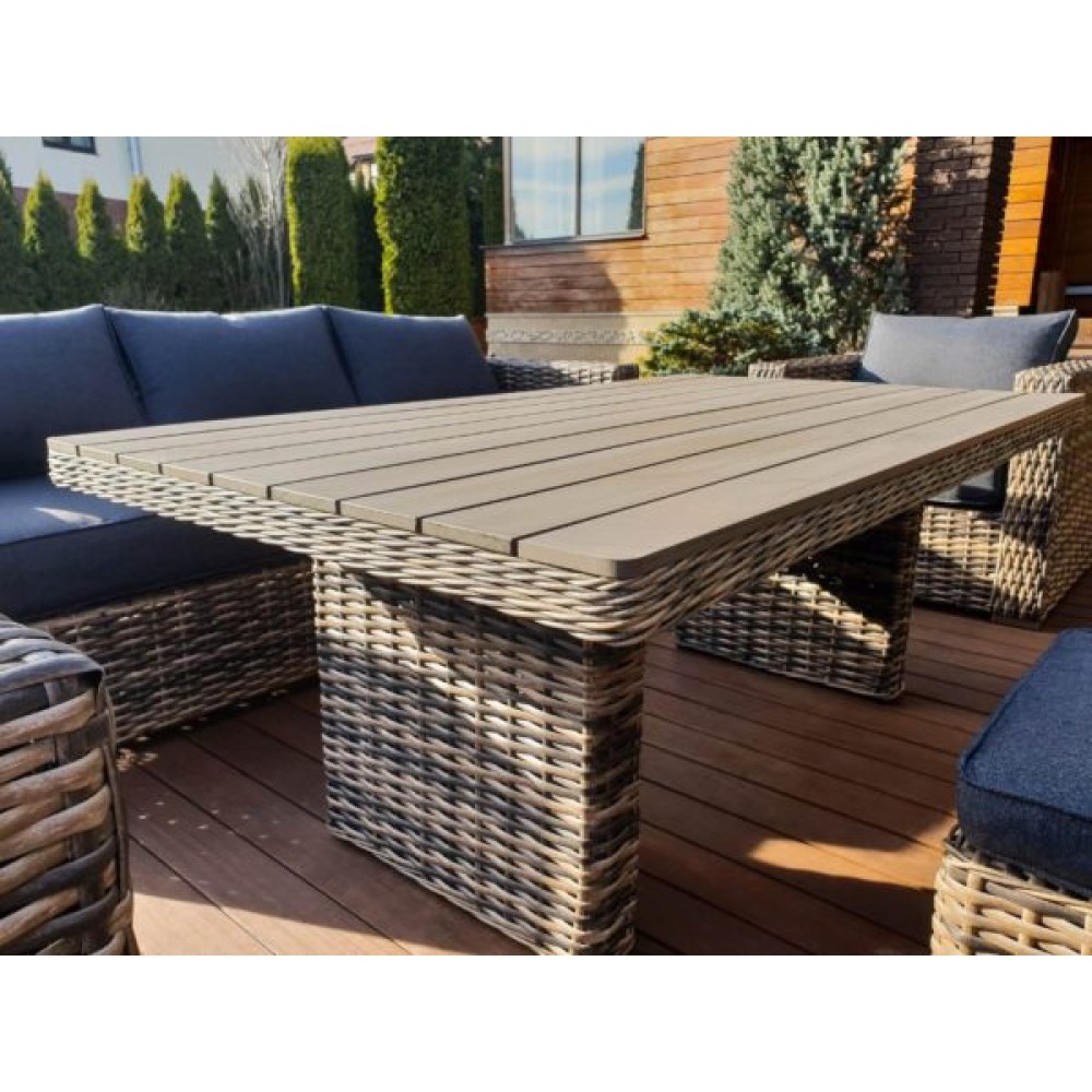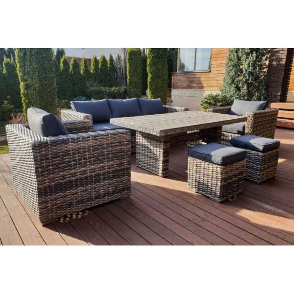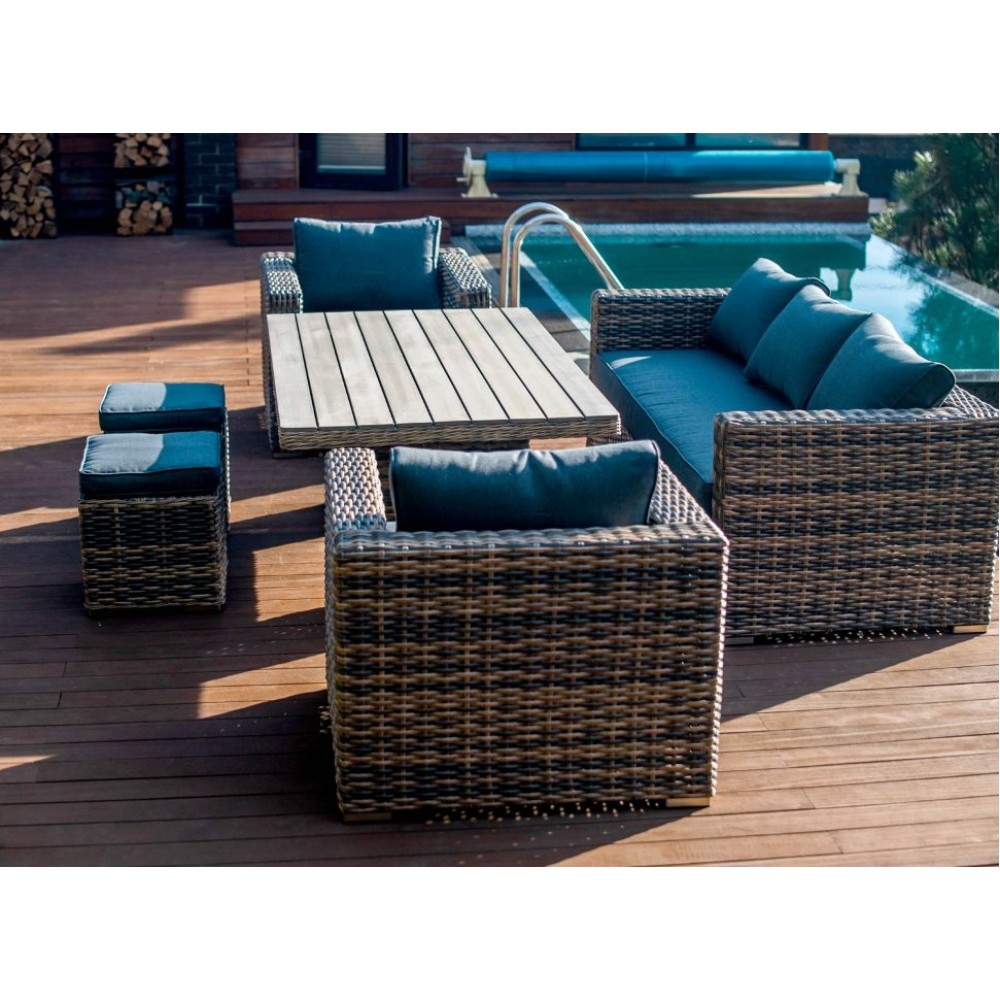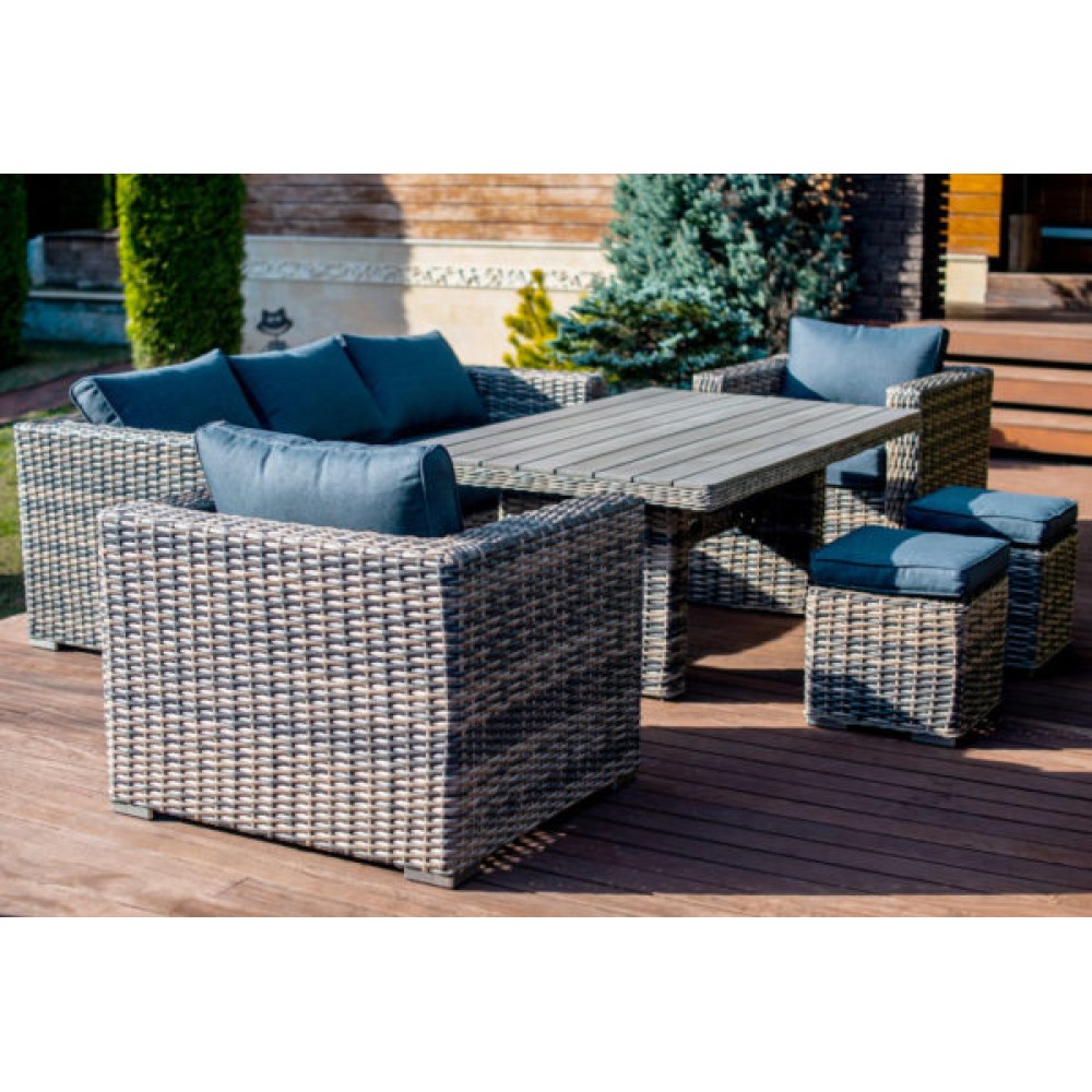 - Комплектация: 1 обеденный стол, 1 диван (трехместный) с подушками, 2 кресла с подлокотниками и подушками, 2 пуфика с мягкими подушками