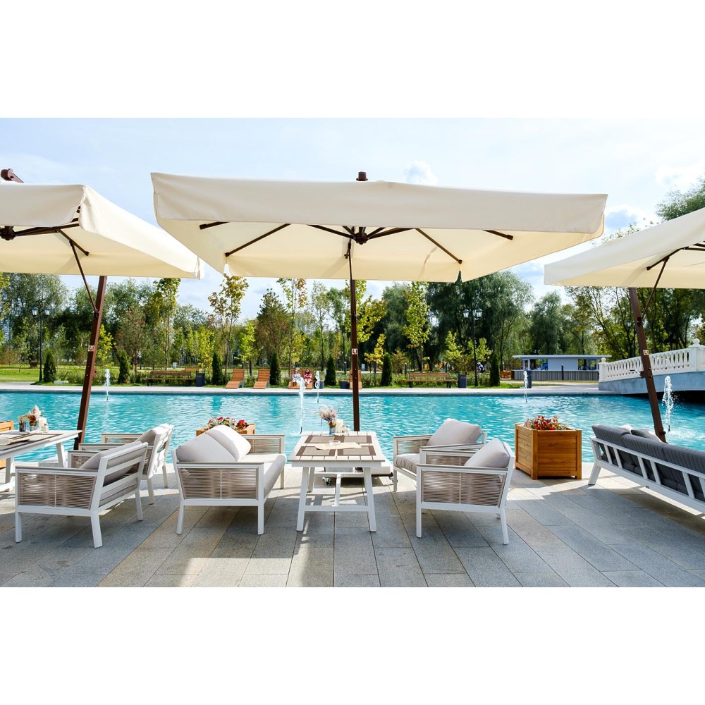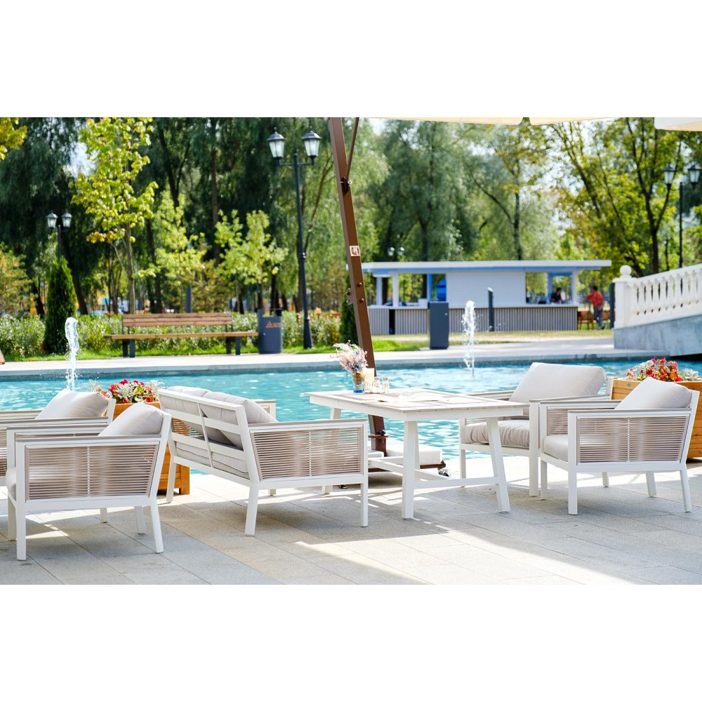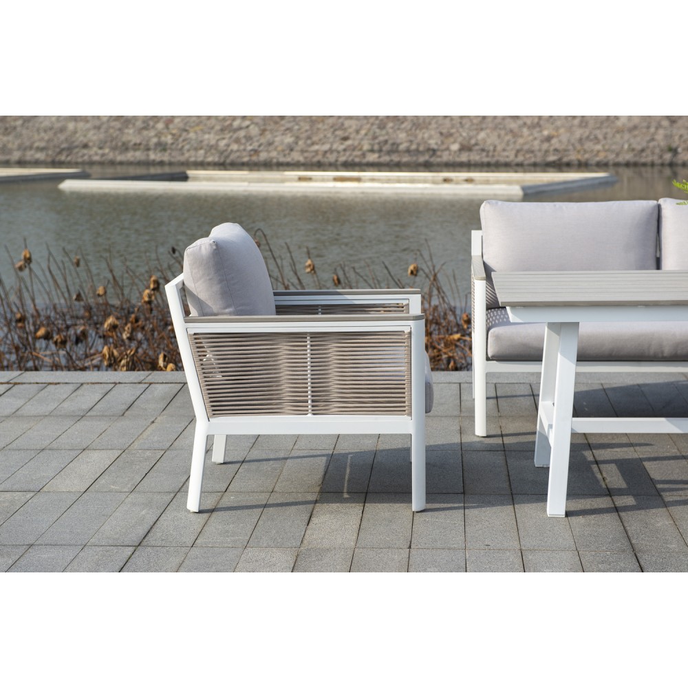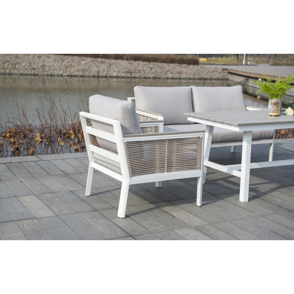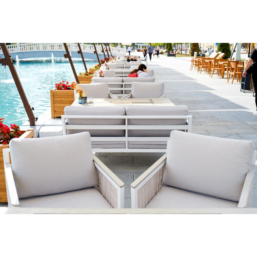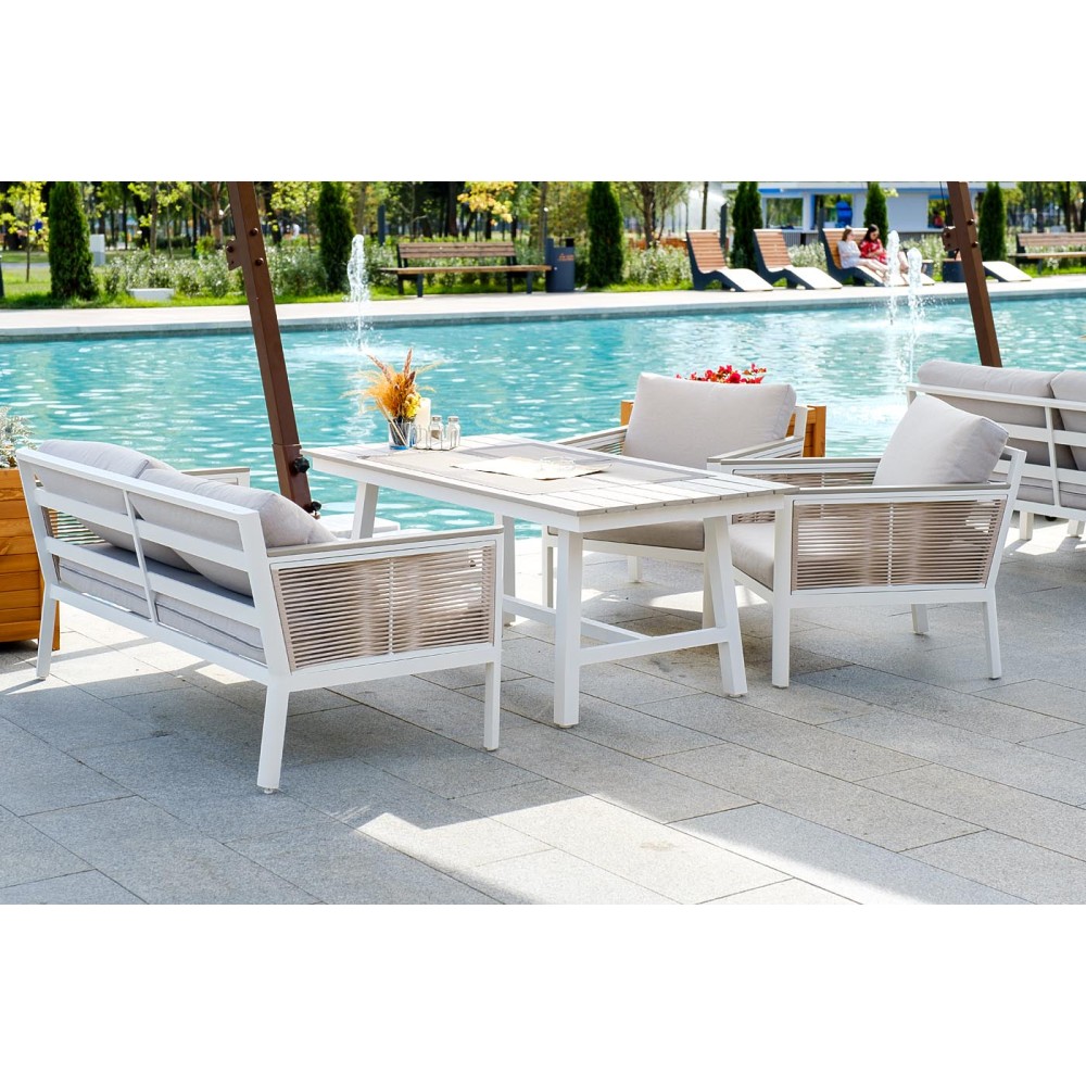 «Сан Ремо» лаунж-зона, алюминиевый каркас белого цвета, вручную оплетенный роупом серо-коричневого цвета.