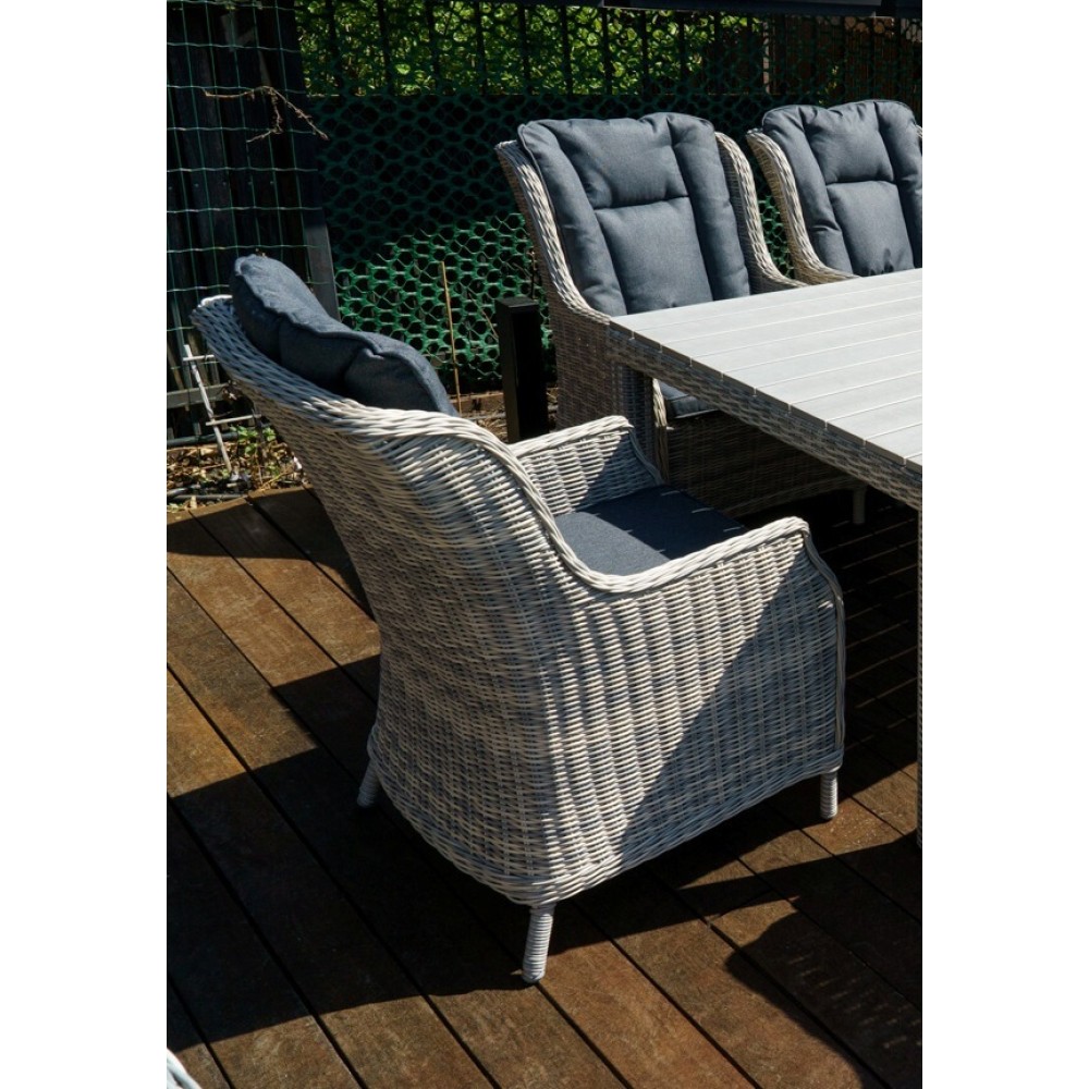 Серый искусственный ротанг — трендовый выбор для тех, кто предпочитает сдержанную элегантность вместо классических коричневых оттенков. Такое кресло: