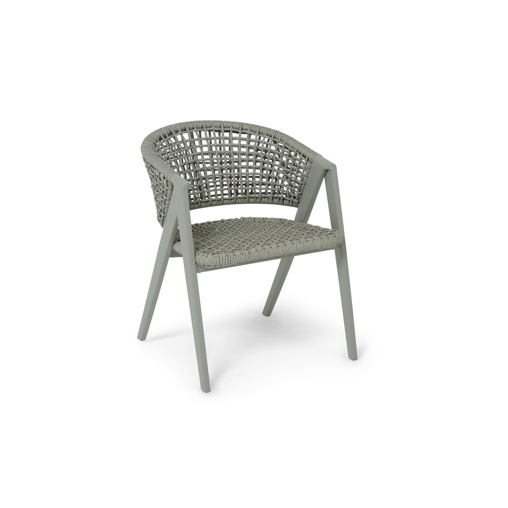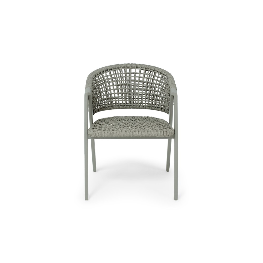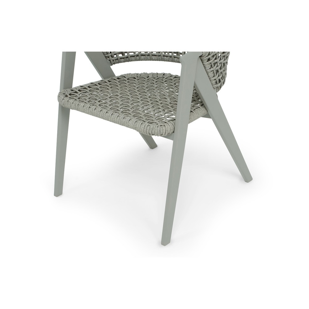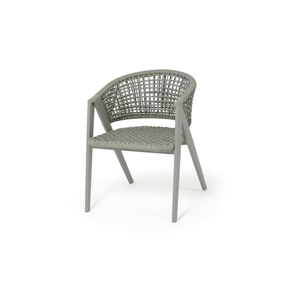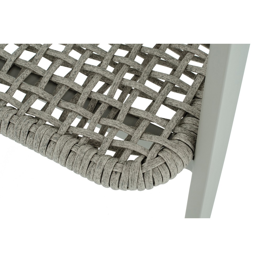 Стул выполнен из алюминиевого каркаса, который вручную оплетен круглым искусственным ротангом. Приятный на ощупь и напоминает шерстяное плетение. Цвет каркаса и оплетки – серый. На ножках стула идут серые пластиковые наконечники (заглушки).