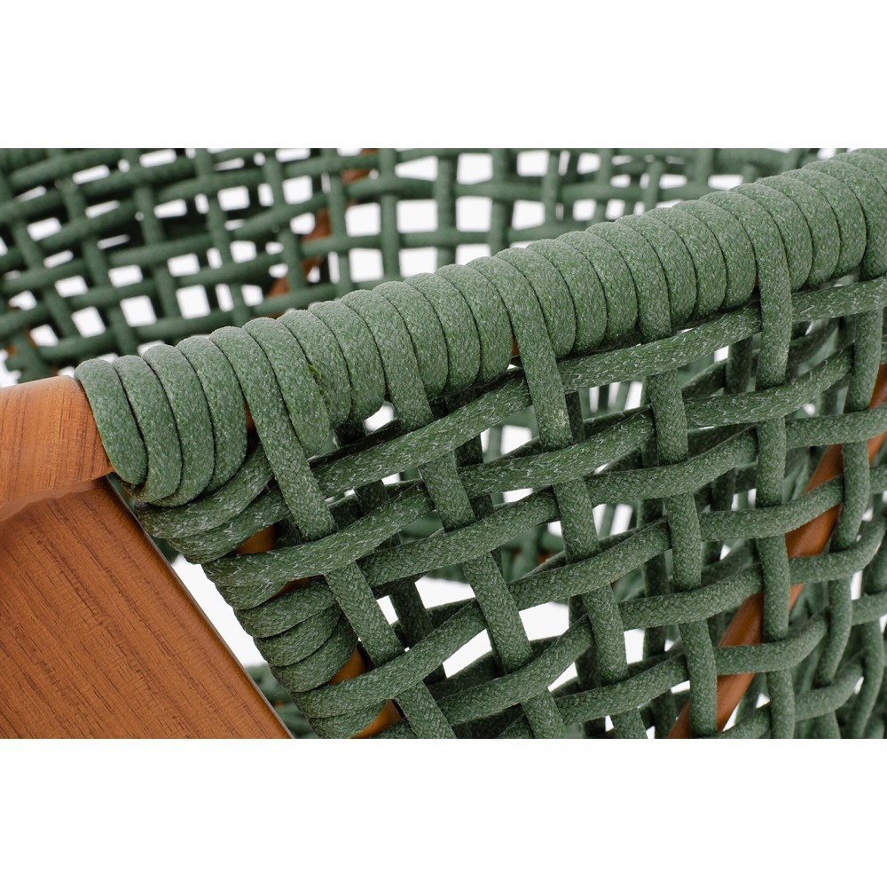 Стул выполнен из алюминиевого каркаса, который вручную оплетен круглым искусственным ротангом. Приятный на ощупь и напоминает шерстяное плетение. Цвет каркаса – «под дерево», оплетки - зеленый. На ножках стула идут черные пластиковые наконечники (заглушки).