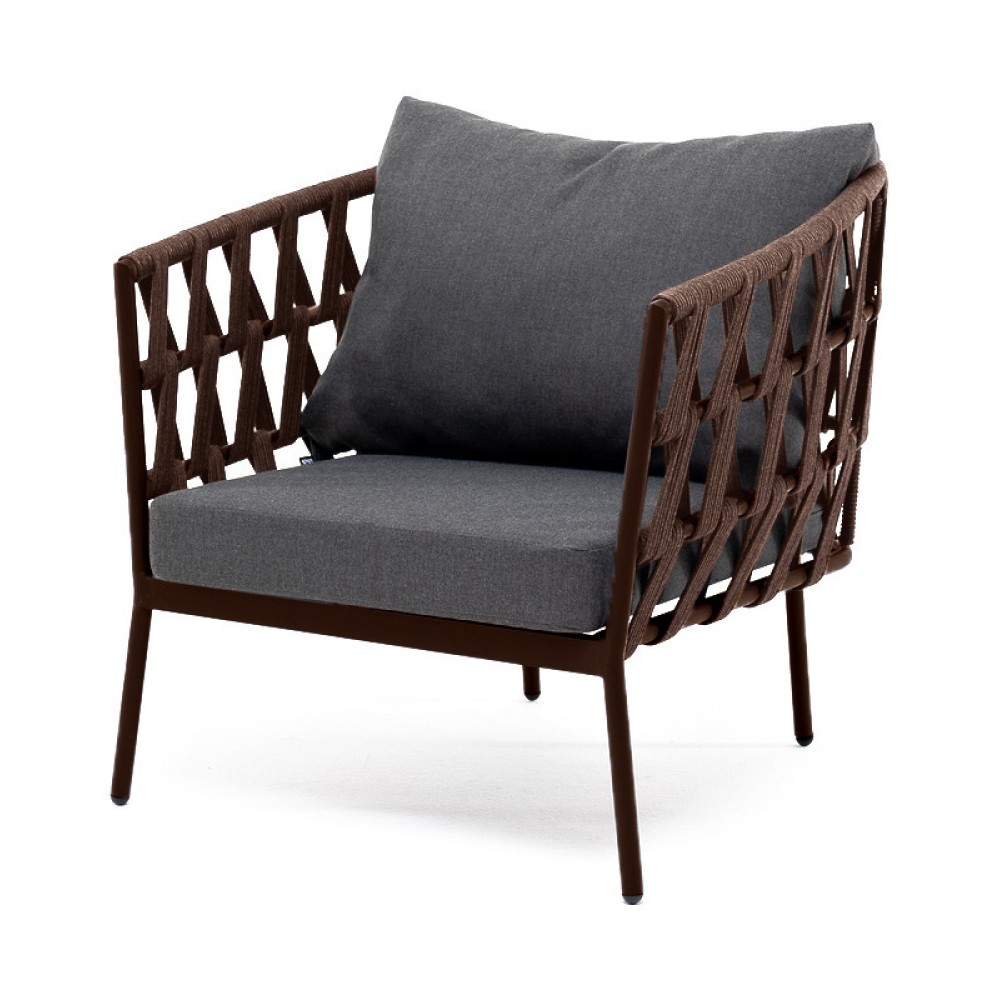 Кресло имеет алюминиевый каркас, окрашенный порошковой краской в коричневый (RAL8016) цвет. Боковины каркаса вручную оплетены роупом - эластичными синтетическими лентами, изготовленными из высокопрочных полиэфирных волокон. Цвет оплетки - коричневый.