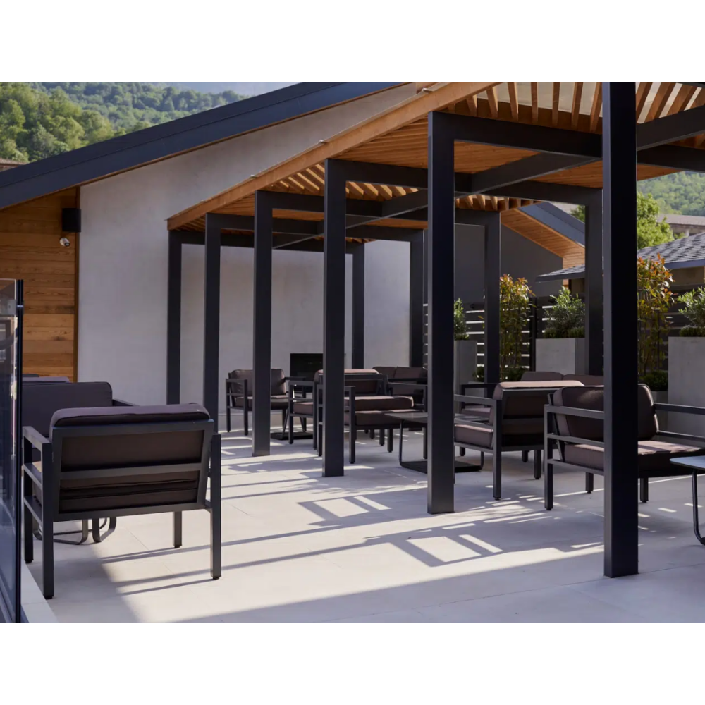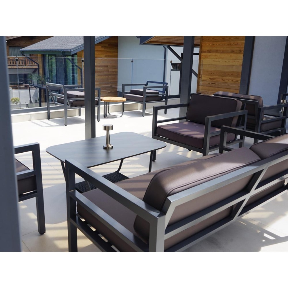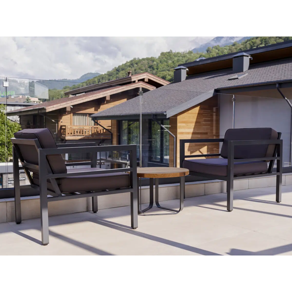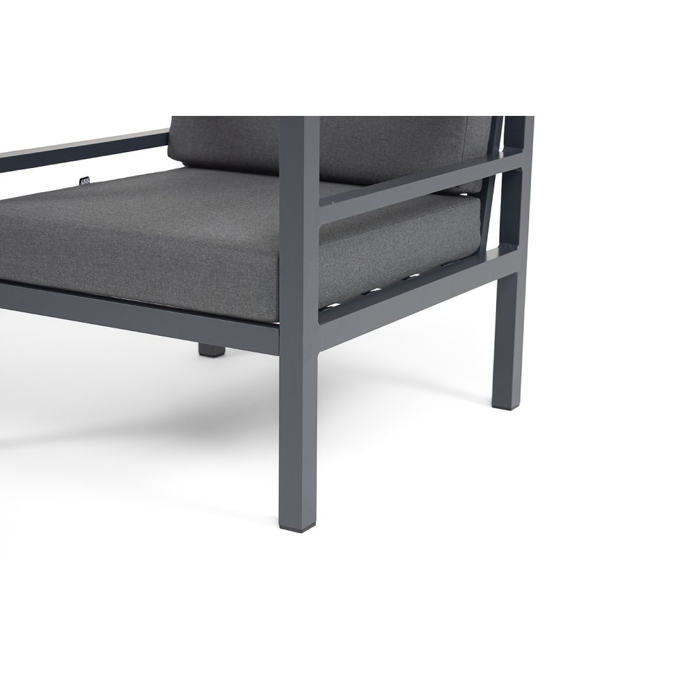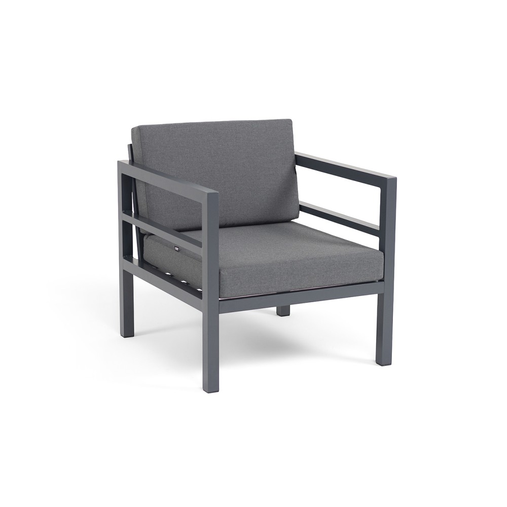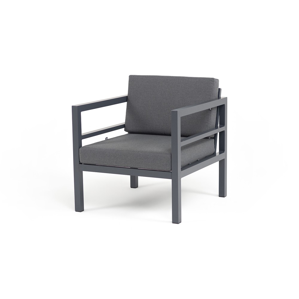 Металлическое садовое кресло в минималистическом стиле «Эстелья». Каркас выполнен из легкого прочного алюминия, который окрашен порошковой высокостойкой краской темно-серого цвета.