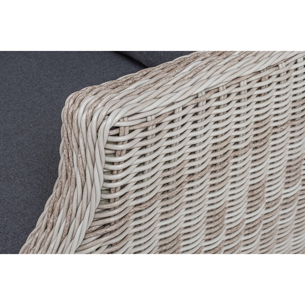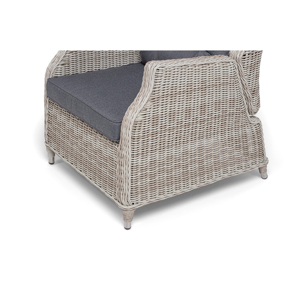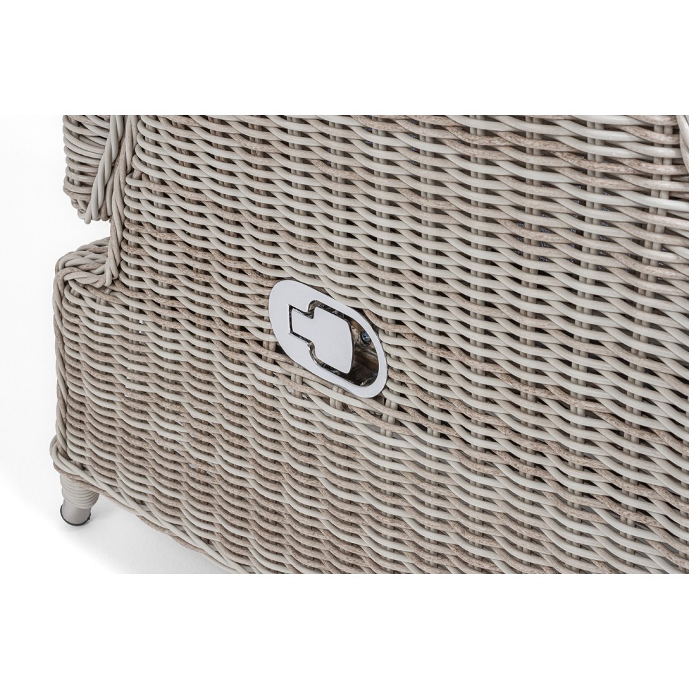В основе мебели находится алюминиевый каркас высокой прочности, который оплетен круглым искусственным ротангом. Представлена в натуральном бежевом оттенке.