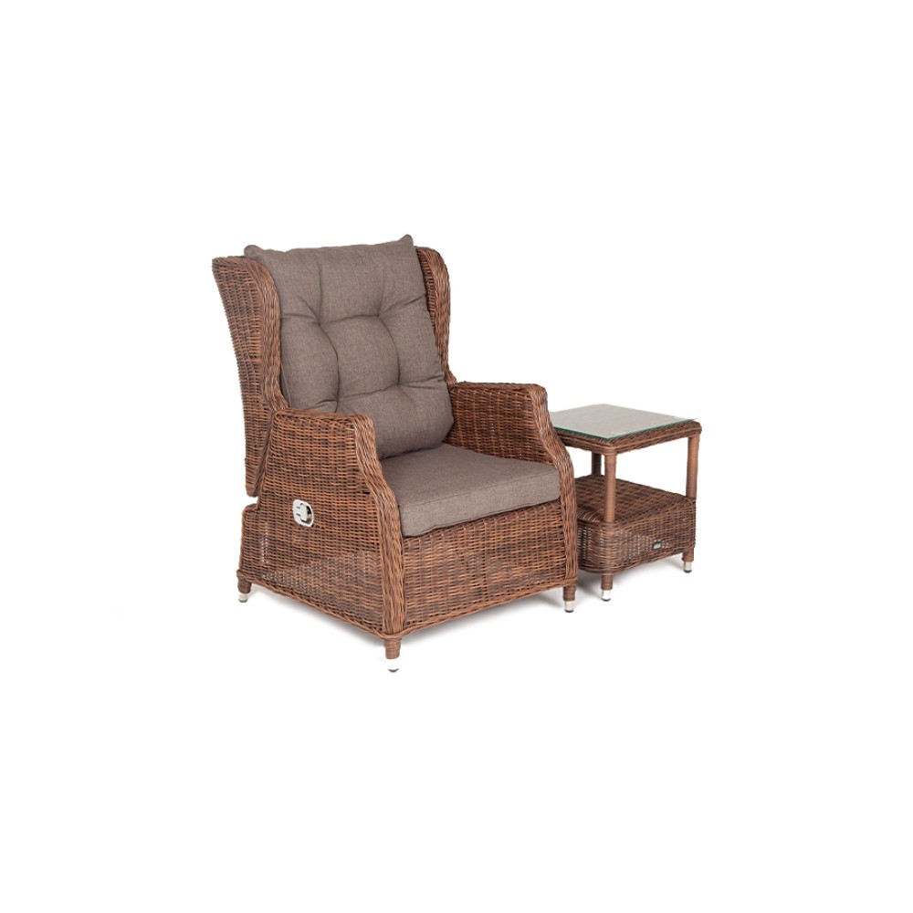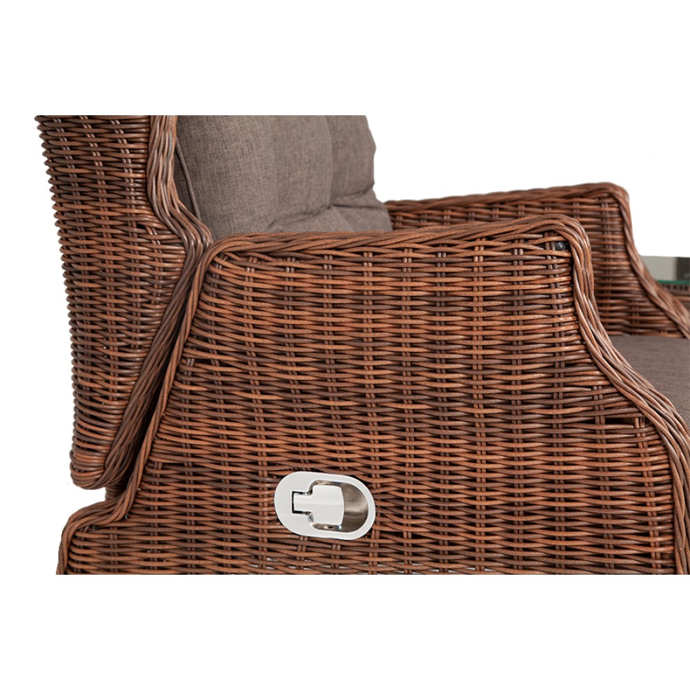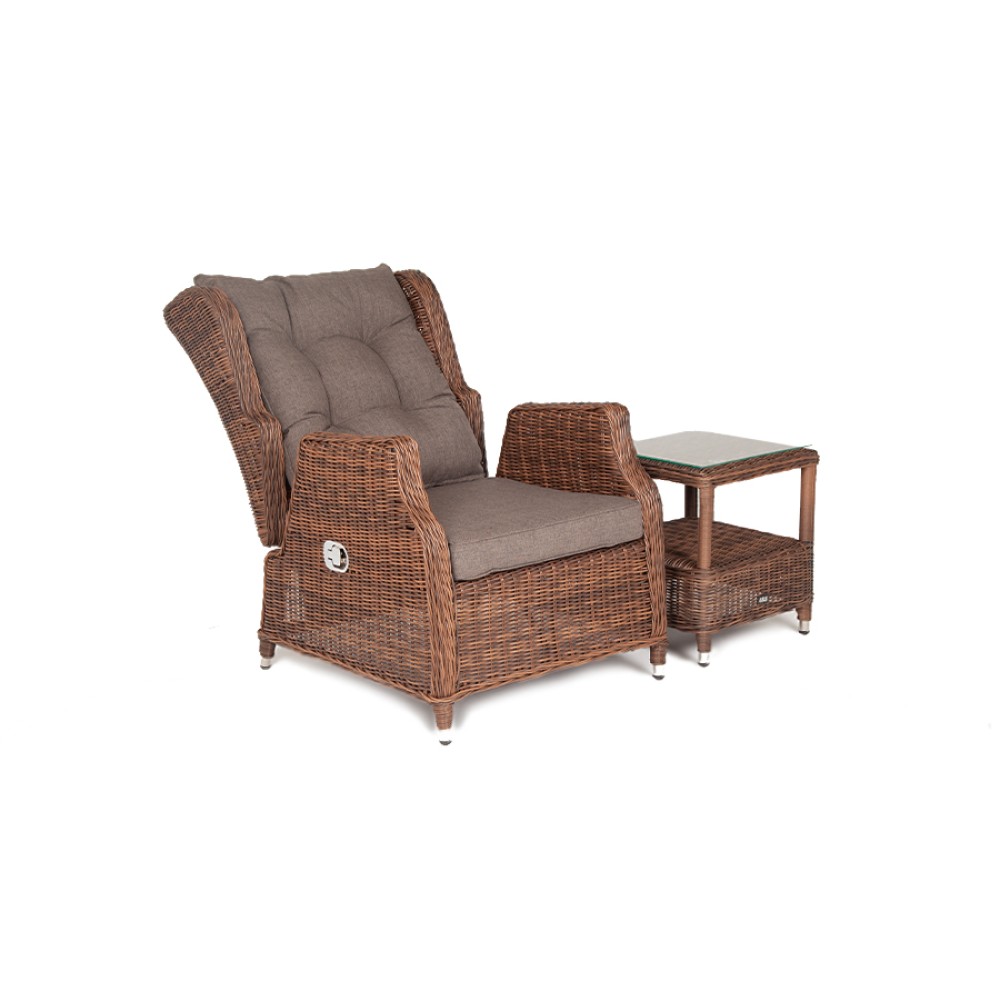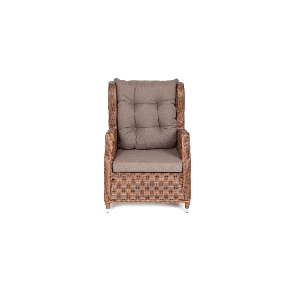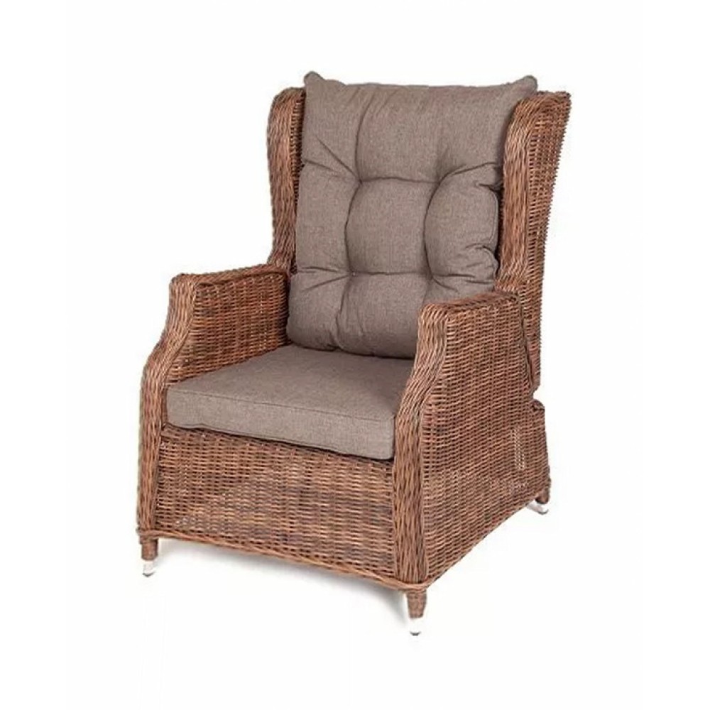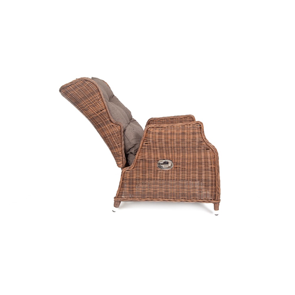 Кресло из искусственного ротанга «Форио» коричневого цвета, разработано с возможностью регулировки уровня наклона для индивидуального комфорта.