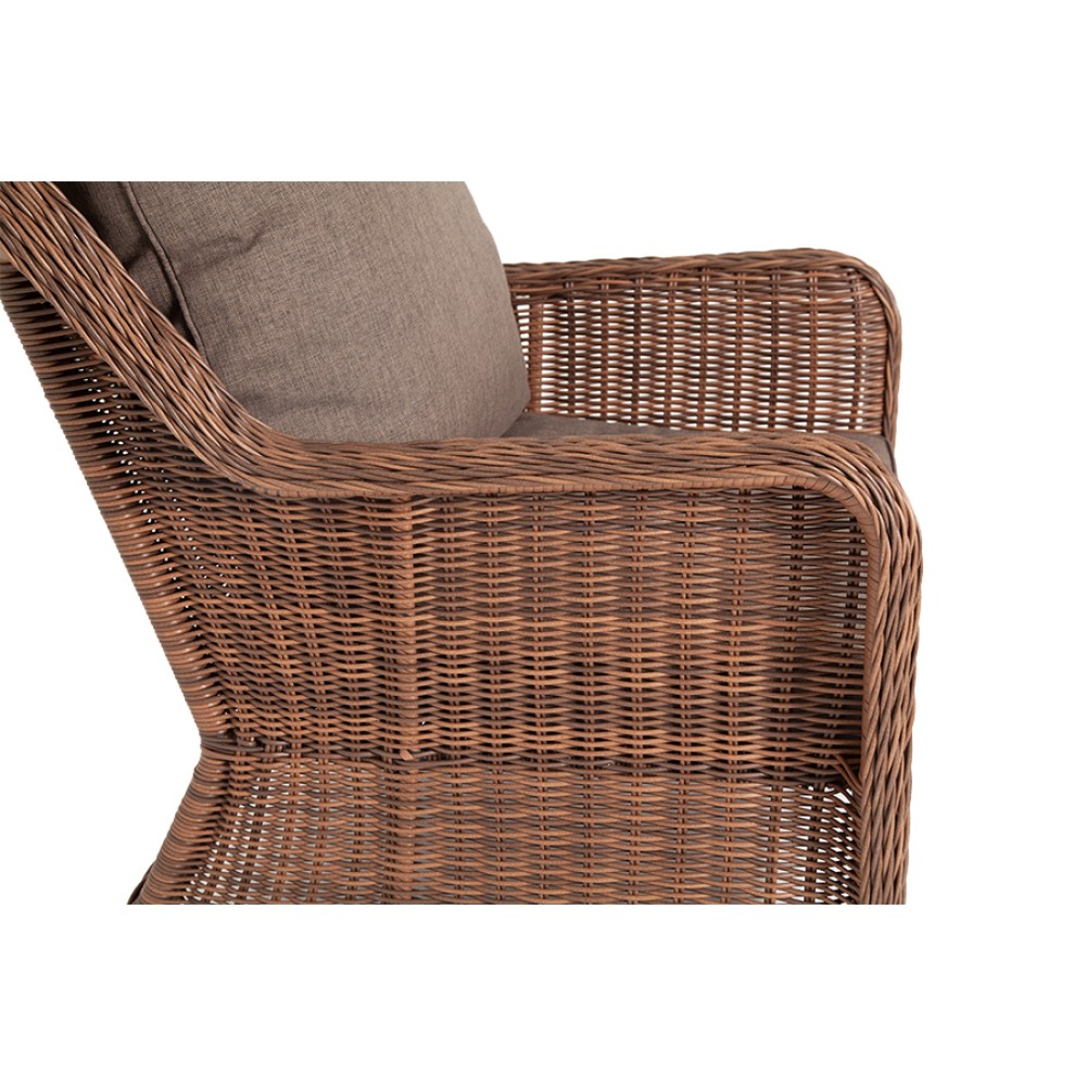 Кресло оснащено каркасом из прочного алюминия, а его оплетка выполнена из круглого искусственного ротанга ручного плетения коричневого цвета.