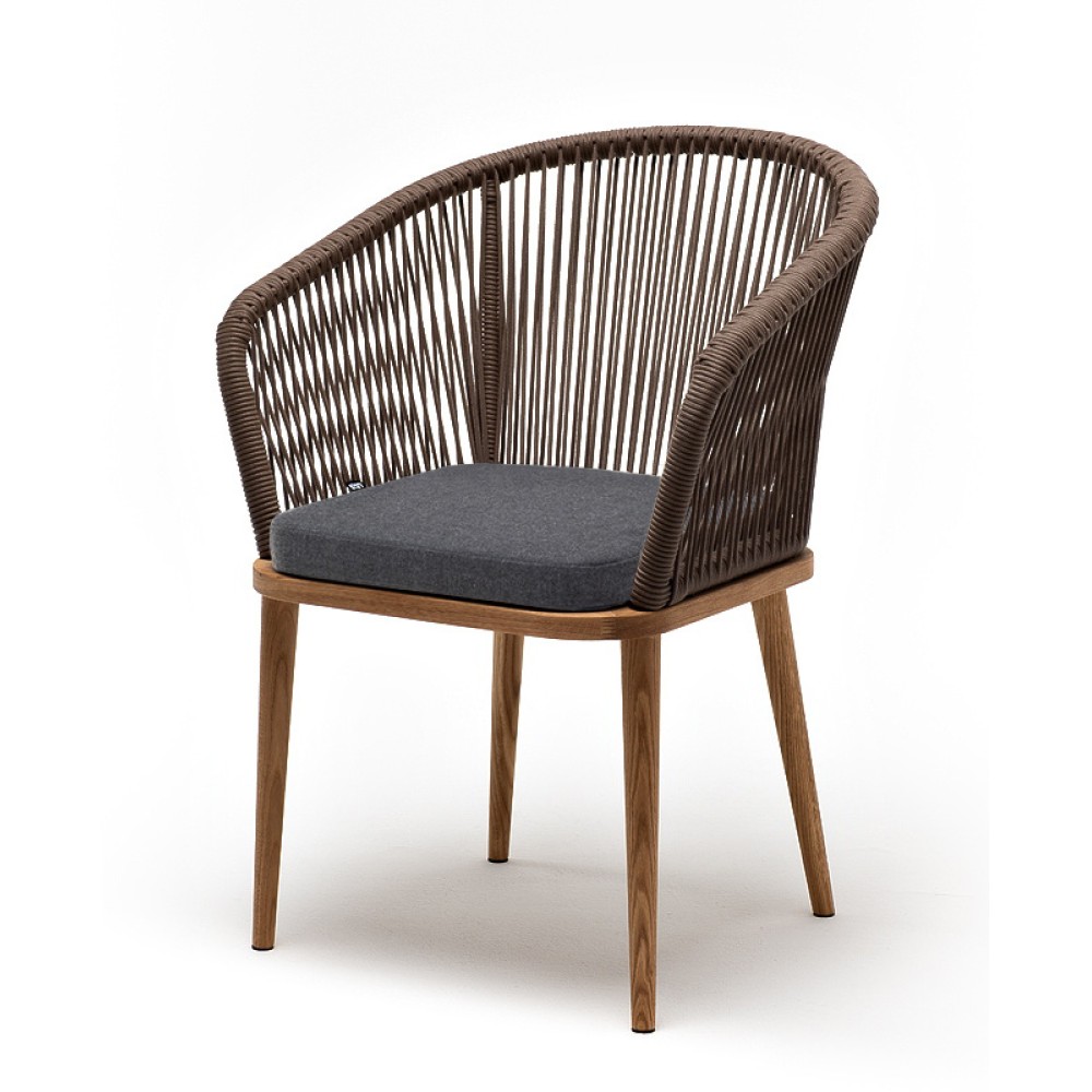 Каркас выполнен из натурального дерева. Оплетка выполнена вручную современным материалом - роупом. Это эластичные синтетические веревки из высокопрочных полиэфирных волокон, предназначенные для изготовления мебели. Цвет оплетки - коричневый.