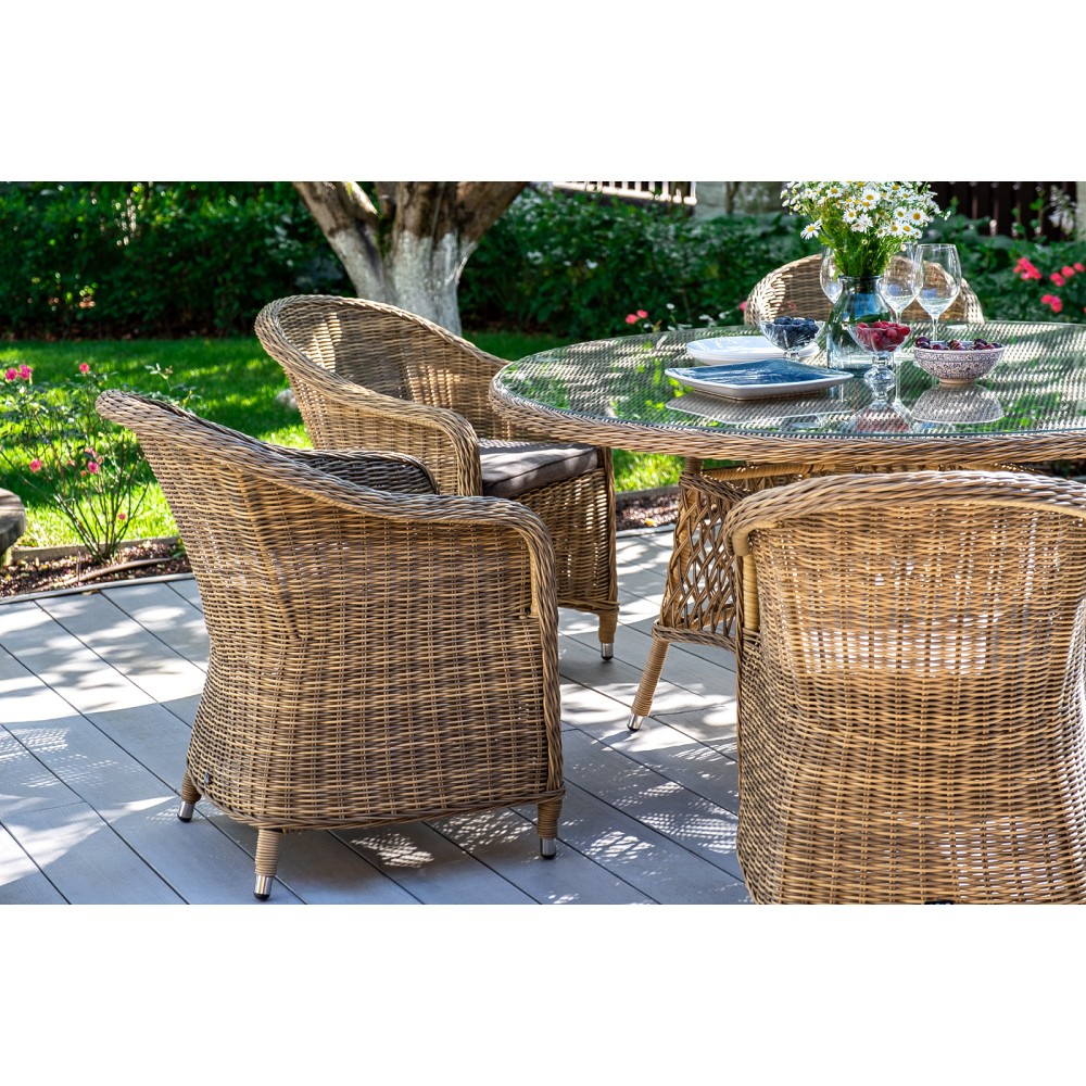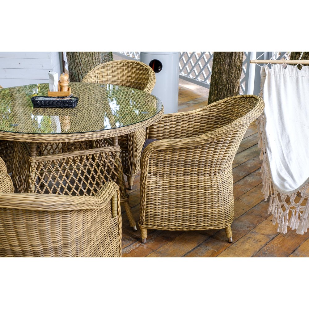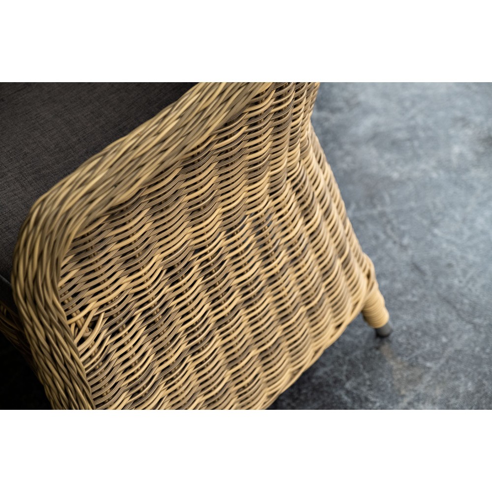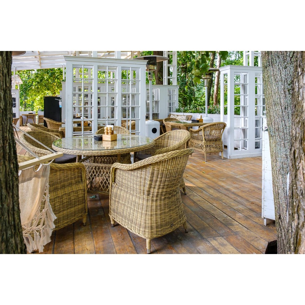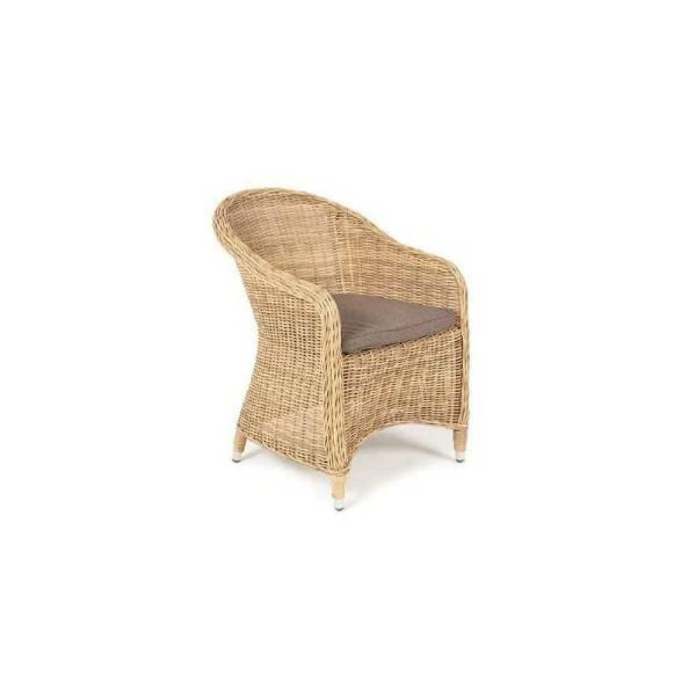 Кресло изготовлено с помощью ручного плетения и выполнено из круглого искусственного ротанга соломенного цвета. Для укрепления конструкции использован алюминиевый каркас. Благодаря ему плетеное кресло остается легким, но прочным.