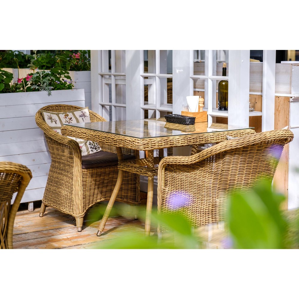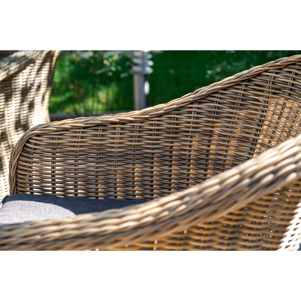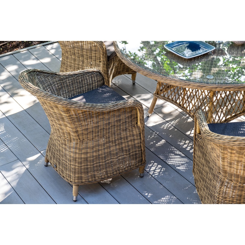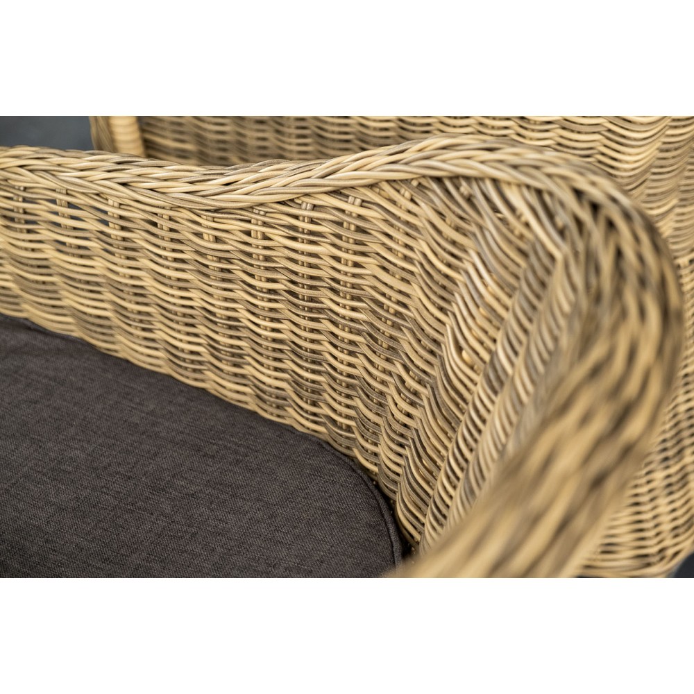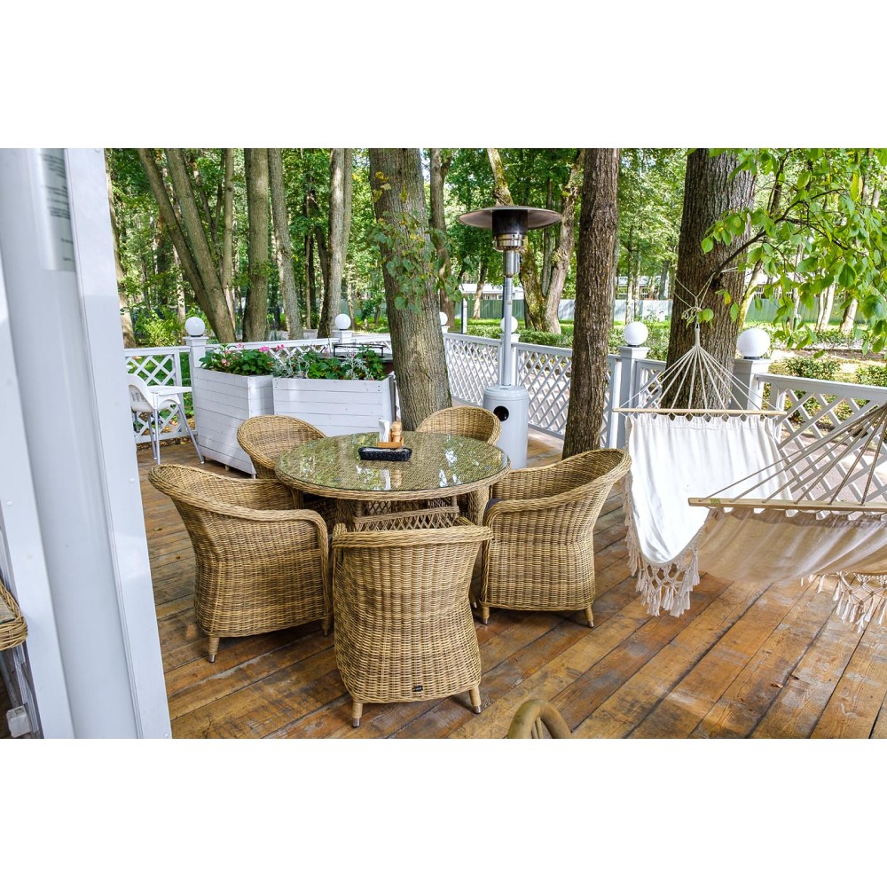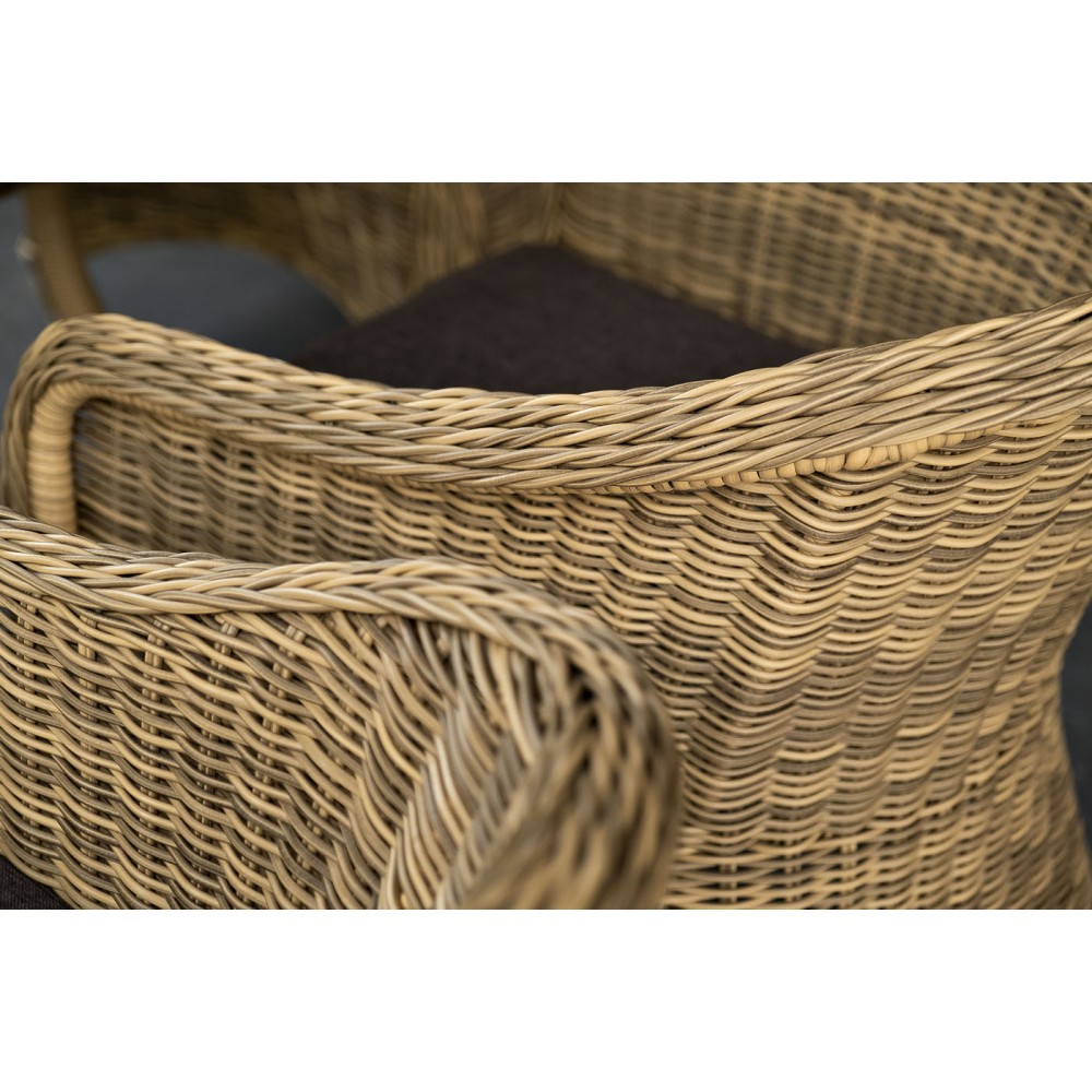 Кресло изготовлено с помощью ручного плетения и выполнено из круглого искусственного ротанга соломенного цвета. Для укрепления конструкции использован алюминиевый каркас. Благодаря ему плетеное кресло остается легким, но прочным.