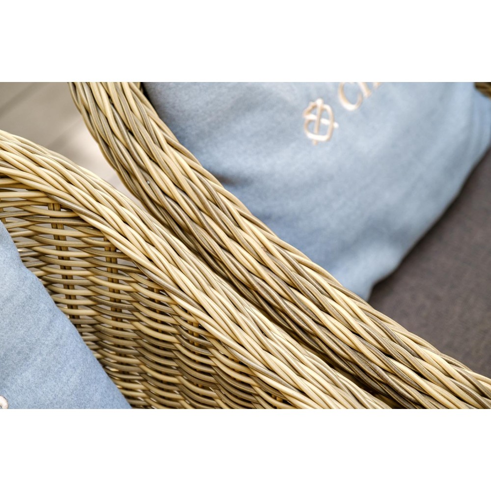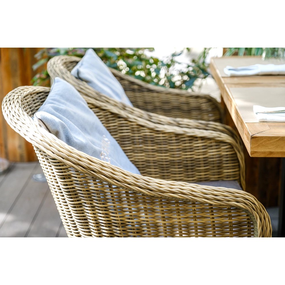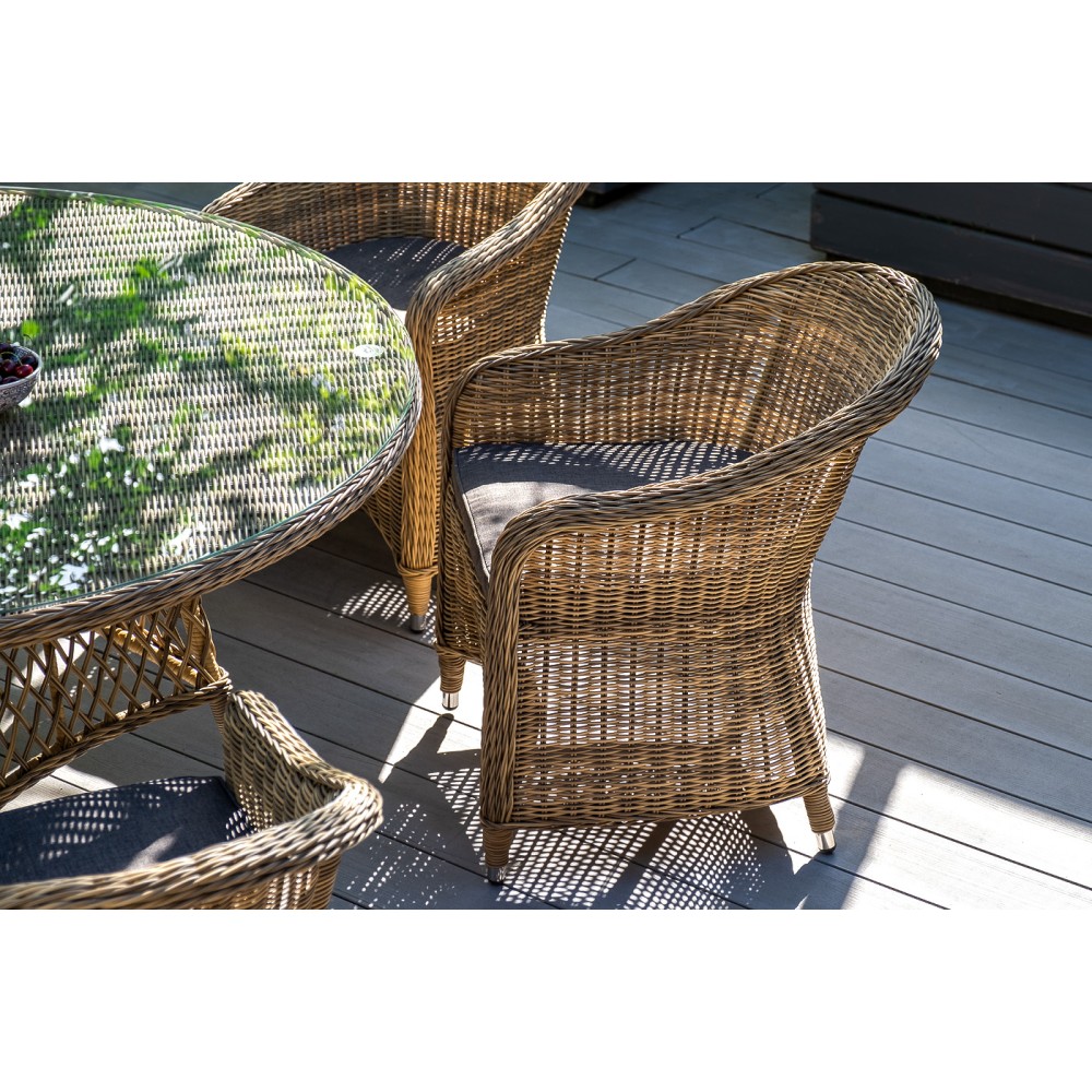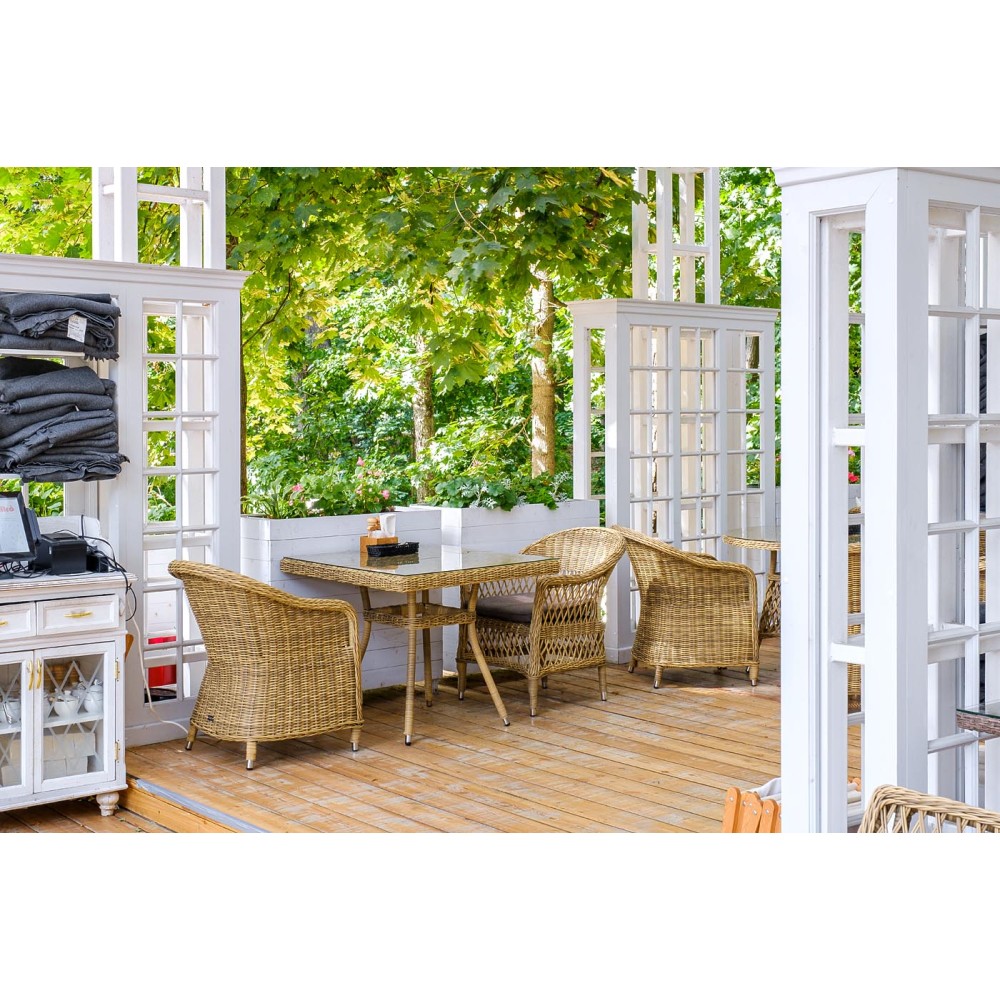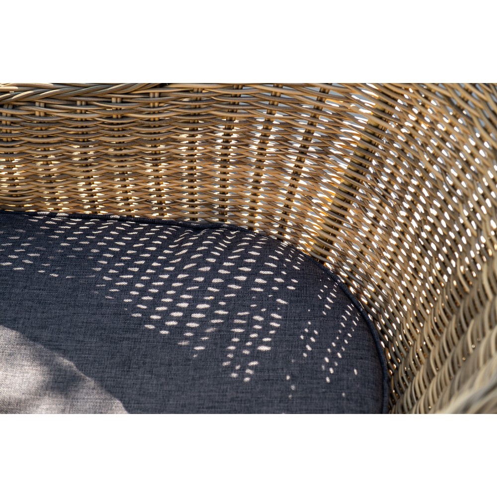 Кресло изготовлено с помощью ручного плетения и выполнено из круглого искусственного ротанга соломенного цвета. Для укрепления конструкции использован алюминиевый каркас. Благодаря ему плетеное кресло остается легким, но прочным.