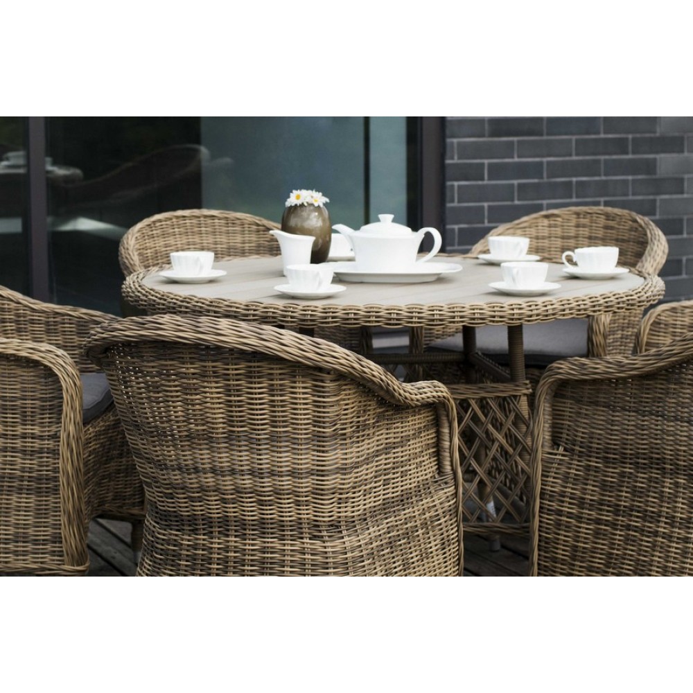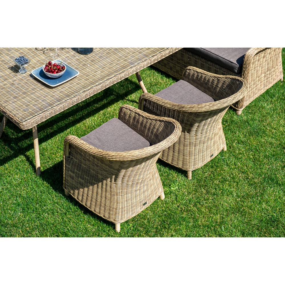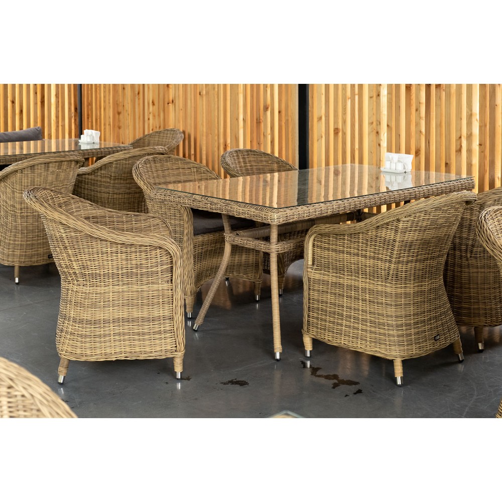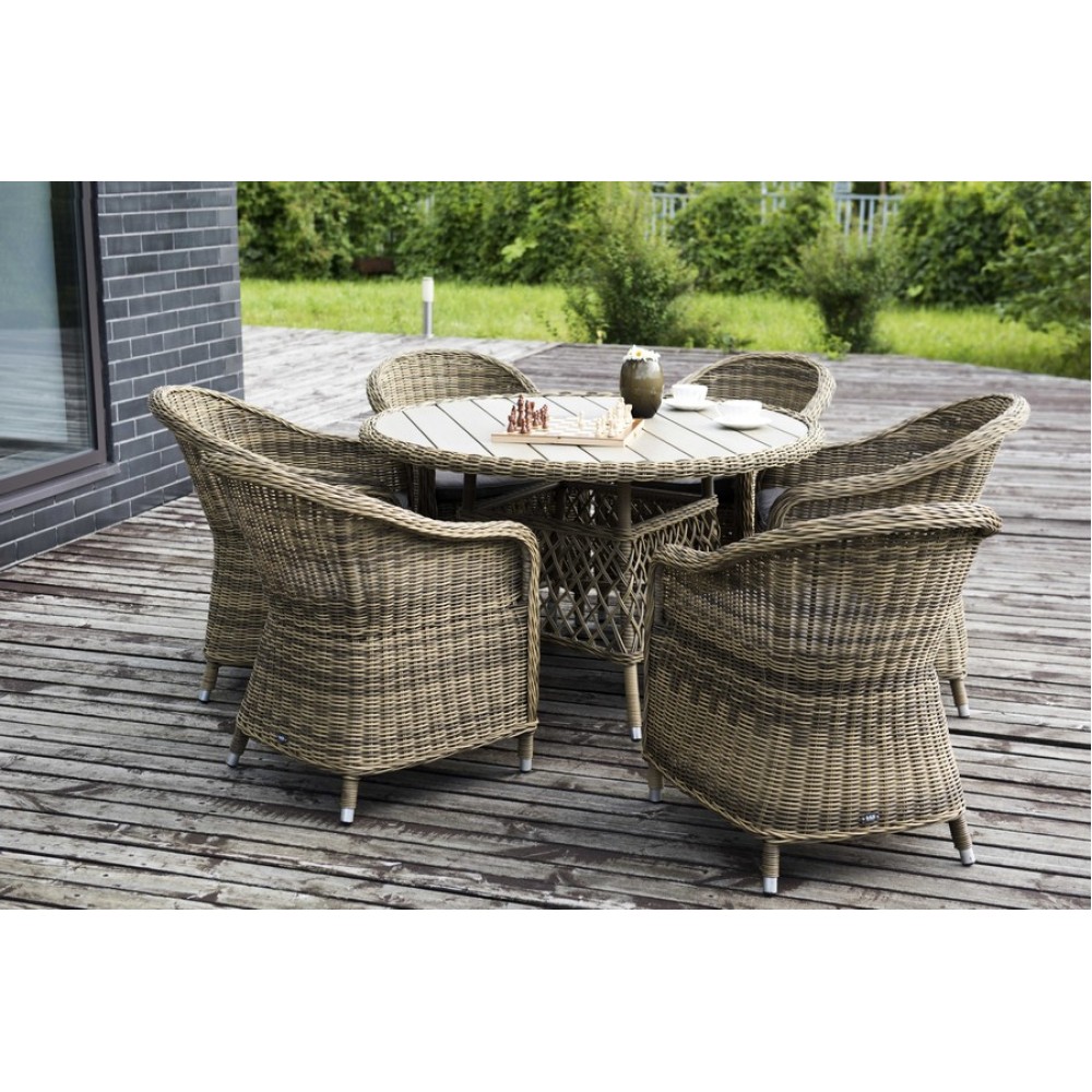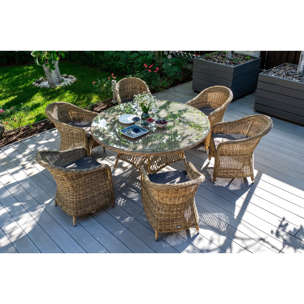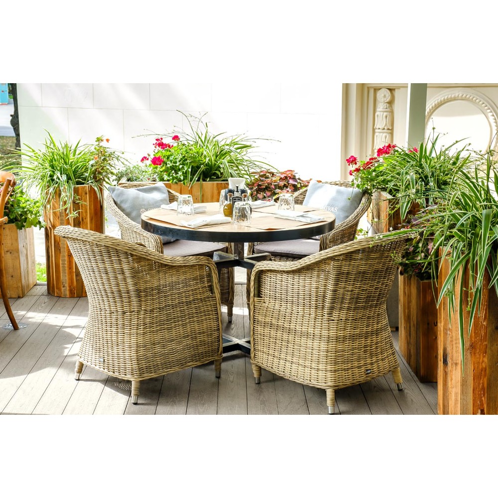 Кресло изготовлено с помощью ручного плетения и выполнено из круглого искусственного ротанга соломенного цвета. Для укрепления конструкции использован алюминиевый каркас. Благодаря ему плетеное кресло остается легким, но прочным.