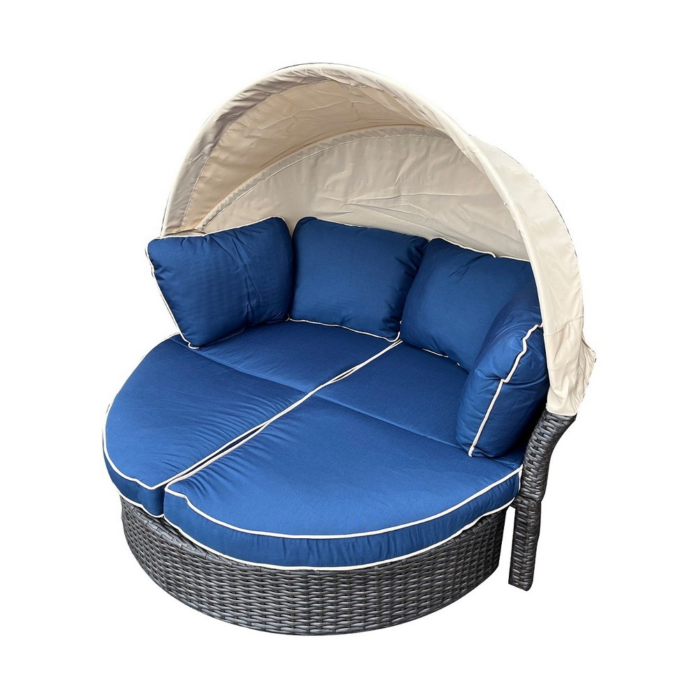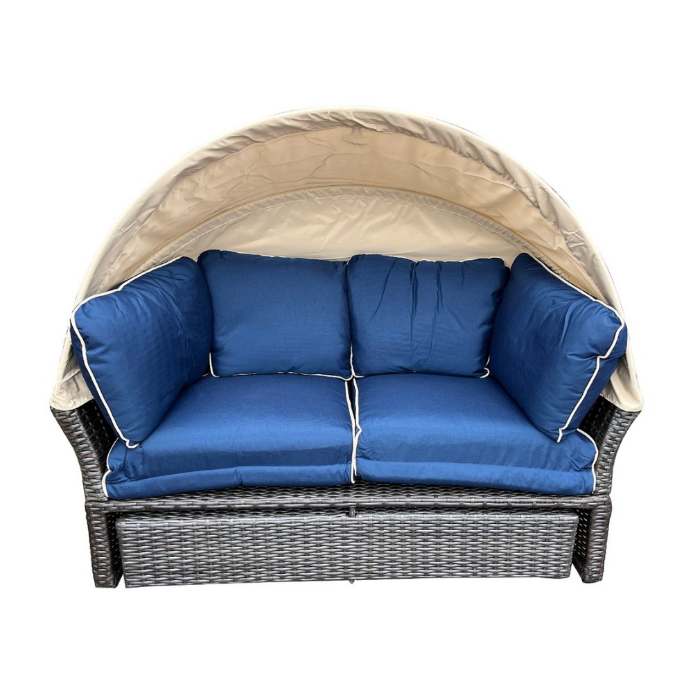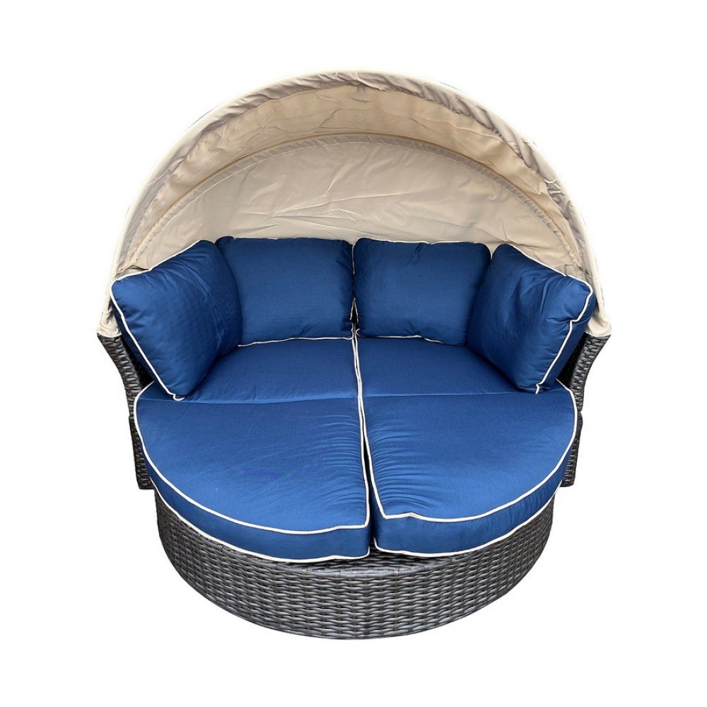 Конструкция отличается надёжностью: в основе — прочный стальной каркас, вручную оплетённый плоским искусственным ротангом. Для комфорта предусмотрена защитная функция — козырёк из 100% полиэстера, который ограничивает попадание прямых солнечных лучей.