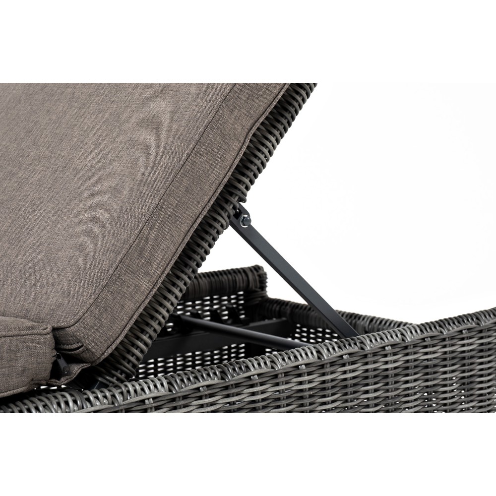 Спинка шезлонга обладает четырьмя уровнями наклона. Ширина составляет 66 см, длина 199 см и 31 см в высоту. Завершающим элементом данной модели, являются мягкие подушки из высококачественного полиэстера с влагоотталкивающей пропиткой.