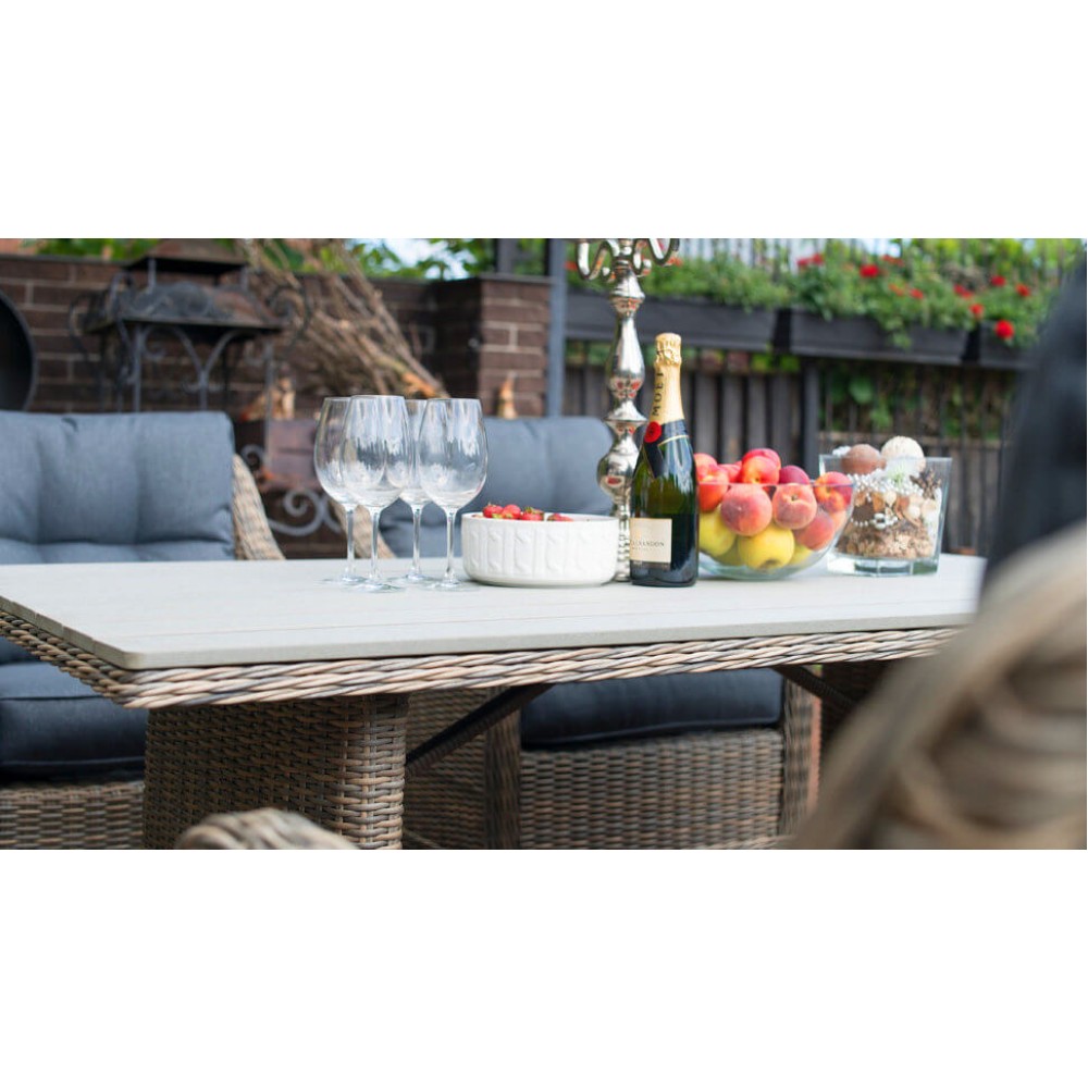 - Обеденный стол 170×90×68 см — вместительная столешница из поливуда (искусственного дерева) легко размещает компанию из 6 человек с посудой и напитками