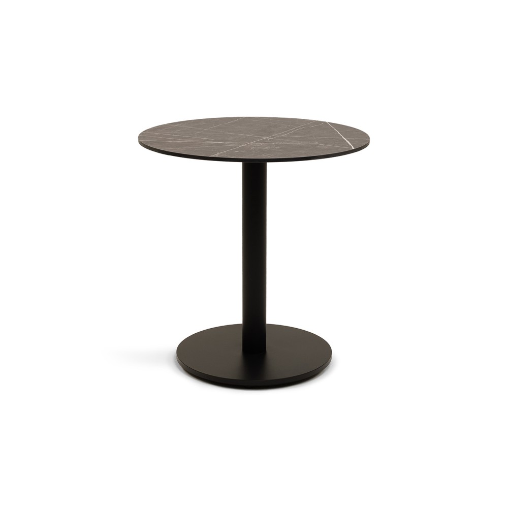 Интерьерный круглый стол «Каффе» со столешницей из HPL в цвете «серый мрамор». Это высококачественный ударопрочный компакт-пластик, обладающий низкой пористостью, что предотвращает впитывание жидкостей, поэтому столы из HPL идеально подходит для обеденных зон. Толщина столешницы – 12 мм.
