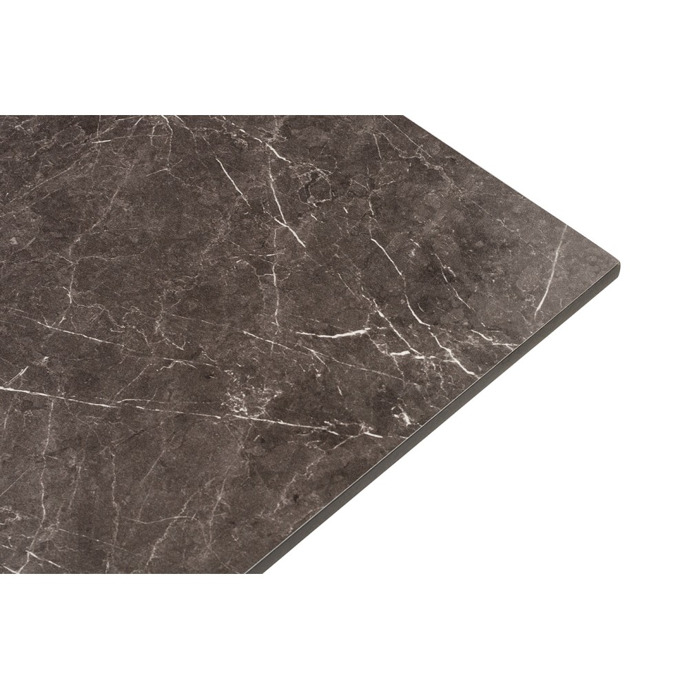 Интерьерный круглый стол «Каффе» со столешницей из HPL в цвете «серый мрамор». Это высококачественный ударопрочный компакт-пластик, обладающий низкой пористостью, что предотвращает впитывание жидкостей, поэтому столы из HPL идеально подходит для обеденных зон. Толщина столешницы – 12 мм.