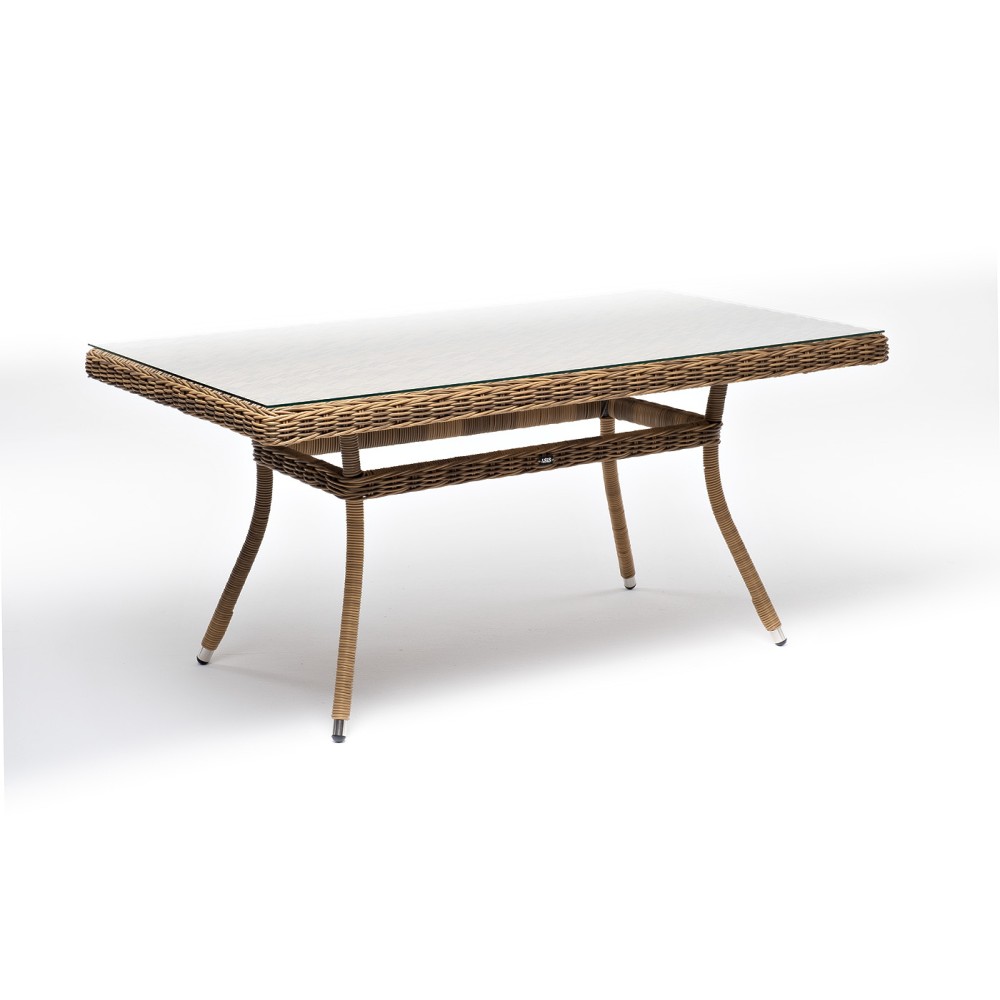 Каркас произведен из прочного алюминия, оплетка которого, выполнена вручную ротангом соломенного цвета. Поверхность защищает стеклянная столешница, толщиной 5 мм.