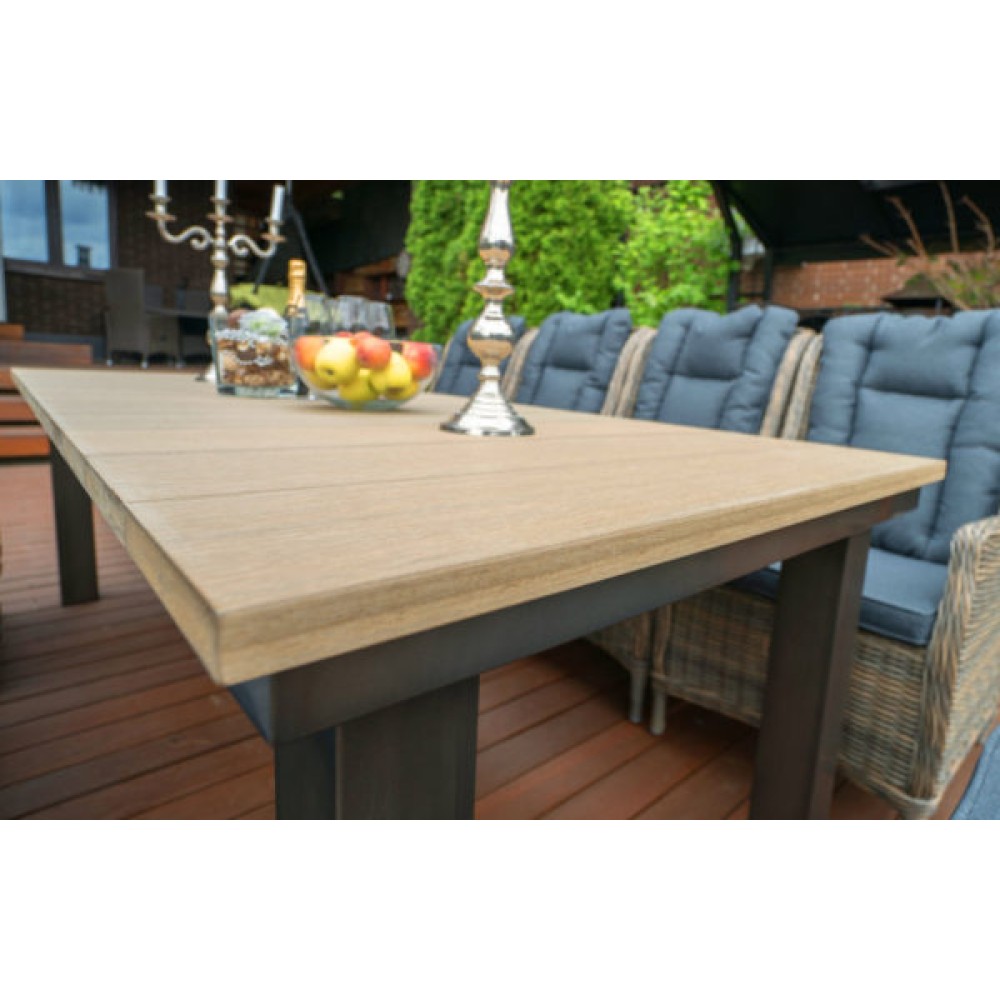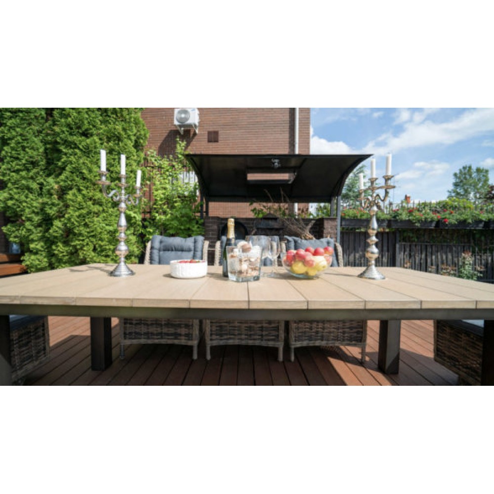 - Материал: Столешница — древесно полимерный материал с большим содержанием волокна дерева тик, каркас — нержавеющая сталь