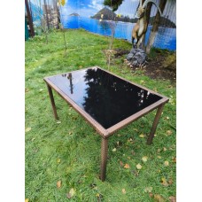 Каркас произведен из прочного алюминия, оплетка которого, выполнена вручную ротангом коричневого цвета. Поверхность защищает стеклянная столешница, толщиной 5 мм..