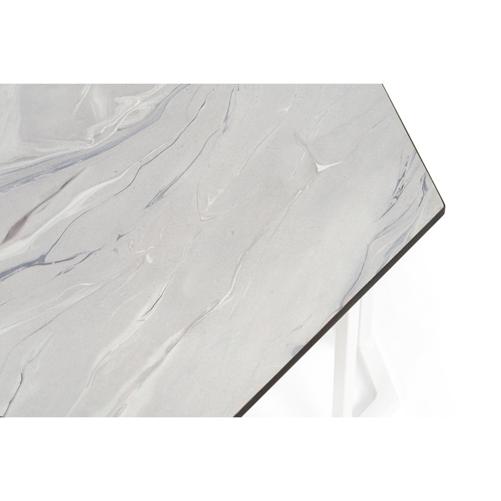 Подстолье журнального столика изготовлено из стали, окрашенной в белый цвет водостойкой порошковой краской, а столешница выполнена из качественного монолитного компакт-пластика HPL в цвете «мрамор пепел».