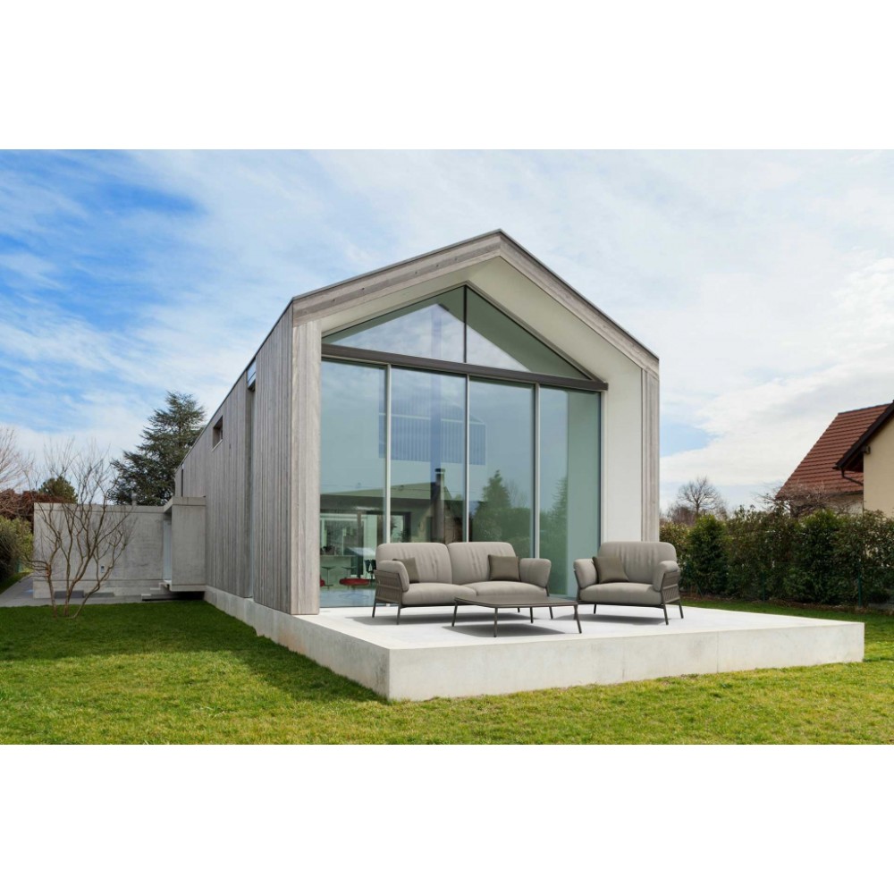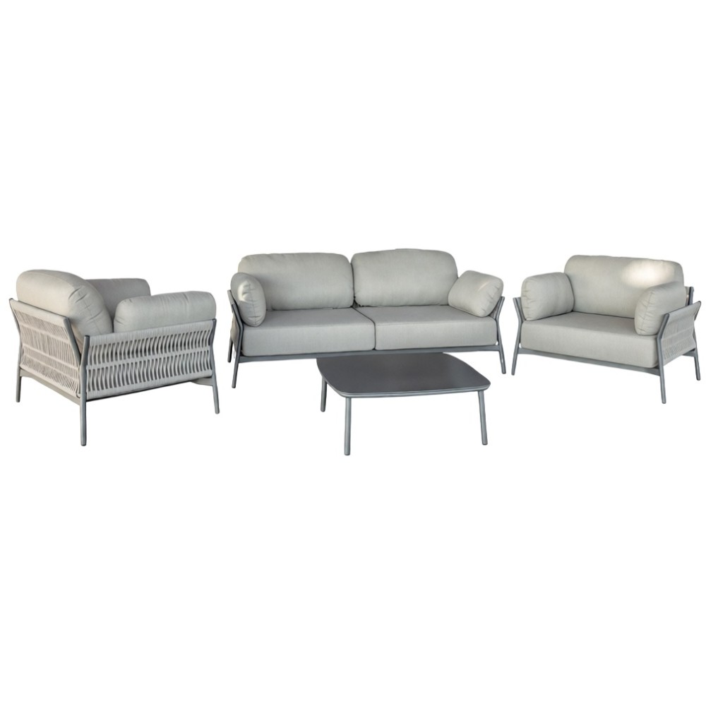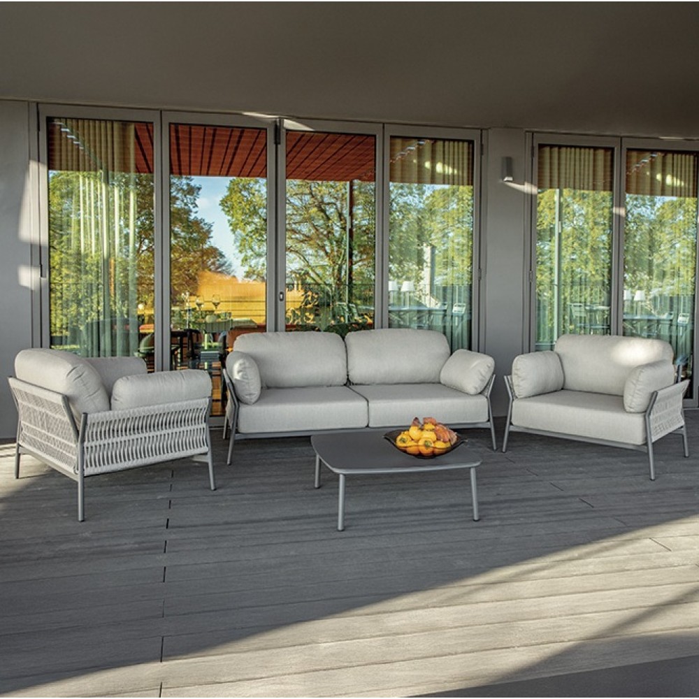 Данная продукция возится только под заказ с фабрики по предоплате. Комплект Easyсостоит из двухместного дивана, двух кресел и журнального столика. Алюминиевый каркас с порошковым покрытием делает мебель комплекта устойчивой и надежной. Подлокотники и спинки кресел и двухместного дивана оплетены акриловым канатом Ø6 мм, благодаря чему комплект выглядит стильно в любом помещении или на открытой площадке. Подушки с устойчивыми к пятнам и ультрафиолетовому излучению съемными олефиновыми чехлами обеспечивают комфортный отдых. Мягкие и интересный пересмотр промышленного стиля для создания по-настоящему уникального дизайна и комфорта. Easy - это практическое и интеллектуальное решение, которое создает идеальную гармонию в любом пространстве. Состав комплекта: Диван с подушками, размер: 1830х800х760 мм, высота сиденья: 400 мм, вес: 28 кг - 1 шт. Кресло с подушками, размер: 990х800х760 мм, высота сиденья: 400 мм, вес: 18 кг- 2 шт. Журнальный стол, размер: 800х800х300 мм, вес: 8кг - 1 шт.