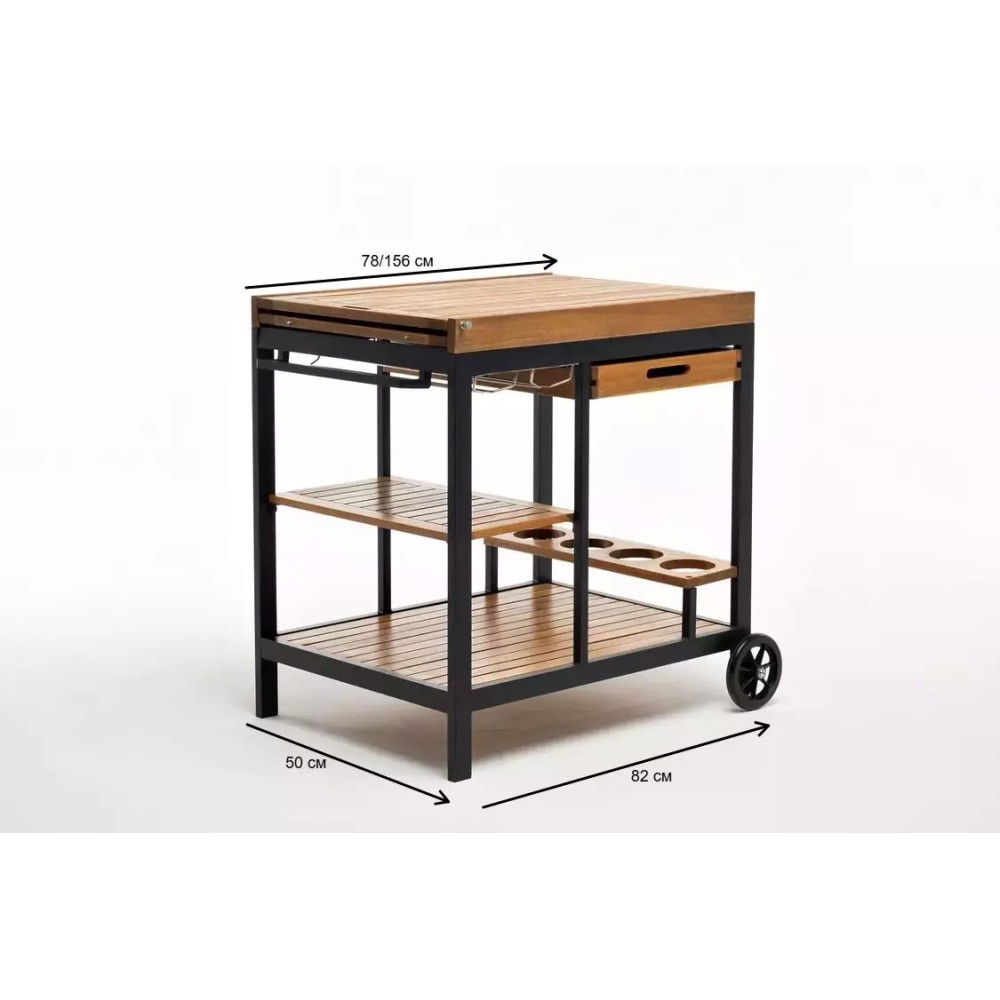 Особенности конструкции: Современный минимализм, сочетание алюминиевого каркаса и натуральной текстуры акации, раздвижной механизм для гибкого использования (от 78 до 156 см), встроенный поднос для удобной сервировки и транспортировки посуды, эргономичная высота 82 см, компактность в сложенном виде