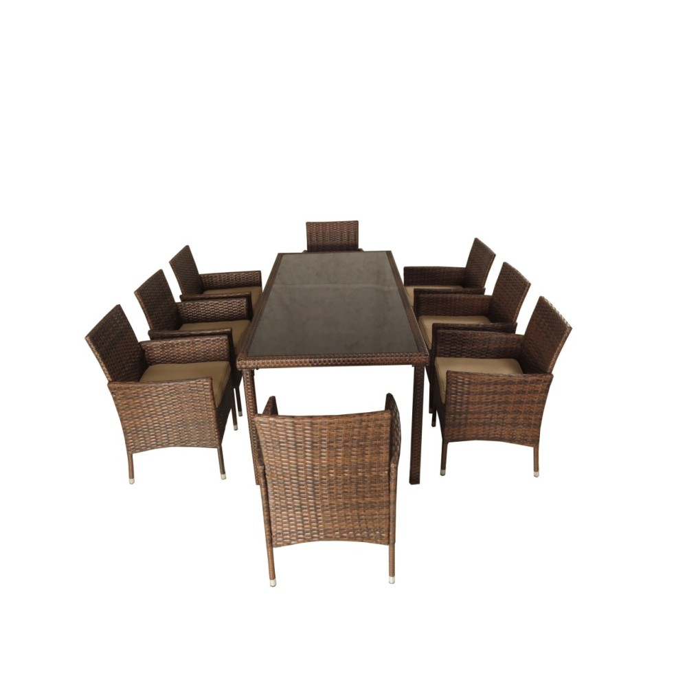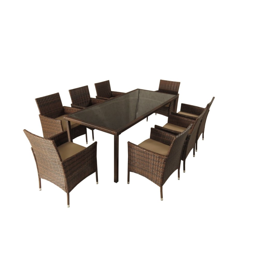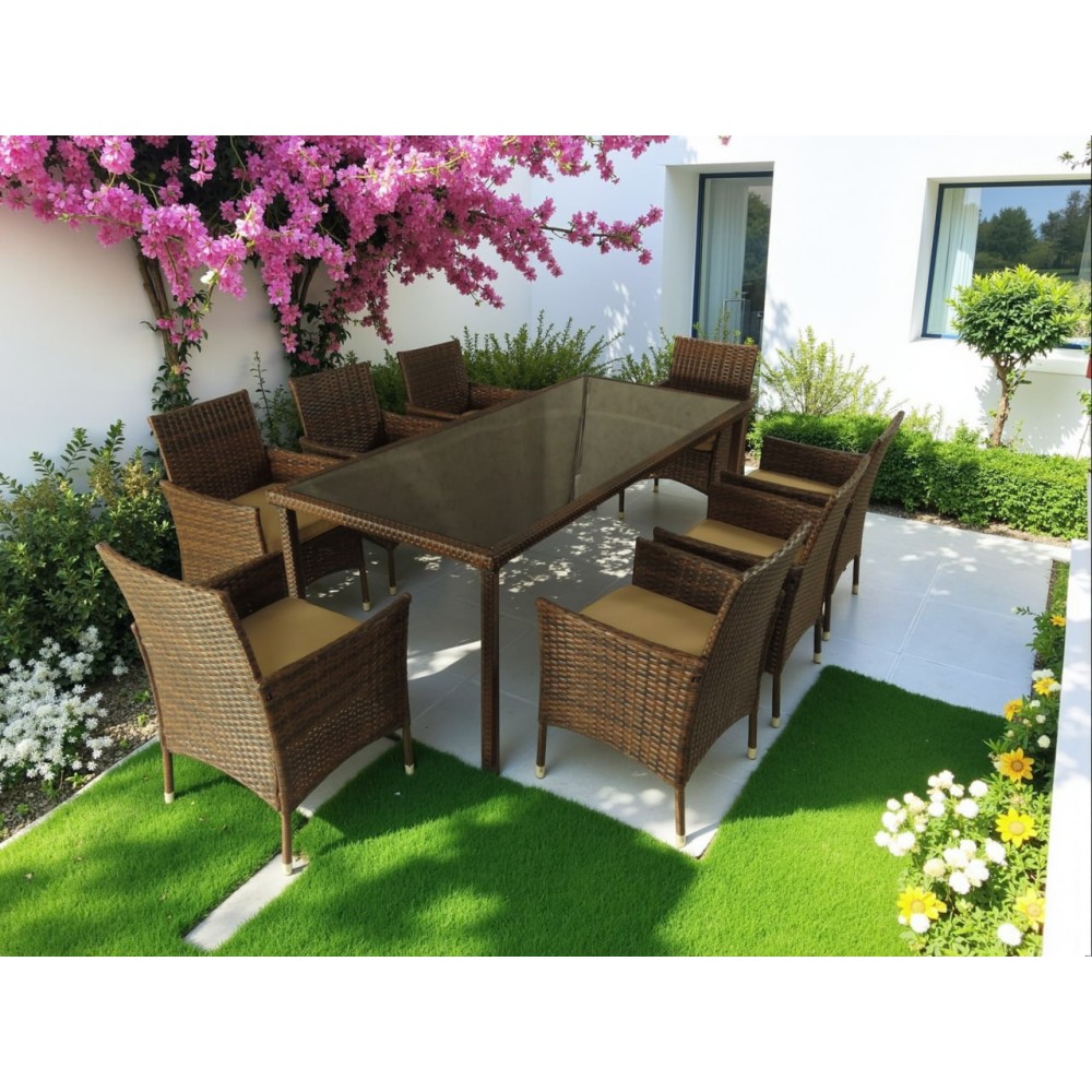 Обеденная группа из искусственного ротанга ЕГИПЕТ “EGYPT” состоит из 9 предметов – стол из искусственного ротанга + восемь кресел из искусственного ротанга, общий вес комплекта составляет 114,4 кг: 1. Кресло из ротанга – 8 штук, разборное, их габариты: ширина 62 см; высота 85 см; глубина 59 см, материал изготовления каркаса кресло из искусственного ротанга сталь, каждое кресло из ротанга укомплектовано подушками из плотной водонепроницаемой ткани Оксфорд 300 Д толщиной матраса 5 см, который ложится на сиденье, вес кресло из ротанга 8,3 кг; 2. Стол из искусственного ротанга с закаленным стеклом 6 мм – его габариты: длина 200 см; ширина 90 см; высота 74 см, материал изготовления каркаса стол из искусственного ротанга сталь, стол из ротанга укомплектован столешницей в виде закаленного 6 мм стекла, вес стола из ротанга 48 кг, стол упакован в коробку габаритами: длина 203 см; ширина 94 см; глубина 7,5 см. Производитель: Компания “Мир Дачника”