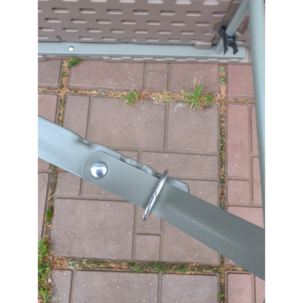 Практичный дизайн. Предохранительный штифт под столешницей может выдерживать большую нагрузку. Синий двойной замок обеспечивает устойчивость после открытия. Черная пряжка с двойной фиксацией обеспечивает застегивание после складывания. Встроенная резиновая заглушка позволяет безопасно использовать столы на домашних полах.