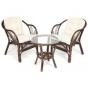 Комплектация: стол, 2 кресла.Размеры (см):Стол: диаметр - 54, высота - 50,Кресло: ширина - 60, глубина - 57, высота - 79.Цвет:коньяк, мед, олива, темный коньяк, подушка - бежевая.Материалы:Каркас - натуральный ротанг, подушка - ткань рогожка с м..