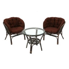 Комплектация: стол, 2 кресла и диван. Размеры (см): Стол: диаметр - 60, высота: - 51,5; Кресло: ширина - 65, глубина - 53, высота - 72; Диван: ширина - 11,3, глубина - 53, высота - 72. Цвет: темный коньяк, подушка - темная клетка. Материалы: ..
