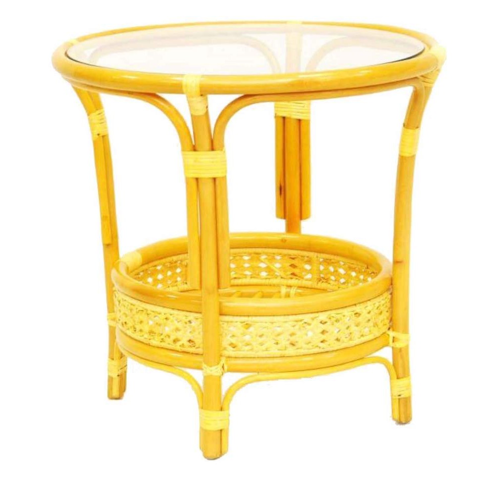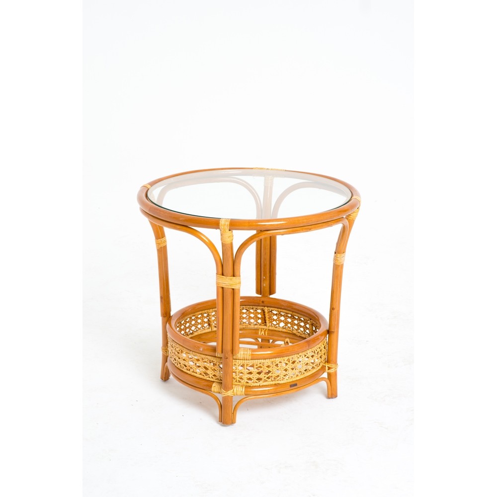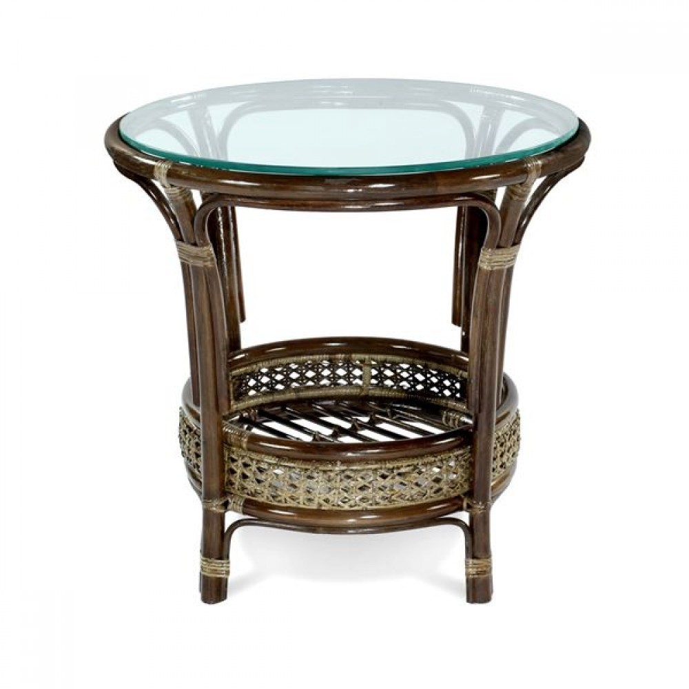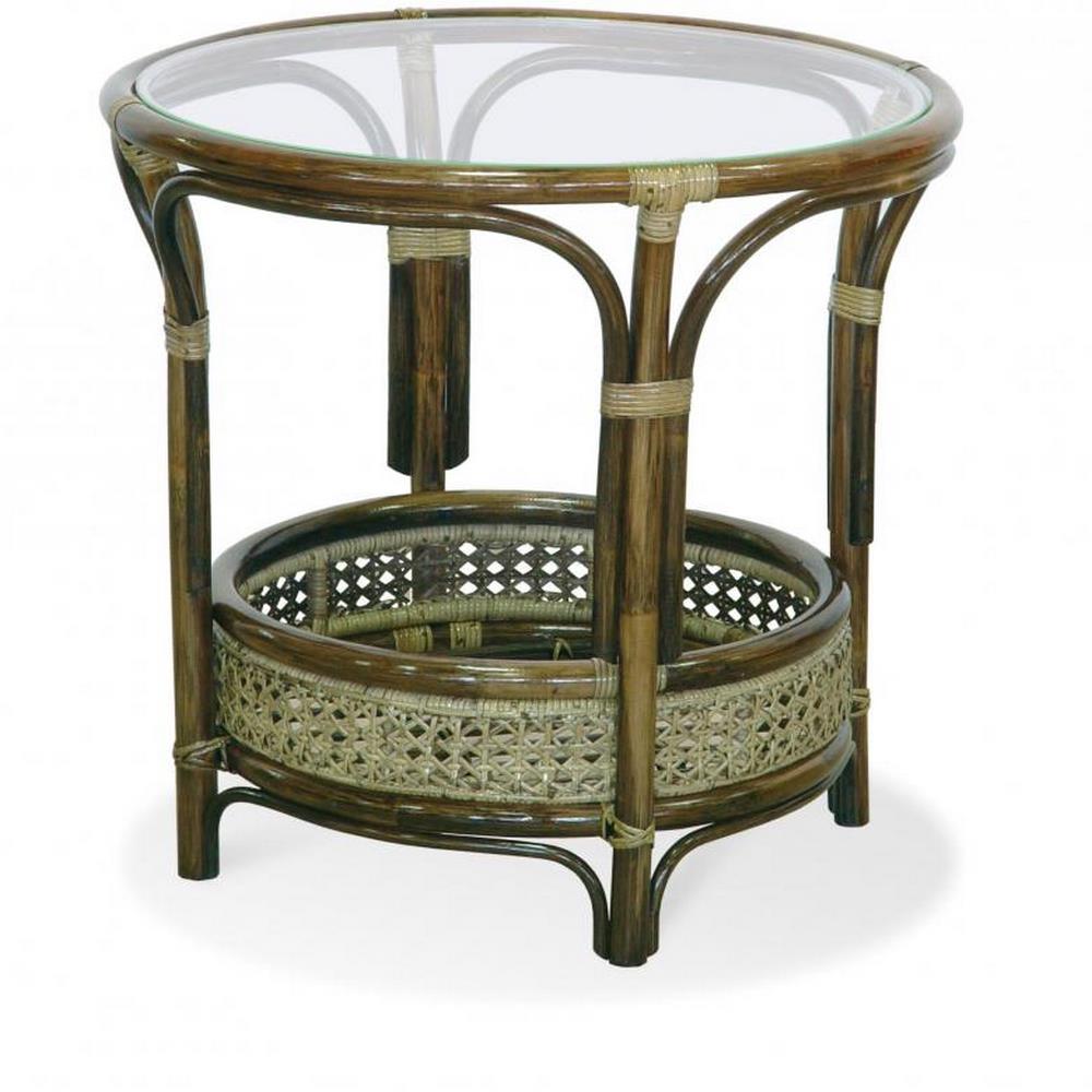 Каркас - натуральный ротанг, подушка - ткань рогожка с мягким наполнителем, столешница - стекло.