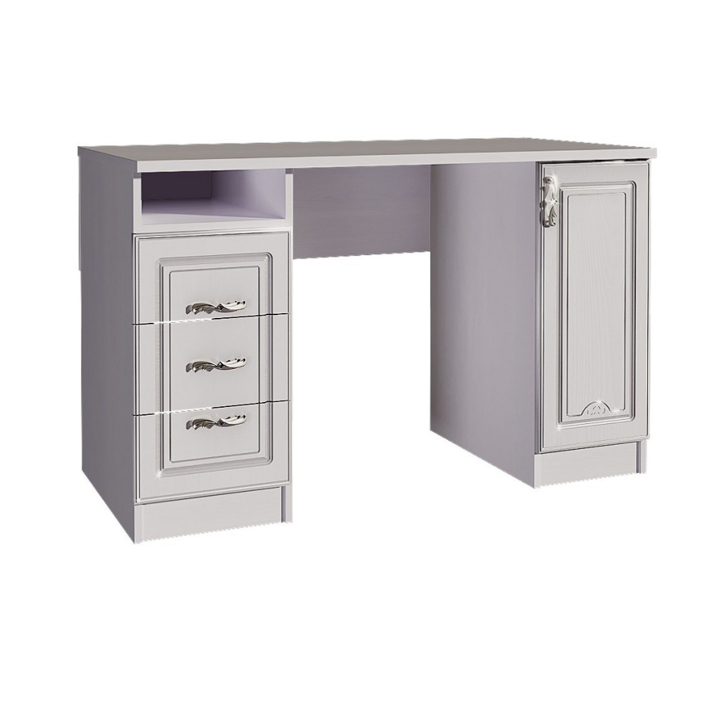 Письменный стол из коллекции Мелания позволит организовать удобное и красивое рабочее место для маленькой хозяйки комнаты. Изысканный дизайн с утонченным оформлением придется по душе моднице в любом возрасте — элегантная классика всегда будет актуальна.Длинная и широкая столешница позволит грамотно разместить компьютер и оставить достаточное рабочее место для учебы или творчества. А встроенные боковые тумбы с обеих сторон — правильно организовать хранение.В секции с тремя выдвижными ящиками можно расположить канцтовары, письменные и школьные принадлежности. Вместительная глубокая тумба с двумя полками станет незаменимой для учебников или размещения системного блока.