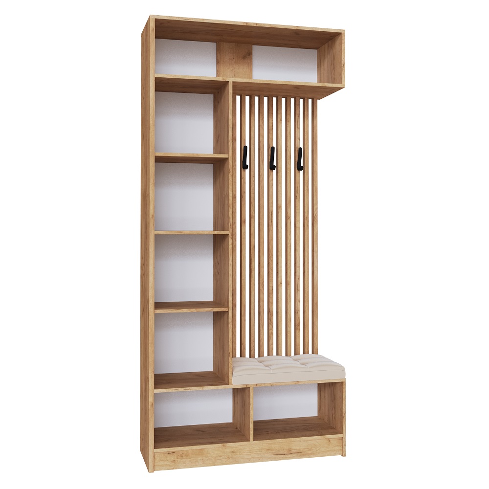 Благодаря стильному дизайну и компактным размерам вешалка Руэлла впишется в малогабаритную прихожую или квартиру-студию. Наличие полок, надежные крючки и ниша под обувь позволят разместить верхнюю одежду, уличную и домашнюю обувь, сезонные аксессуары и головные уборы, а наличие мягкого сидения добавит комфорта от ежедневных сборов перед выходом на улицу.