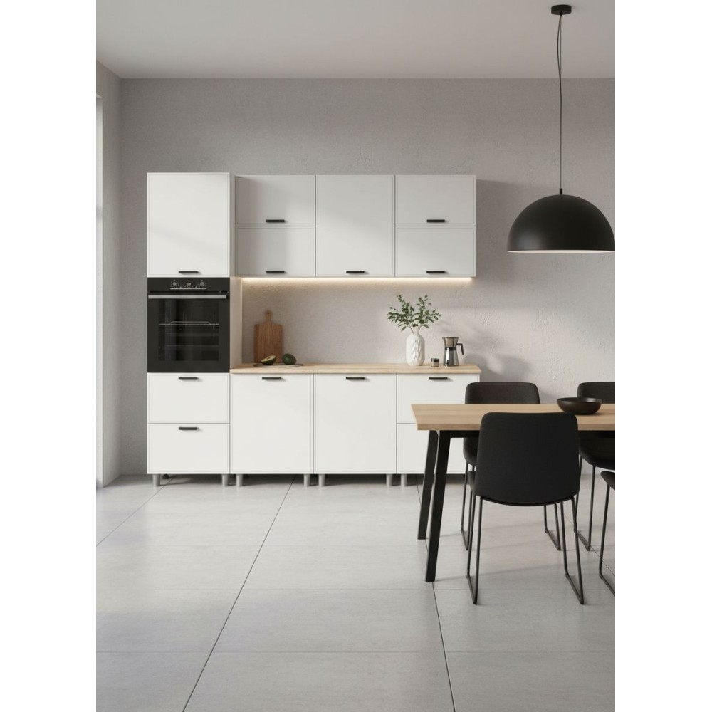 Тонкое фрезерованное обрамление по периметру фасада создаёт чёткую геометрию, подчёркивая формы и придавая кухне элегантность и легкость. Такой минималистичный подход – один из главных трендов 2025 года.