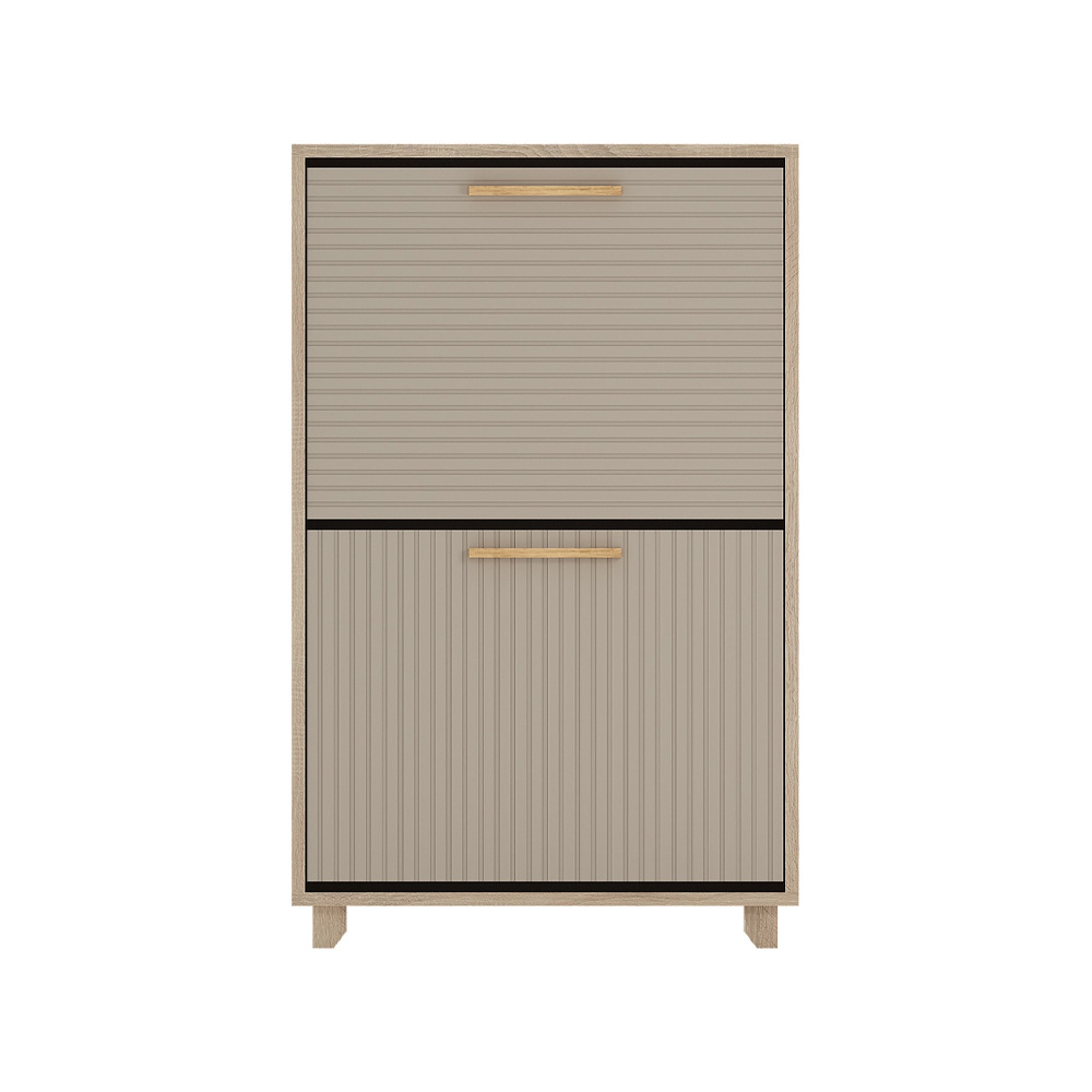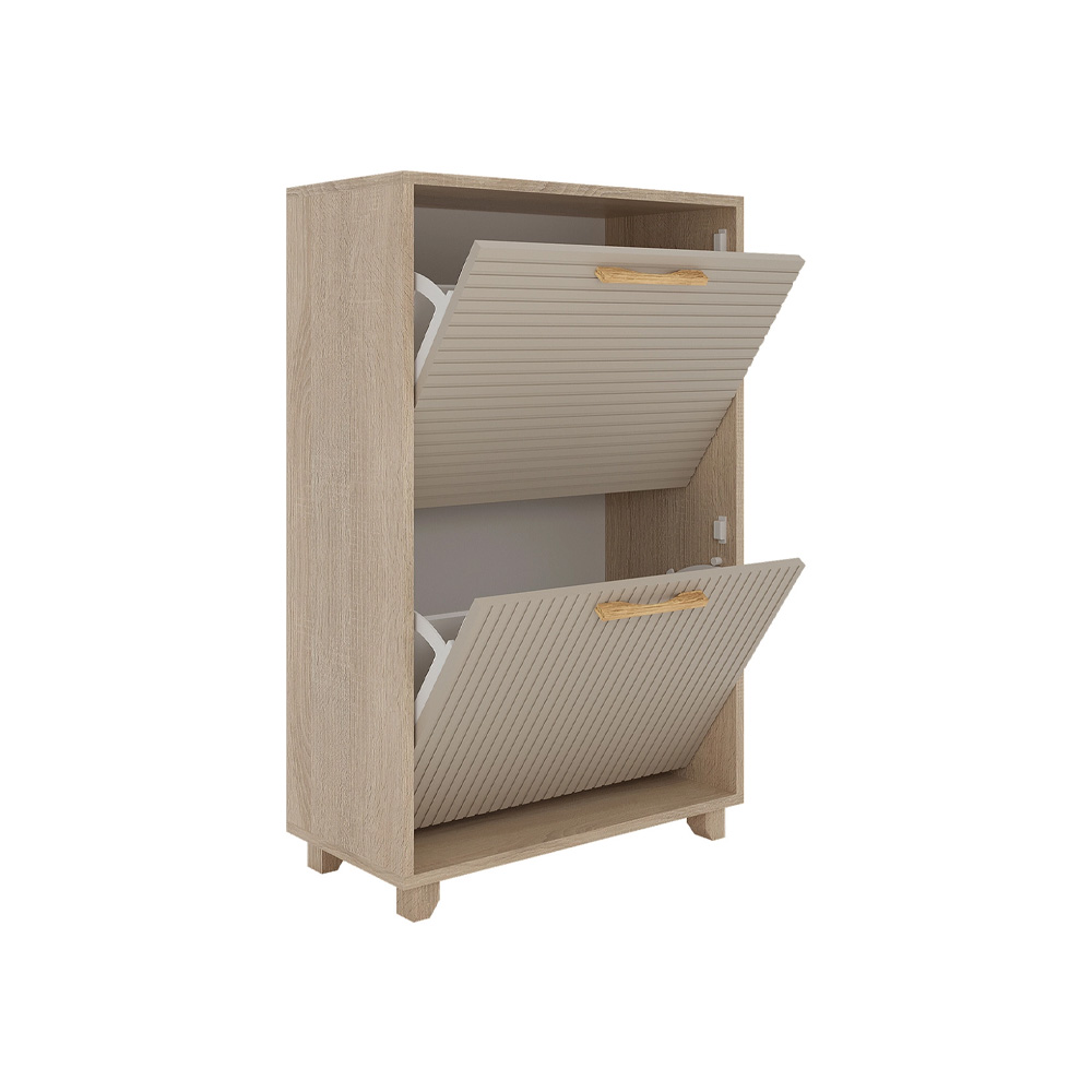 Закрытая обувница имеет 2 отделения для обуви за откидными дверями. В каждом из них есть разделитель.
