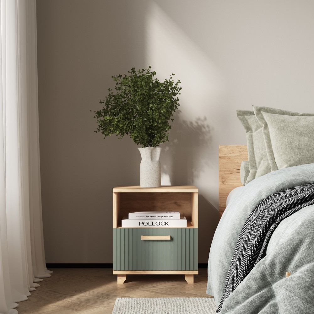 Ньёрд Тумба прикроватная 1я Дуб вотан — функциональный элемент спальни, предназначенный для хранения личных вещей и мелочей, которые должны быть под рукой во время отдыха. Компактный формат позволяет удобно разместить тумбу рядом с кроватью, не перегружая пространство. Поверхность подходит для размещения светильника, книги или мобильных аксессуаров. Модель гармонично дополняет интерьер и поддерживает порядок в зоне сна.
