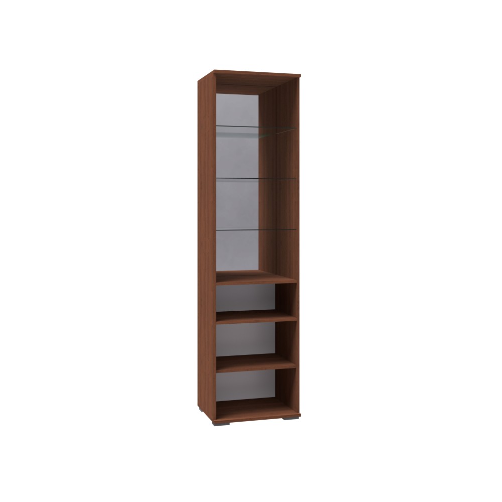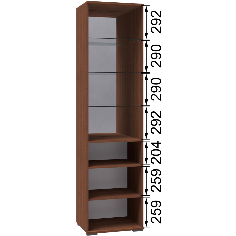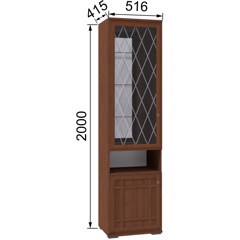 Шкаф-пенал «Ричард», выполненный в единой стилистике коллекции, представляет собой высокий и компактный шкаф с двумя распашными дверцами, расположенными одна над другой. В верхнем отделении, закрытом витринной дверью с декоративным гравированным стеклом, размещены три стеклянные полки, а зеркальная задняя стенка визуально расширяет пространство и усиливает эффект лёгкости. Ниже предусмотрена открытая ниша, удобная для хранения предметов, к которым требуется быстрый доступ. В нижней части шкафа за глухой распашной дверью скрыты ещё две полки для аккуратного размещения вещей.