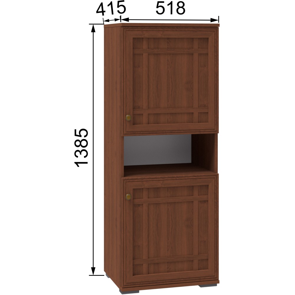 Шкаф-пенал «Ричард», выполненный в едином стиле всей коллекции, представляет собой компактный и функциональный шкаф с пятью полками. Конструкция с двумя распашными дверцами, размещёнными одна над другой, предусматривает открытую нишу между ними. Такое решение позволяет удобно хранить предметы повседневного пользования или использовать пространство для размещения декоративных аксессуаров, подчёркивающих индивидуальность интерьера.
