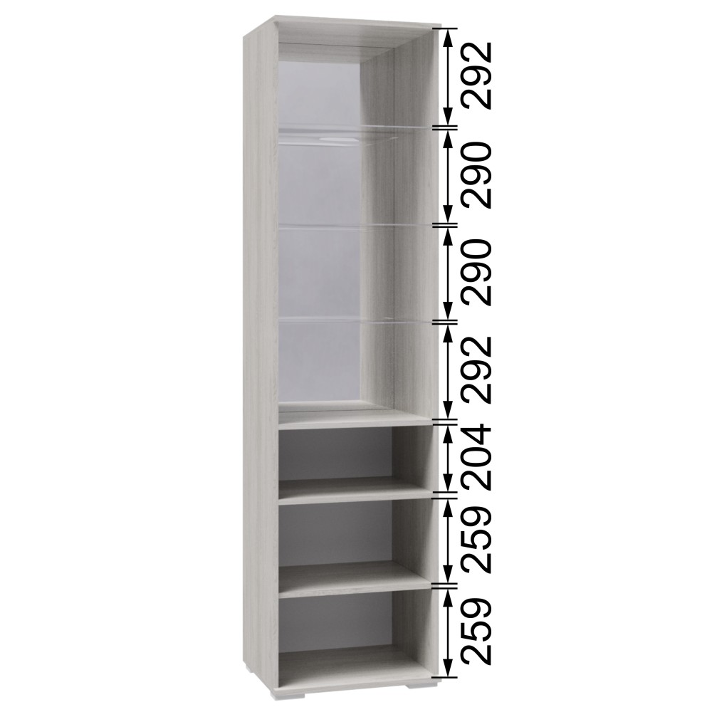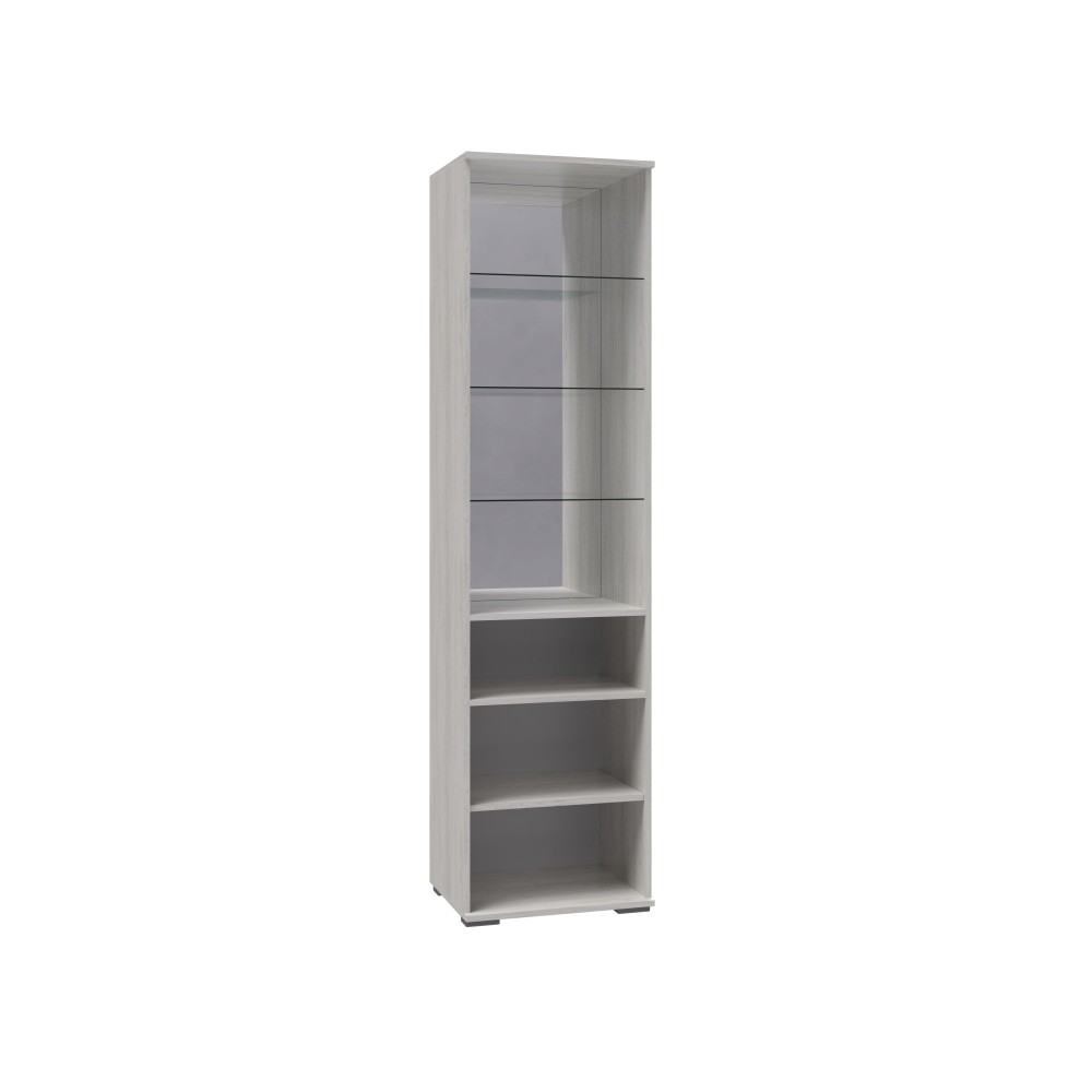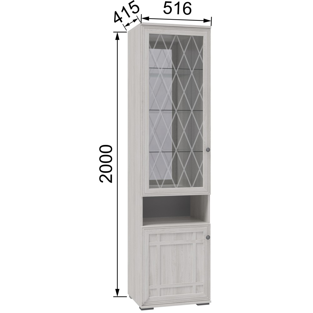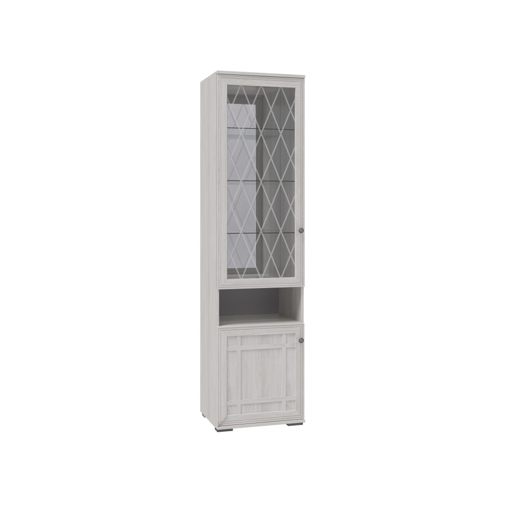Шкаф-пенал «Ричард», выполненный в единой стилистике коллекции, представляет собой высокий и компактный шкаф с двумя распашными дверцами, расположенными одна над другой. В верхнем отделении, закрытом витринной дверью с декоративным гравированным стеклом, размещены три стеклянные полки, а зеркальная задняя стенка визуально расширяет пространство и усиливает эффект лёгкости. Ниже предусмотрена открытая ниша, удобная для хранения предметов, к которым требуется быстрый доступ. В нижней части шкафа за глухой распашной дверью скрыты ещё две полки для аккуратного размещения вещей.